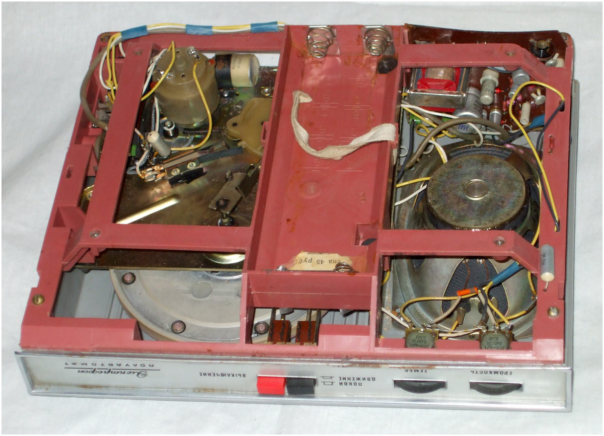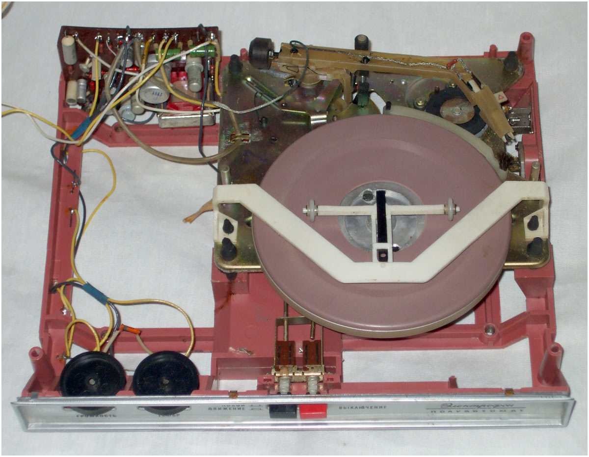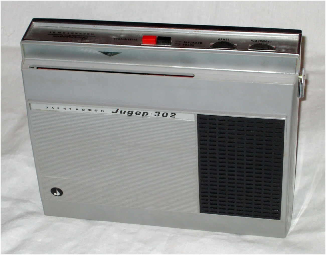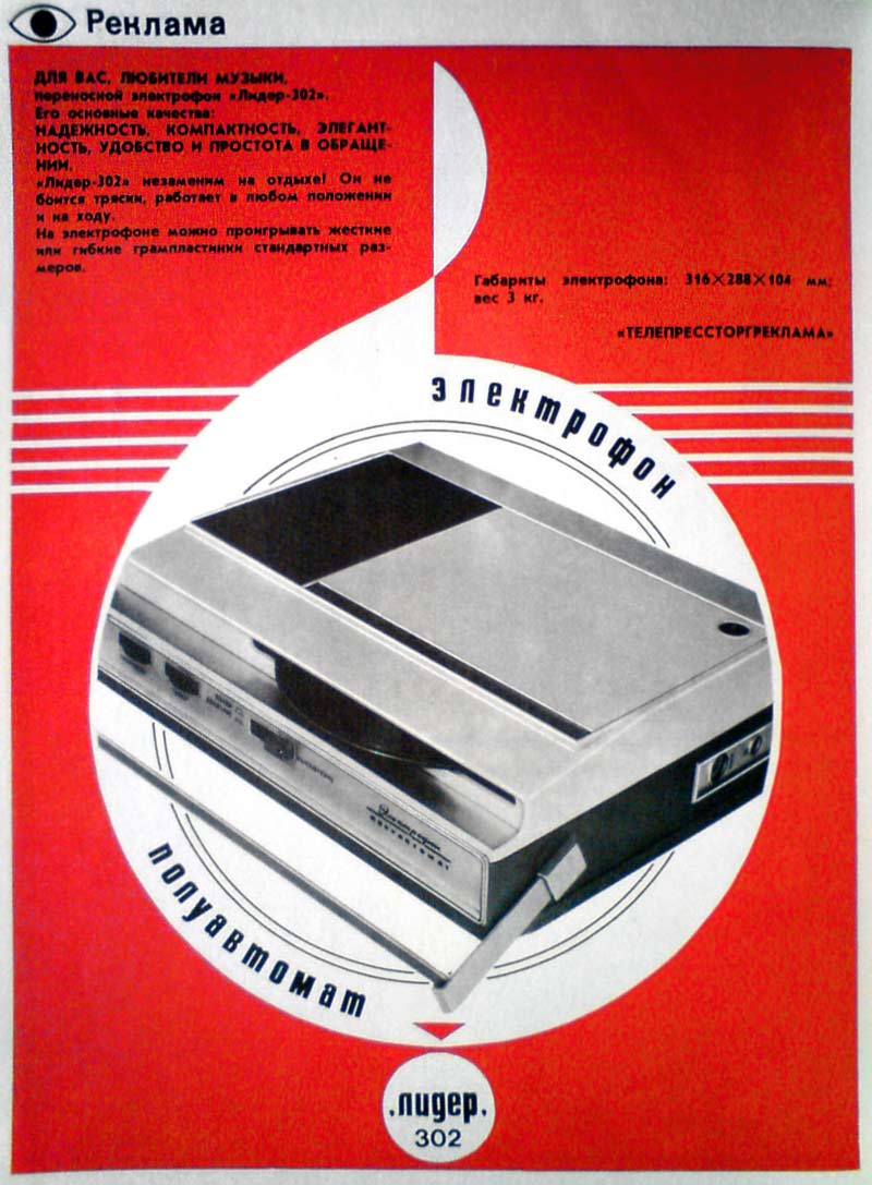 Электрофоны портативные *Лидер-302* и *Рогнеда-302* с 1970 года выпускал Саратовский завод точной электромеханики. Переносные электрофоны 3-го класса **Лидер-302** и **Рогнеда-302** рассчитаны на полуавтоматическое проигрывание грампластинок, диаметром 175 мм в стационаре при умеренном движении. Любой электрофон состоит из электропроигрывателя и усилителя НЧ на транзисторах. Усилитель имеет чувствительность - 250 мВ, номинальную выходную мощность 0,5 Вт. В электрофонах применён громкоговоритель типа 1ГД-28. Полоса воспроизводимых звуковых частот 150...7000 Гц. Двигатель ДРВ-0,1 применённый в старой модели электрофона **Рогнеда** заменен на новый ДЛФ-1. Скорость вращения диска 33 об/мин. Питание электрофонов осуществляется от шести элементов А-373, потребляемая мощность не превышает 2 Вт. Размеры электрофона - 316х288х104 мм, масса - 2,7 кг. Конструкция, электрическая схема и внешний вид моделей одинакова. В двух наименованиях электрофоны выпускали для расширения ассортимента продукции.