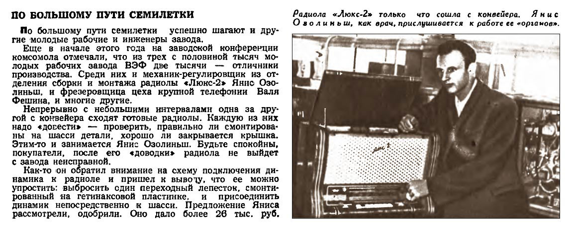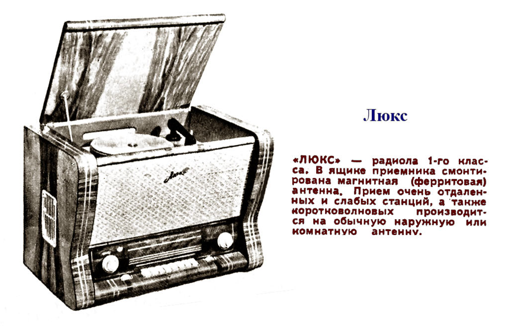 Радиолы *Люкс* и *Люкс-2* с 1956 и с 1958 года выпускались Рижским заводом *ВЭФ*. **Люкс** (РК-156) - это 11-ламповый супергетеродинный АМ-ЧМ приёмник, совмещённый с универсальном ЭПУ. В радиоле шесть диапазонов, встроенные поворотная магнитная антенна и УКВ диполь, клавишный переключатель диапазонов, индикатор точной настройки, автоматическая регулировка усиления, раздельная плавная регулировка тембров, плавная регулировка полосы ПЧ. АС радиолы состоит из двух широкополосных громкоговорителей 5ГД-14, расположенных на передней панели и двух высокочастотных 1ГД-9, расположенных на боковых стенках. Универсальное ЭПУ с асинхронным электродвигателем и приводом на 33 и 78 об/мин, с полуавтоматическим включением и автоматическим выключением имеет пьезокерамический звукосниматель на две корундовые иглы для обычных и долгоиграющих пластинок со сроком службы по 200 часов. Корпус радиолы отделан под ценные породы древесины и полирован. Шкала имеет градуировку в метрах. В радиоле есть гнёзда для подключения наружной антенны, заземления, наружной УКВ антенны, внешнего громкоговорителя и адаптера. Шасси узлы и детали унифицированные, малогабаритные, в последующем они были приняты для производства различных радиол и приёмников рядом радиозаводов. Габариты радиолы 625х450х365 мм. Вес 27 кг. Питание от сети переменного тока в 110, 127 или 220 В. Потребляемая мощность 85 и 100 Вт. Диапазоны частот: ДВ 150...410 кГц, СВ 520...1600 кГц, КВI 9,4...13,0 МГц, КВII 5,2...7,5 МГц, КВIII 3,95...5,5 МГц, УКВ 64,5...73 МГц. ПЧ по АМ тракту 465 кГц, по ЧМ тракту 8,4МГц. Чувствительность на ДВ, СВ, КВ - 50 мкВ, УКВ 10 мкВ. Избирательность по соседнему каналу 56 и 30 дБ. Номинальная выходная мощность 6, максимальная 11 Вт. Полоса воспроизводимых звуковых частот в диапазонах АМ - 60...6500 Гц, ЧМ - 60...12000 Гц, при работе ЭПУ - 70...7000 Гц. В 1958 году радиола модернизирована в модель **Люкс-2**. Оформление радиолы осталось прежним. Была усовершенствована электрическая схема, скорректированы КВ поддиапазоны, диапазон воспроизводимых частот расширился до 50...13000 Гц в диапазоне УКВ-ЧМ и до 60...10000 Гц при работе ЭПУ.