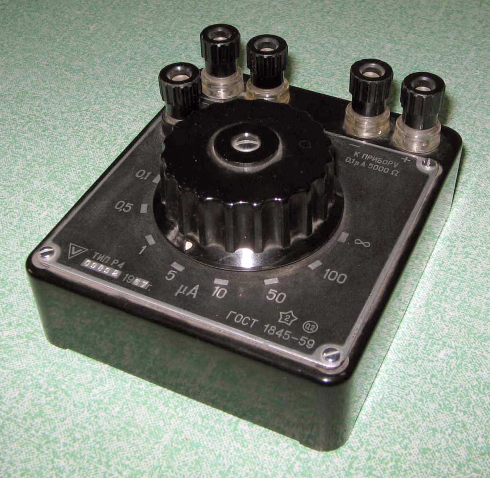 Микроамперметр *М-95* с комбинированным шунтом *Р-4* выпускался с 1967 года. Представляет собой переносной лабораторный двухпредельный по току и однопредельный по напряжению прибор, предназначенный для измерения очень малых величин тока и напряжения в цепях постоянного тока. Класс точности: 1,0. Педел измерения 0,1; 1 и 10 микроампер. Габариты *М-95* - 213х122х270 мм. Вес 3,6 кг. Габариты *Р-4* - 126х110х62 мм. Вес 0,6 кг. Длина шкалы 140мм.