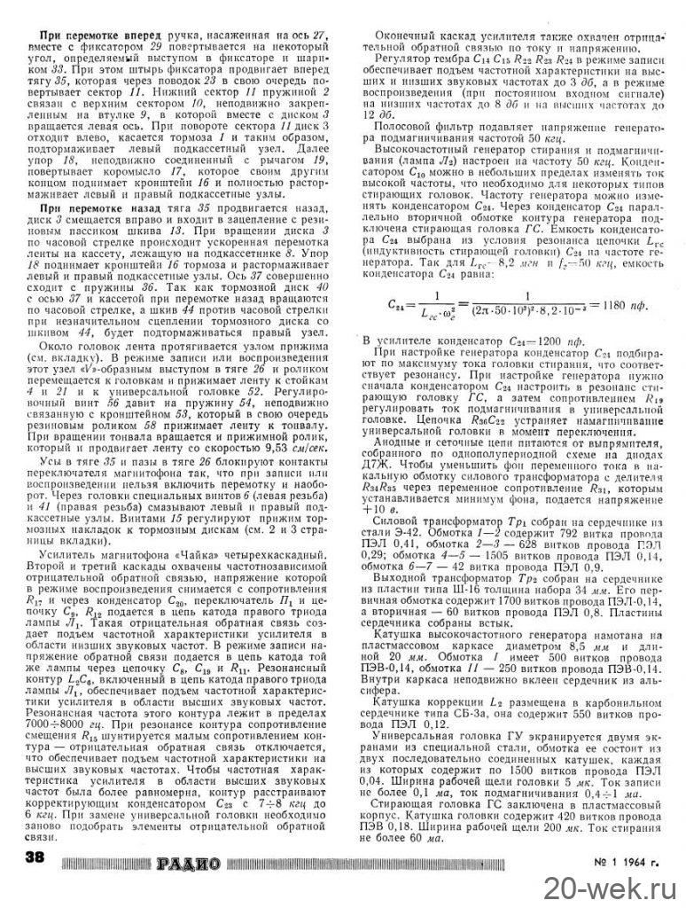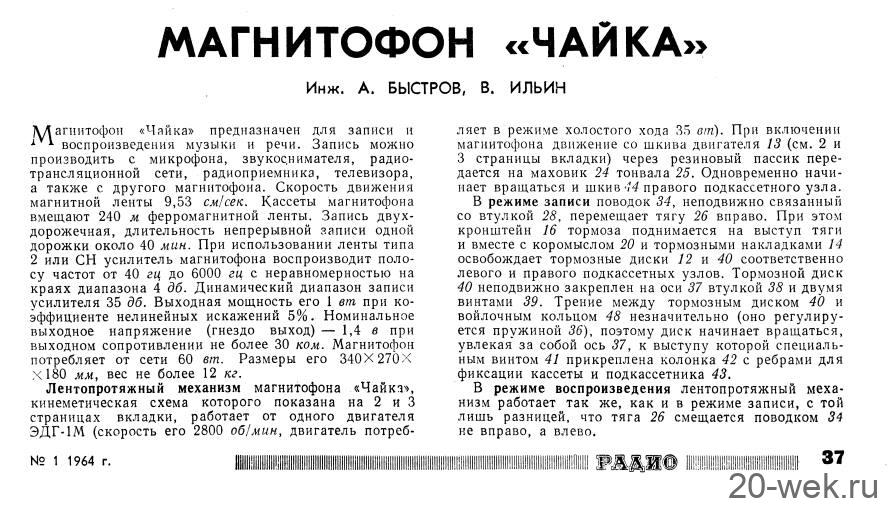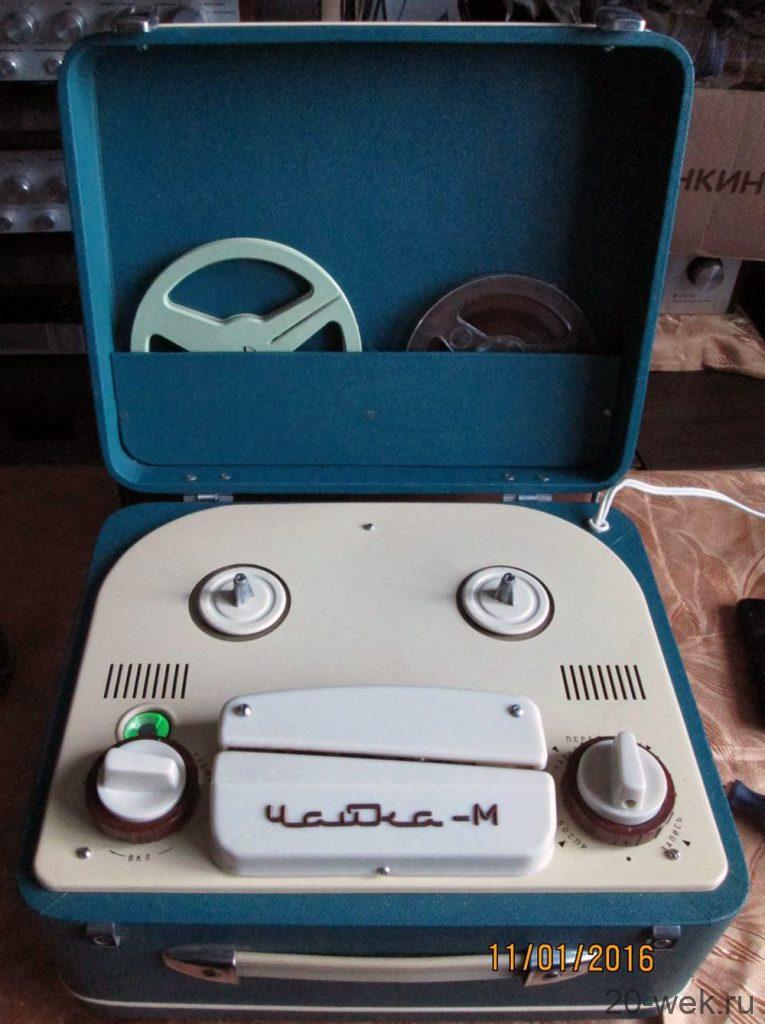 Магнитофоны "Чайка" и "Чайка-М" выпускал с 1960 и 1964 года Великолукский радиозавод. ''Чайка'' - модернизация модели "Чайка" 1956 года. Он служит для записи и воспроизведения фонограмм. Скорость 9,53 см/сек. Катушки вмещают 240 м. магнитной ленты. Запись 2-х дорожечная, длительность записи 40 мин. При использовании ленты типа 2 или СН полоса рабочих частот 40...6000 Гц. Номинальная выходная мощность 1 Вт. В магнитофоне применены 4 радиолампы. Корпус из гнутой фанеры, облицован синтетическим пластиком. Потребляемая мощность 60 Вт. Габариты модели 340х270х180 мм, вес 12 кг. Магнитофон ''Чайка-М'' имеет отличия в схеме и конструкции. На ленте типа 2 или СН полоса частот 40...10000 Гц. Потребляемая от сети мощность 75 Вт. Радио №1/1964 Доработка Радио №1/1966, ст.42