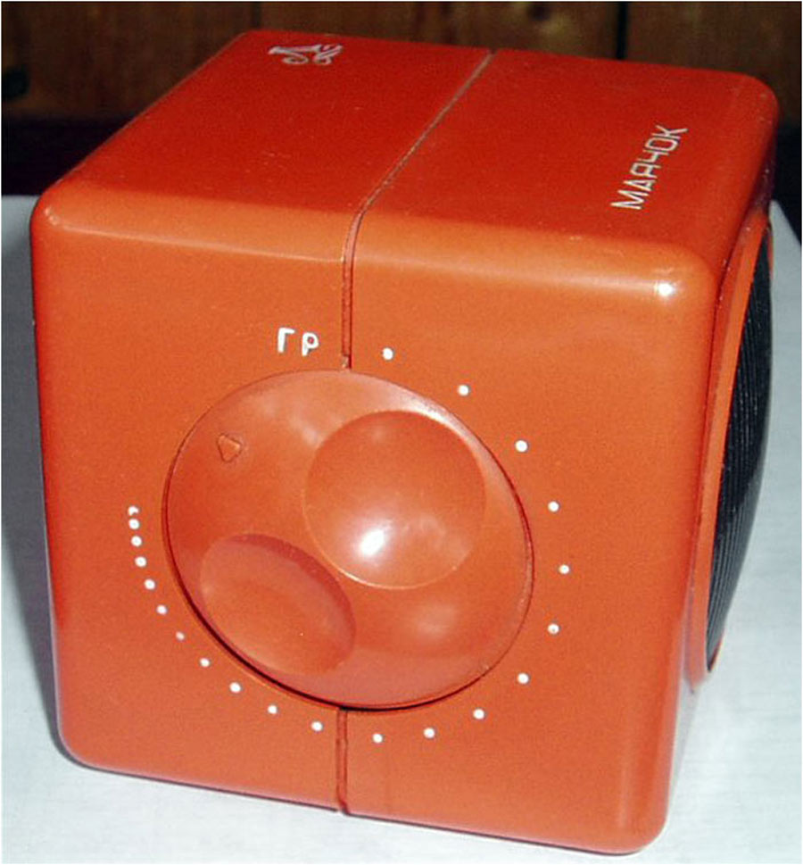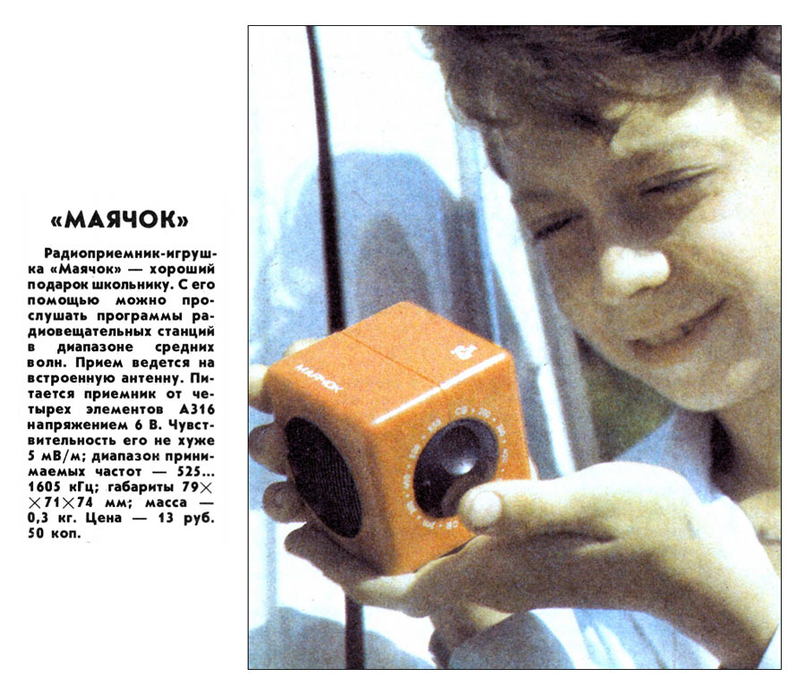 Детский радиоприемник-игрушка *Маячок* с 1988 года выпускал Ленинградский завод *Магнетон*. С помощью радиоприёмника **Маячок** можно прослушивать программы вещательных радиостанций в диапазоне СВ. Приём производится на встроенную магнитную антенну. Радиоприёмник собран по супергетеродинной схеме на многофункциональной микросхеме. Питание от четырёх элементов А-316. Чувствительность приёмника 5 мВ/м. Односигнальная селективность 30 дБ. Номинальная выходная мощность 100 мВт. Диапазон воспроизводимых звуковых частот 450...2800 Гц. Габариты радиоприёмника 79х71х74 мм. Масса 300 гр.