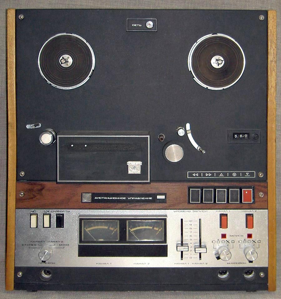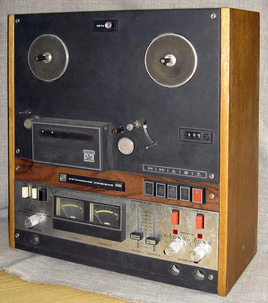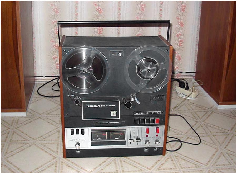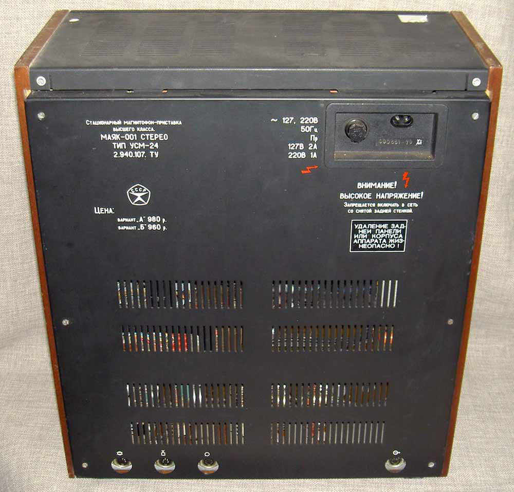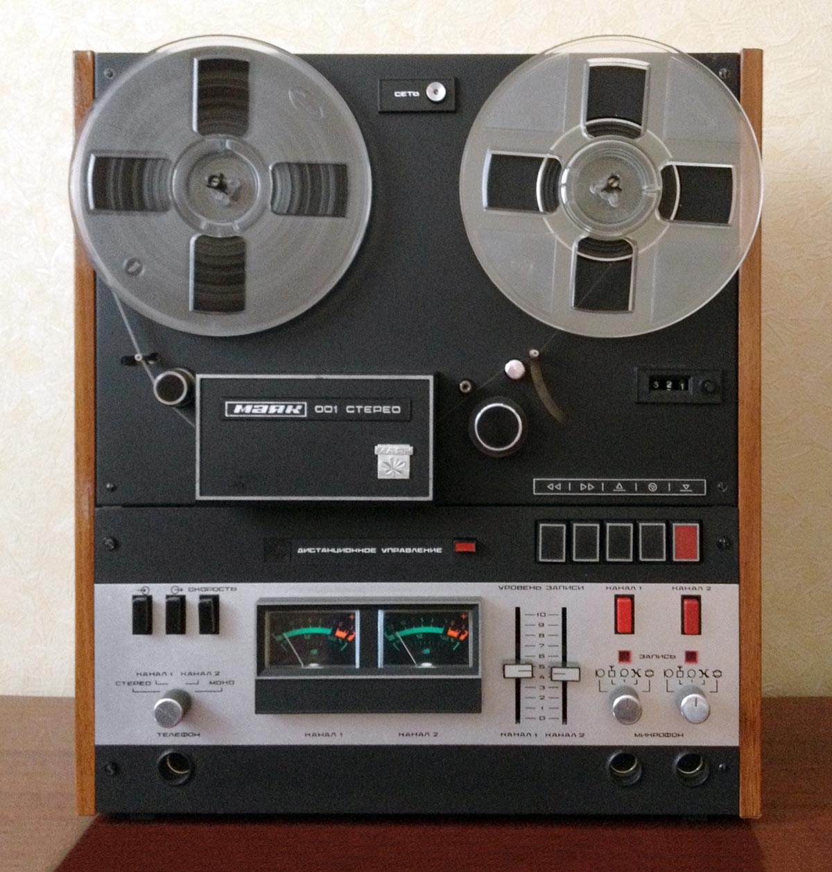 Сетевая катушечная магнитофон-приставка *Маяк-001-стерео* с начала 1973 года выпускалась Киевским заводом *Маяк*. МП обеспечивает запись и воспроизведение моно и стереофонических фонограмм. Возможна многократная перезапись с одной дорожки на другую, с наложением новой записи на имеющуюся и синхронная запись по разным входам. Есть контроль записи на стереотелефоны и индикация уровней по стрелочными индикаторам при движущейся или неподвижной магнитной ленте. Имеется возможность ДУ всеми режимами ЛПМ, а наличие счётчика метража ленты и автостопа увеличивает возможности аппарата. В МП две скорости протяжки ленты: 19,05 и 9,53 см/сек. Диапазон частот на ЛВ на высшей скорости 31,5...20000 Гц. На низшей скорости 31,5...16000 Гц. Коэффициент детонации ЛПМ соответственно 0,1 и 0,2%. Габариты МП - 425х460х200 мм, масса 20 кг. Вес пульта для управления 300 грамм. В 1980 году у магнитофона-приствки были улучшены технические параметры и ей был присвоен знак качества.