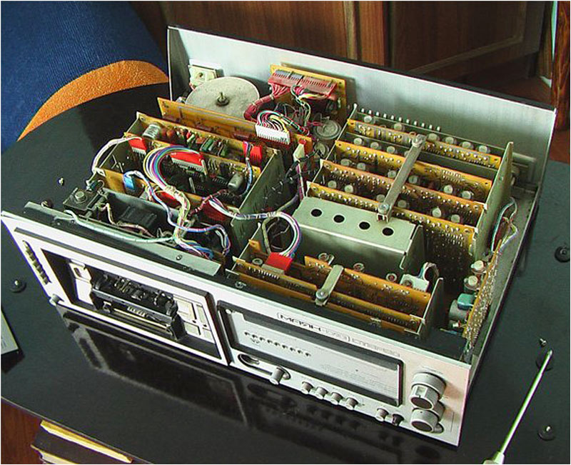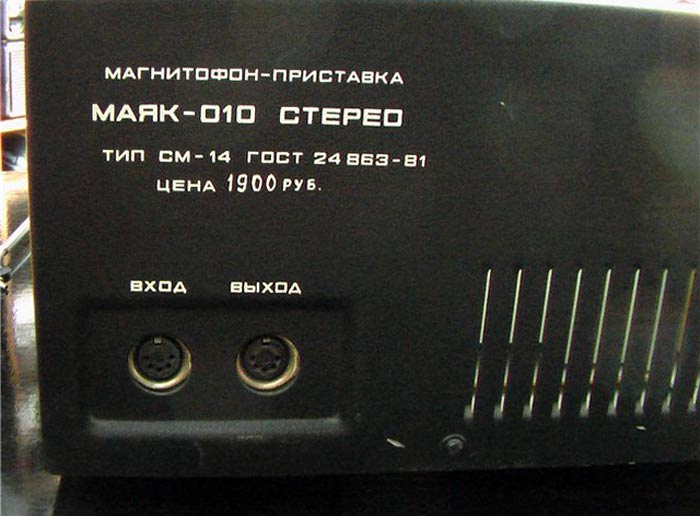 Магнитофон-приставка *Маяк-010-стерео* с I-кв 1983 года выпускалась Киевским заводом *Маяк*. Магнитофон-приставка **Маяк-010 стерео** предназначен для высококачественной записи и воспроизведения моно и стереофонических музыкальных и речевых программ на магнитных лентах А4212-3Б и А4205-3, размещенных в кассетах МК-60/90. МП предназначен для совместной работы с внешним усилителем или УКУ с АС и обеспечивает запись с микрофона, пьезоэлектрического звукоснимателя, радиоприёмника, другого магнитофона, телевизора; воспроизведение записей; стирание записи; перемотку ленты; индикацию уровня записи с возможностью раздельного и синхронного регулирования; автоматический останов по окончании ленты; временный стоп; подключение стереотелефонов; электронный счетчик расхода ленты; компандерную систему шумопонижения. МП обеспечивает функции: микширование сигналов с микрофонного и основного входов; возможность применения двух типов магнитных лент А4205-3 Fe; А4212-3Б Сг; индикацию уровня записи средних и пиковых значений люминесцентным индикатором; контроль уровня воспроизведения; контроль записываемого или записанного сигнала на ЛВ; регулировку уровня громкости на стереотелефонах; запись паузы на движущейся ленте (Редактор); автоматическую подстройку записи по токам записи и подмагничивания; световую индикацию включения в сеть; световую индикацию режимов работы ЛПМ; работу с внешним таймерным устройством; работу со встроенным таймером осуществляющим: индикацию текущего времени; коррекцию времени; измерение временных интервалов; выключение магнитофона по заданному времени; работу магнитофона в заданном интервале времени; беспроводное инфракрасное ДУ режимами ЛПМ; кварцевую стабилизацию скорости движения магнитной ленты; квазисенсорное управление режимами ЛПМ; возможность работы с лентами толщиной 9 и 12 мкм; возможность работы ЛПМ в режиме Память по электронному счетчику; работа ЛПМ в автоматическом режиме. Питается приставка от сети. Потребляемая от сети мощность 55 ВА. Коэффициент детонации ±0,15%. Диапазон частот на ЛВ: 40...14000 Гц с лентой А4206-3 и 31,5...18000 Гц с А4213-3Б. Коэффициент гармоник на ЛВ 1,5%. Относительный уровень шумов и помех в канале записи-воспроизведения -58 дБ, с компандерной системой ШП -80 дБ. Чувствительность основного входа 200 мВ, микрофона 0,08 мВ. Напряжение ЛВ - 500 мВ. Габариты МП - 460x340х150 мм. Масса МП - 10 кг.