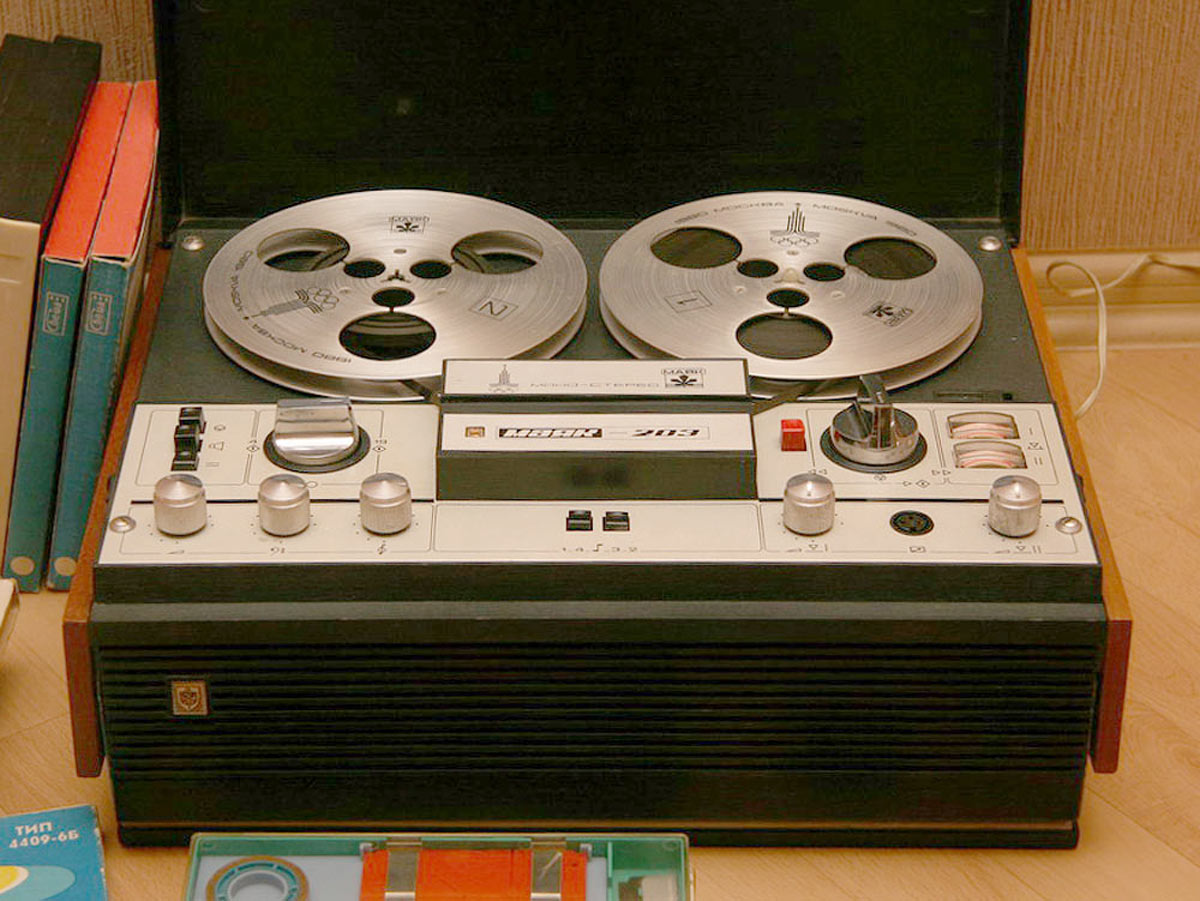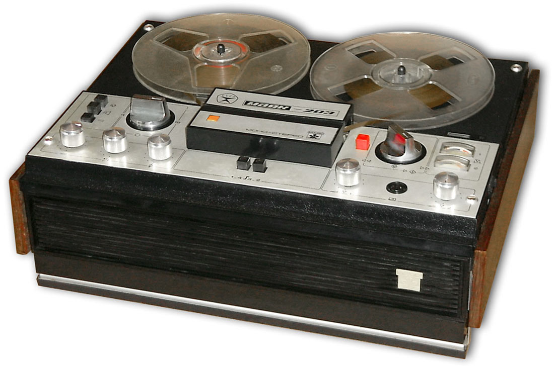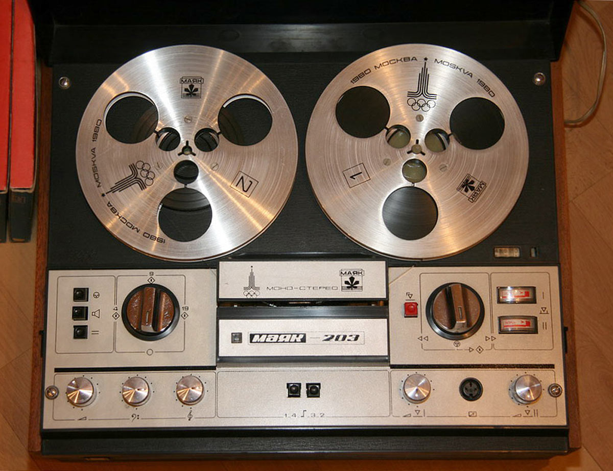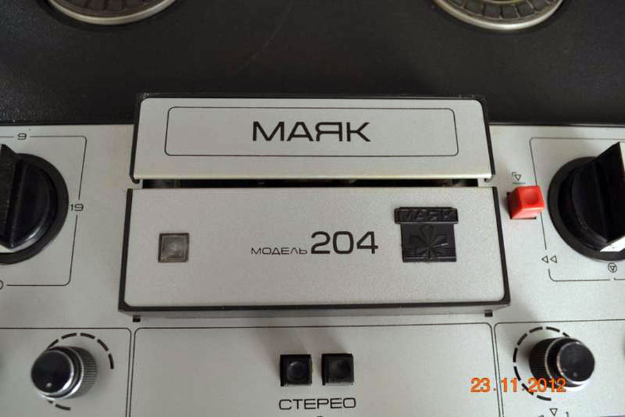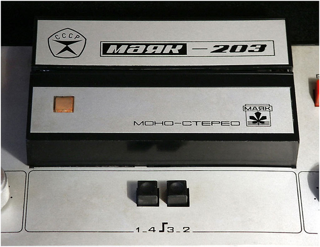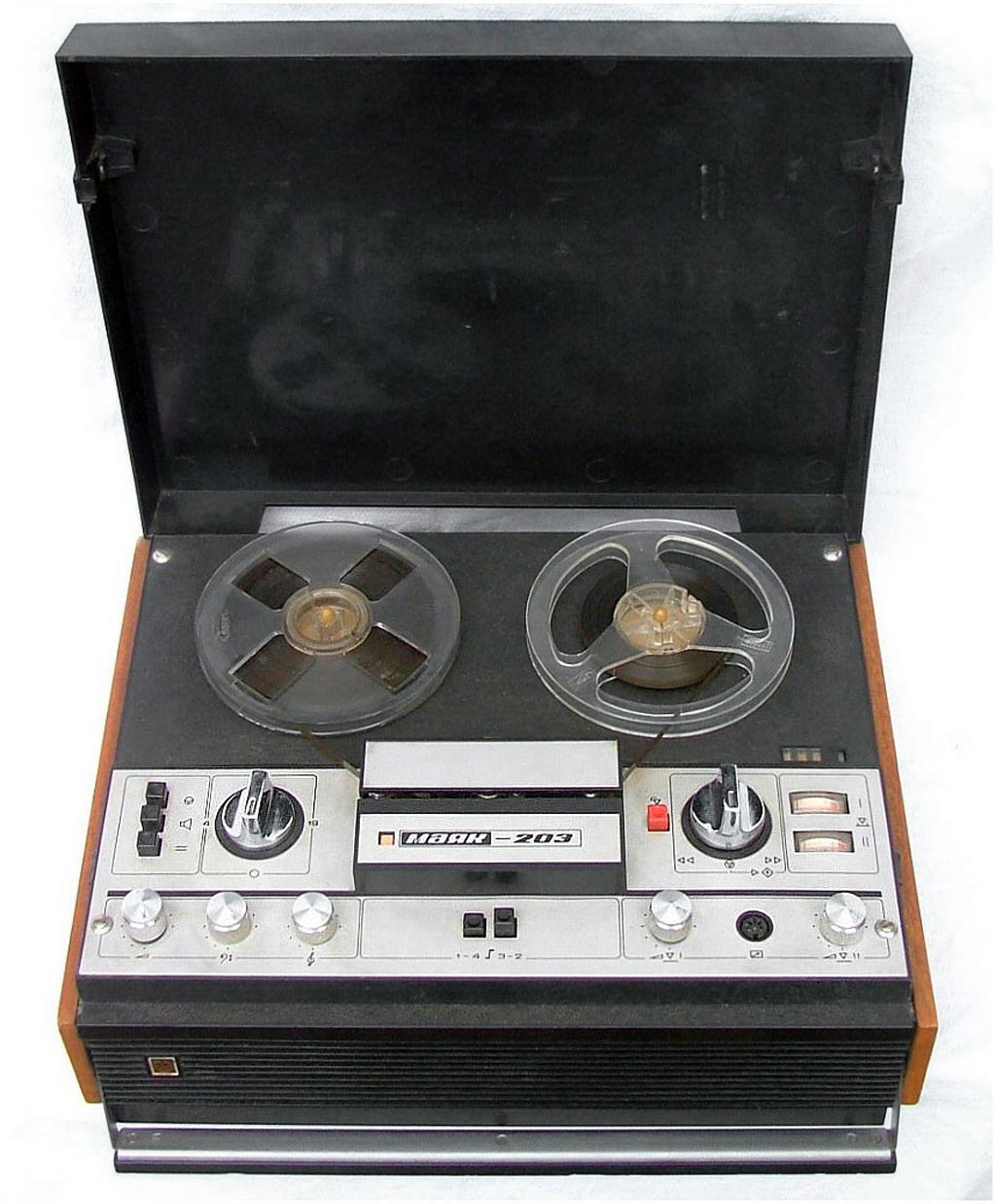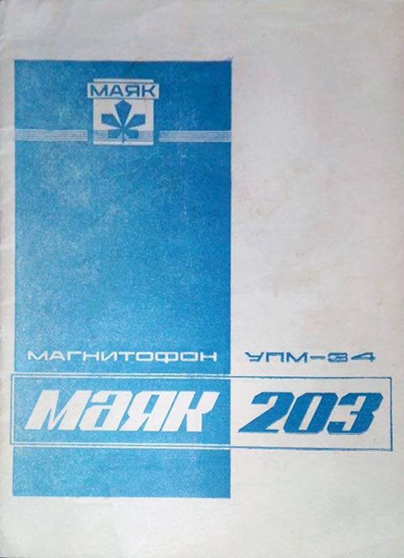 Катушечный магнитофон *Маяк-203* с осени 1976 года выпускал Киевский завод *Маяк*. Предназначен для записи и воспроизведения фонограмм с применением магнитной ленты типа 10. Позволяет производить запись (моно/стерео) с микрофона, звукоснимателя, радиоприёмника, телевизора, радиолинии и другого магнитофона и воспроизведение стерео-фонограмм в моно режиме, а на головные стереотелефоны в стерео. Уровень записи контролируется стрелочными индикаторами, а качество прослушиванием. Магнитофон выполнен переносной конструкцией в деревянном корпусе. В АС стоит две головки 1ГД-40Р. Магнитофон питается от сети, потребляя мощность 65 Вт. Скорость ленты 19,05, 9,53 и 4,76 см/с. Диапазон частот при скорости 19,05 см/с - 40...18000 Гц, 9,53 см/с - 63...12500 Гц, 4,76 см/с - 63...6300 Гц. Длительность записи на 4-х дорожках при использовании катушки №18 с лентой А4407-6Б (525 м) на скорости 19,05 см/с 3 часа, 9,53 см/с 6 часов, 4,76 см/с 12 часов. Номинальная выходная мощность на внутренней АС - 2 Вт, на внешней АС - 4 Вт. Габариты магнитофона 165х432х332 мм. Масса 12,5 кг. Для увеличения ассортимента продукции завод одновременно выпускал и магнитофон *Маяк-204*, который кроме изменений в своём оформлении был полным аналогом магнитофона *Маяк-203*.