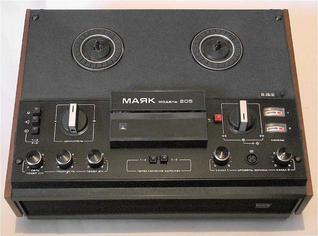 Катушечный (стереофонический до ЛВ) магнитофон *Маяк-205* с начала 1979 года выпускал Киевский завод *Маяк*. Предназначен для записи фонограмм на магнитной ленте и их воспроизведение на собственную или внешнюю АС, а так же на головные телефоны. В магнитофоне предусмотрены: раздельная регулировка уровня записи; ускоренная перемотка ленты; временный останов ленты; автоматический стоп ленты при окончании и обрыве; контроль уровня записи раздельно по каналам при неподвижной и движущейся ленте; регулировка тембра по ВЧ и НЧ; регулировка громкости с тонкомпенсацией; счётчик расхода магнитной ленты; использование магнитофона в качестве УЗЧ; отключение головок; ДУ пуском и остановом. Скорости: 19,05, 9,53 и 4,76 см/сек. Диапазон рабочих частот соответственно: 40...18000, 63...12500, 63...6300 Гц. Уровень шумов и помех в каналах ЗВ -44/42 дБ. КНИ 3%. Номинальная выходная мощность 2, на внешнюю АС - 4 Вт, максимальная 4 и 8 Вт. Потребляемая от сети мощность 65 Вт. Габариты модели 432х338х165 мм. Масса 12,5 кг.