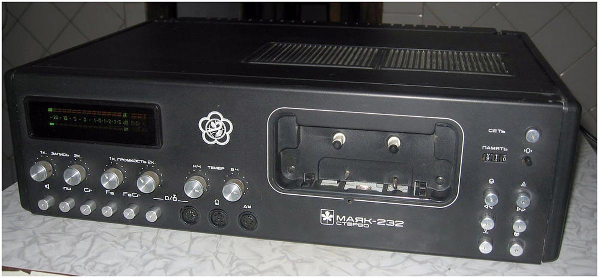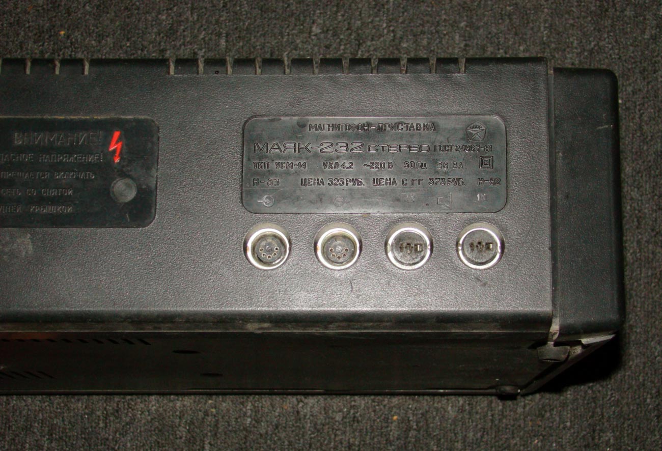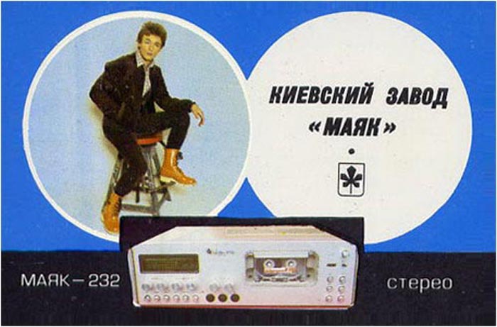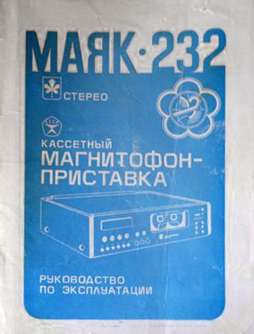 Стереофоническая кассетнная магнитофон-приставка *Маяк-232-стерео* с 1985 года выпускалась Киевским заводом *Маяк*. МП предназначена для записи и воспроизведения фонограмм в кассетах МК и работает с 3-мя типами лент. В модели имеются: регуляторы тембра по ВЧ и НЧ; раздельное регулирование уровня записи и воспроизведения; электронный индикатор уровня записи-воспроизведения; световая индикация сети; люминесцентная индикация включения СШП, микрофона, режима записи и типа магнитных лент; счетчик расхода ленты; устройство «Память»; подключение АС и стереотелефонов; СШ; проводное ДУ основными режимами; переключатель входов. Коэффициент детонации ±0,2%. Рабочий диапазон частот для ленты из: гамма окиси железа 40...12500 Гц; хромдиоксида 40...14000 Гц; гамма окиси железа-хромдиоксида 40...16000Гц. Уровень шумов и помех в канале З/В -50...56 дБ. Максимальная мощность на АС при сопротивлении 4 Ом - 4 Вт. Потребляемая мощность 38 Вт. Габариты МП - 460х130х360 мм. Масса 9,2 кг. Габариты АС - 383х265х185 мм. Масса 5 кг. Магнитофон-приставка *Маяк-232-стерео* (один из вариантов разработки) на пятом рекламном изображении, значительно отличается от серийной модели.