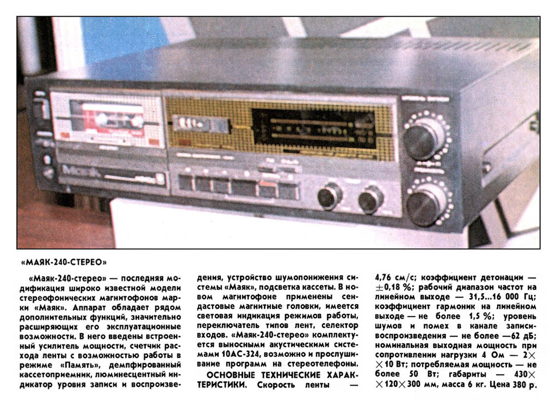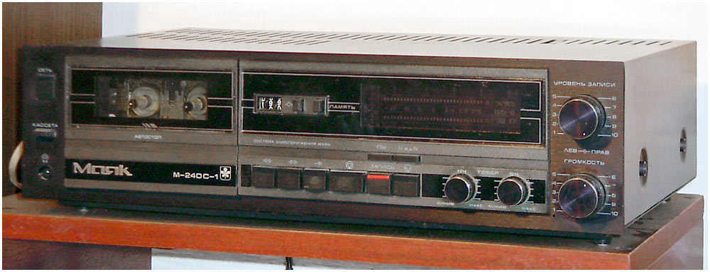 Магнитофон *Маяк М-240С* с 1988 года выпускал Киевский завод *Маяк*. Магнитофон обладает функциями, расширяющими его возможности. В магнитофон введены: встроенный УМ; счётчик расхода ленты, с возможностью работы в режиме **память**; демпфированный кассетоприёмник; люминесцентный индикатор контроля уровня записи или воспроизведения; устройство шумопонижения системы **Маяк**; подсветка кассеты. В модели применены: сендастовые износоустойчивые магнитные головки; световая индикация всех режимов работы; переключатель типа лент; селектор входов. В комплекте АС *10АС-324*. Возможно прослушивание программ на стереотелефоны. Цена МГ - 380 рублей. С 1990 года завод выпускал магнитофон **Маяк М-240С-1**, где заменены лишь АС. С 1992 года выпускался магнитофон **Маяк М-240С-2** аналогичный описанным.