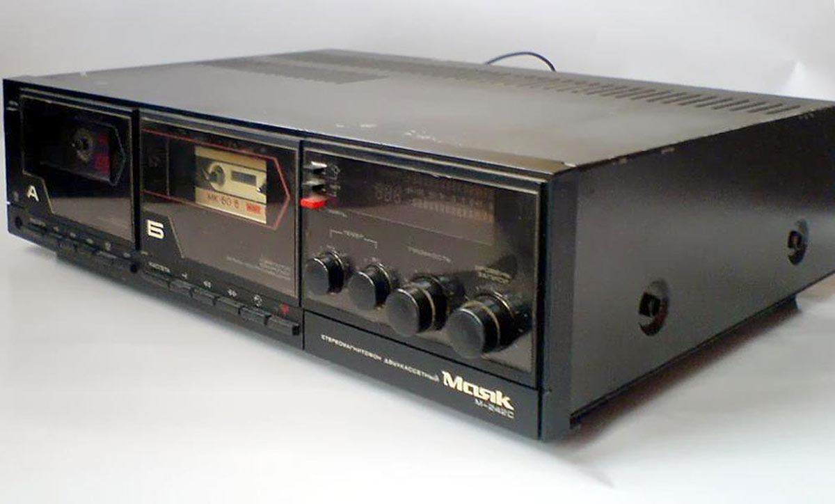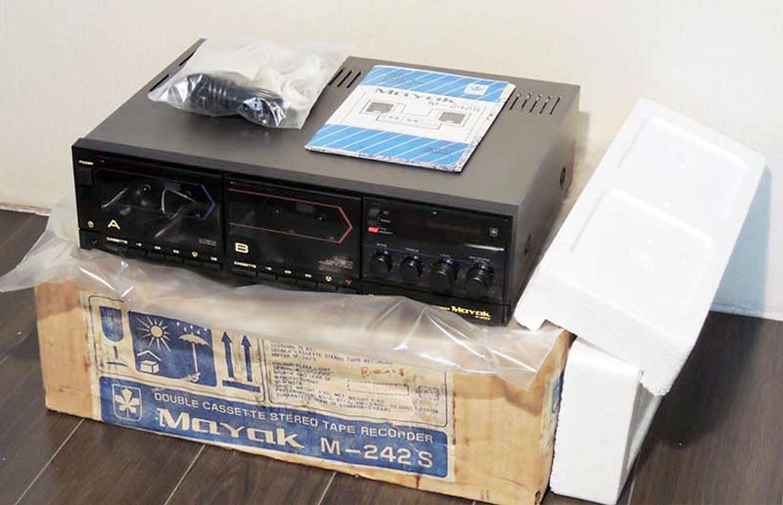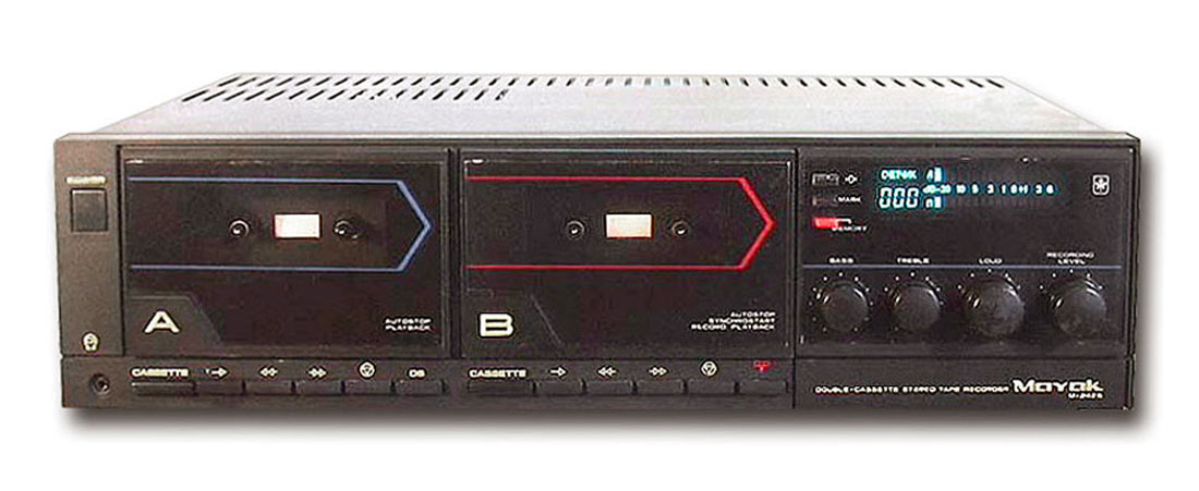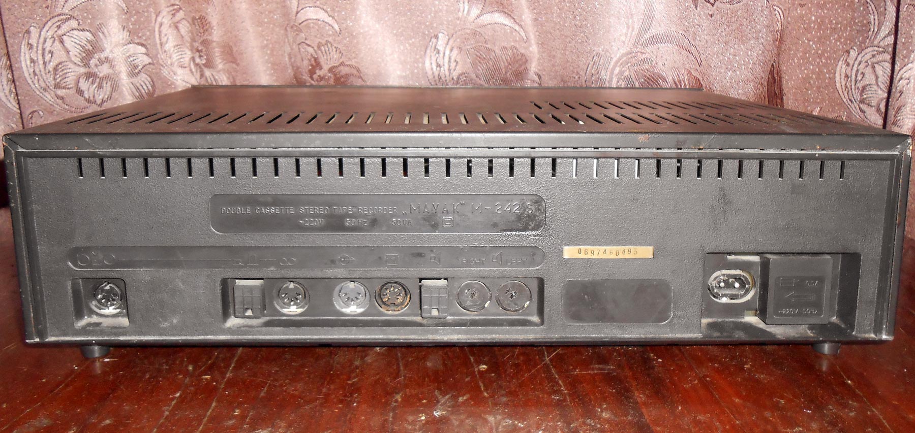 Двухкассетный магнитофон *Маяк М-242С* с 1992 года выпускал Киевский завод *Маяк*. Аппарат предназначен для записи фонограмм на магнитную ленту в кассетах МК и последующего их воспроизведения через АС или внешнее УКУ с АС. Есть возможность перезаписи фонограмм с кассеты на кассету. Можно использовать ленты с рабочим слоем из гамма-окиси железа и двуокиси хрома. В магнитофоне применено квазисенсорное электронно-логическое управление ЛПМ. Имеется: автостоп по окончании ленты; счётчик расхода ленты с режимом *Память*; демпфированные кассетоприёмники; люминесцентный индикатор уровня записи и воспроизведения; устройство ШП системы *Маяк*; световая индикация режимов работы; подсветка кассет; переключатель типа лент; регулировка уровня записи; тембры по ВЧ и НЧ; СДП; выход для телефонов. Коэффициент детонации 0,15%. Рабочий диапазон частот на ЛВ - 31,5...18000 Гц. Коэффициент гармоник на ЛВ не более 1,5%. Уровень шумов и помех в канале З/В -60 дБ. Номинальная выходная мощность 2х10 Вт, максимальная 2х15 Вт. Габариты магнитофона - 430х120х300 мм. Масса - 6,2 кг.