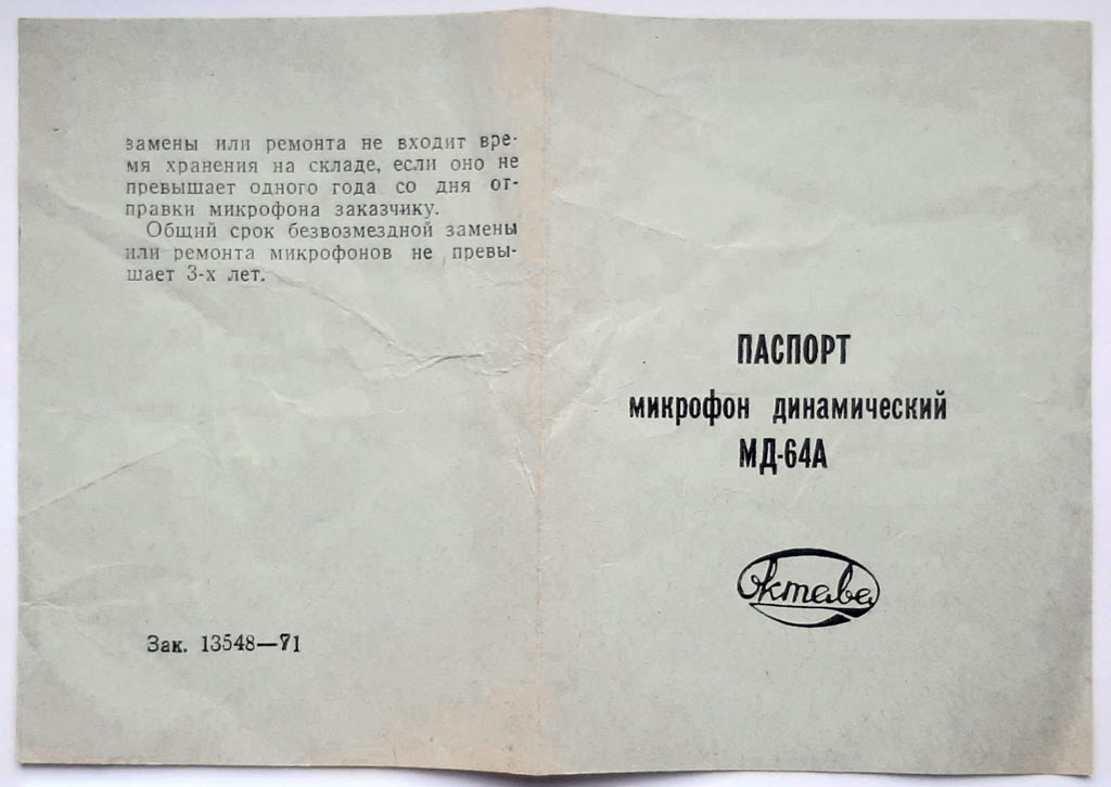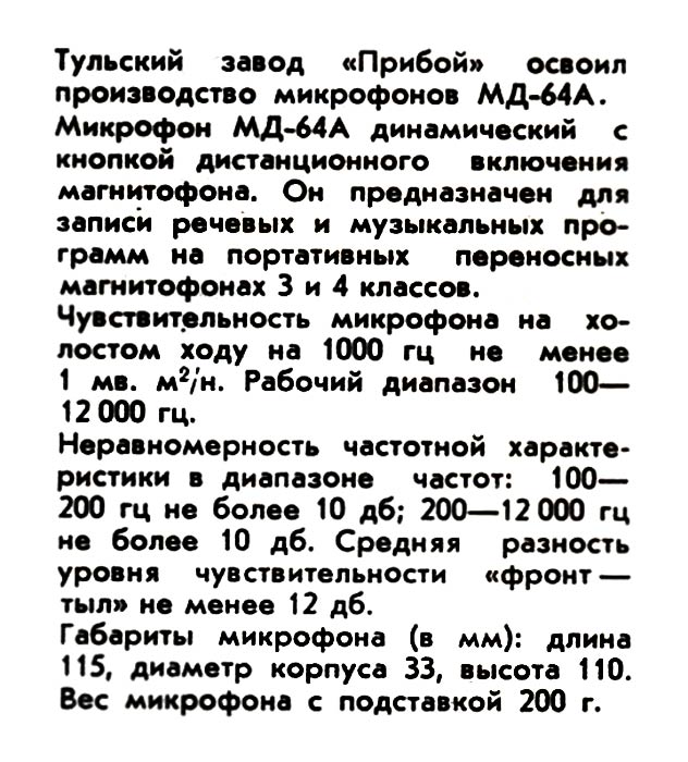 Микрофон динамический *МД-64А* выпускался с 1967 года Тульским заводом *Октава* (з-д *Прибой*). Предназначен для комплектования кассетных магнитофонов третьего и четвёртого классов, с функцией для дистанционного включения записи, включением или выключением питания. Диапазон воспринимаемых частот - 100...12000 Гц. Выходное сопротивление - 250 Ом. Более подробно микрофон описан в приведённой ниже документации.