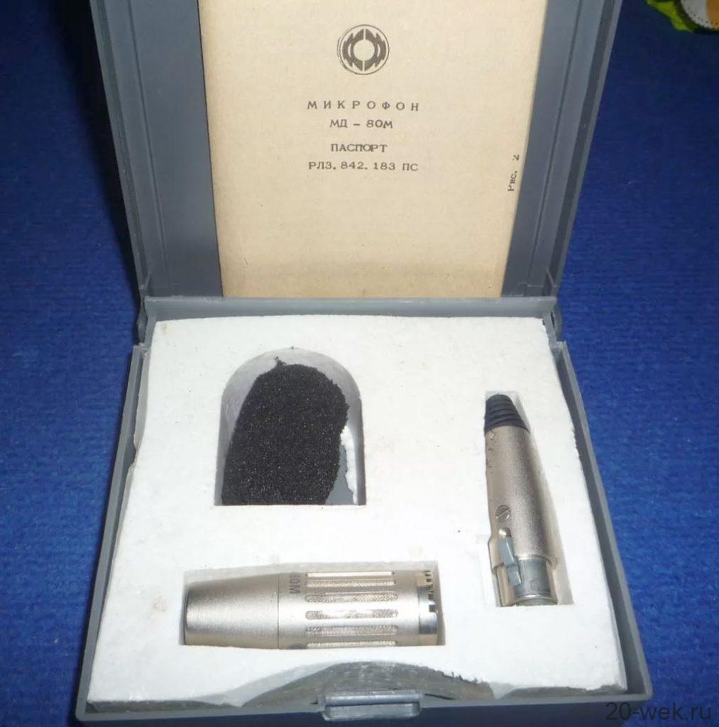 Микрофон динамический *МД-80М* выпускался предположительно с 1978 года Тульским заводом *Октава*. Микрофон предназначен для усиления речи в залах с неблагоприятной акустической ситуацией в составе пульта оратора. Диапазон рабочих частот - 100...15000 Гц. Чувствительность по свободному полю на частоте 1000 Гц, 1,3 мВ/Па. Модуль полного электрического сопротивления 200 Ом. Габаритные размеры 151х44 мм. Масса 110 гр.