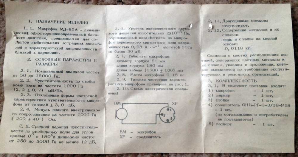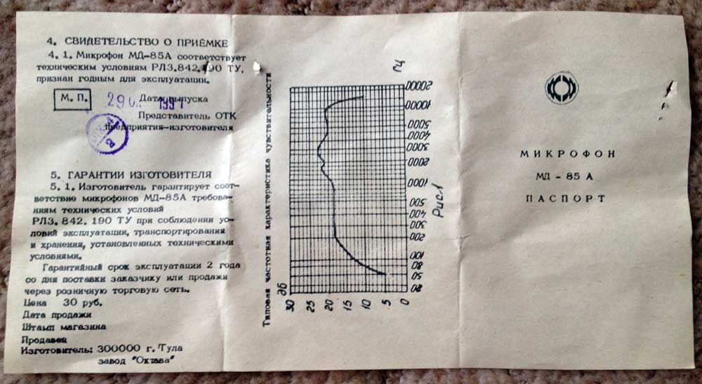 Микрофон динамический *МД-85А* выпускался с 1989 года Тульским заводом *Октава*. Полупрофессиональный односторонненаправленный динамический микрофон с несимметричным выходом. МД предназначен для звукозаписи на бытовых магнитофонах и вокала. Характеристика направленности близкая к кардиоиде, встроенная ветрозащита. Частотный диапазон звука 50...16000 Гц. Чувствительность 2,2 мВ/Па. Выходное сопротивление 200 Ом. Размеры микрофона 51x180 мм. Масса 180 грамм.