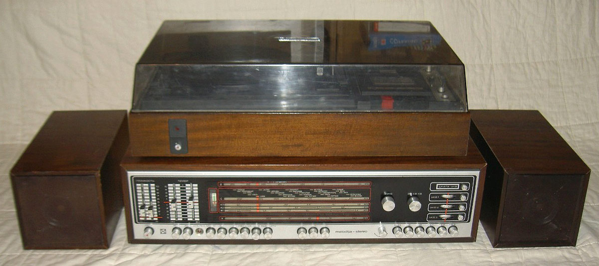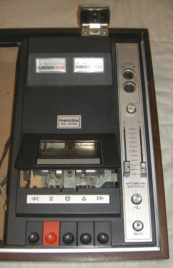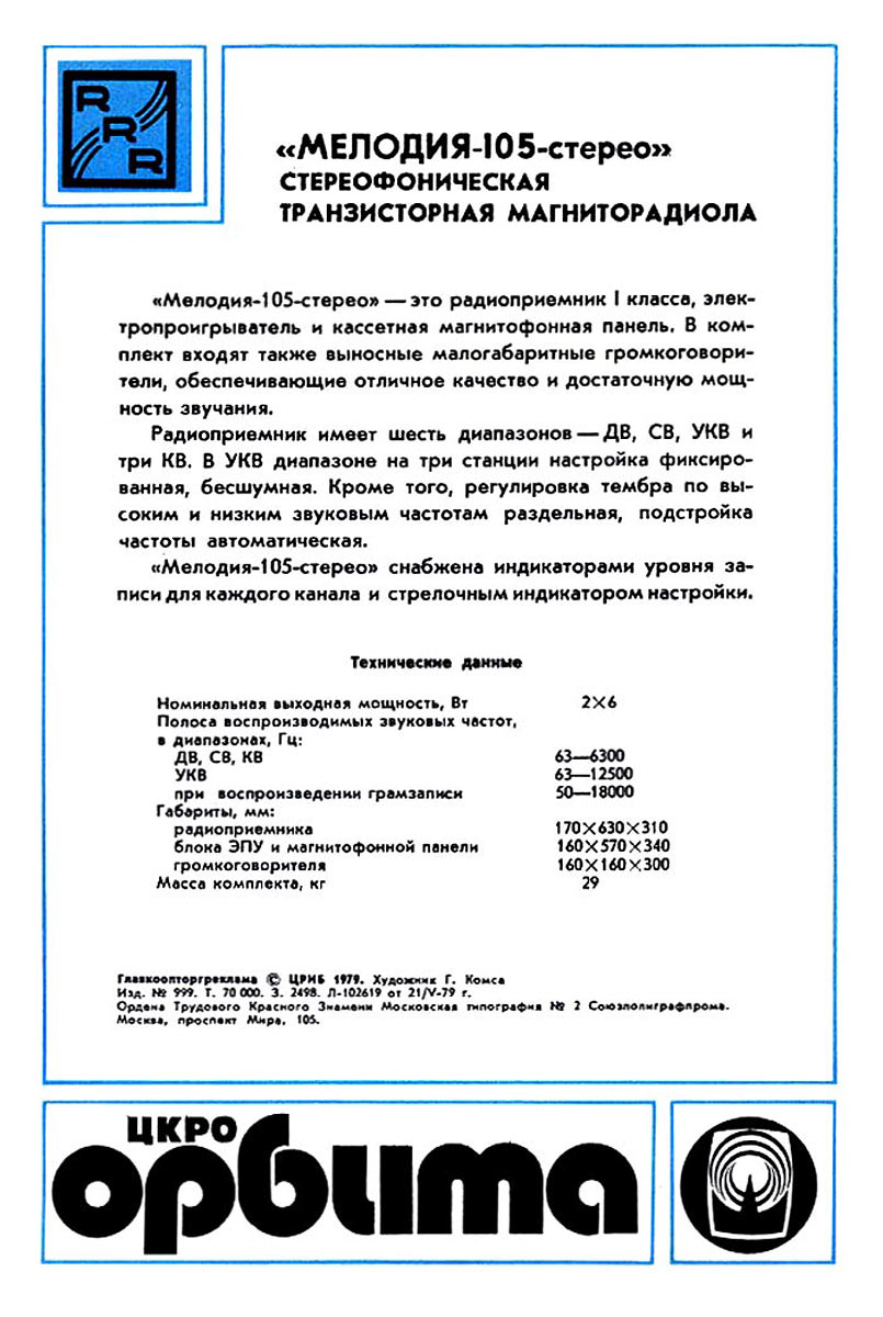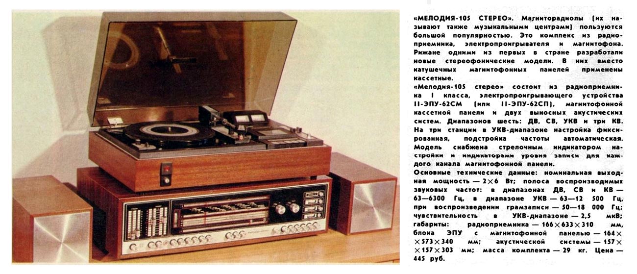 Стереофоническая радиола с кассетным магнитофоном *Мелодия-105-стерео* с 1979 года выпускалась Рижским радиозаводом им. А.С.Попова. Радиола предназначена для приёма в диапазонах ДВ, СВ, КВ и УКВ, прослушивания стереопрограмм в диапазоне УКВ и проигрывания моно или стереофонических грамзаписей. Магнитофонная панель позволяет воспроизводить моно или стереофонические записи и осуществлять запись программ с радиолы, радиолинии, микрофона и других внешних источников программ. Радиола имеет шесть диапазонов, поворотную магнитную антенну, внутренний УКВ диполь. Номинальная выходная мощность 2х6, максимальная 2х16 Вт. При приёме диапазон воспроизводимых частот на ДВ, СВ и KB - 63...4000 Гц, на ДВ и СВ в положении МП - 63...6300 Гц, УКВ и по тракту грамзаписи - 63...12500 Гц. При работе магнитофона диапазон частот - 63...10000 Гц. Габариты приёмника - 625х168х320 мм; ЭПУ 565x175x360 мм; одной АС - 158х158х300 мм. Вес комплекта 29 кг.