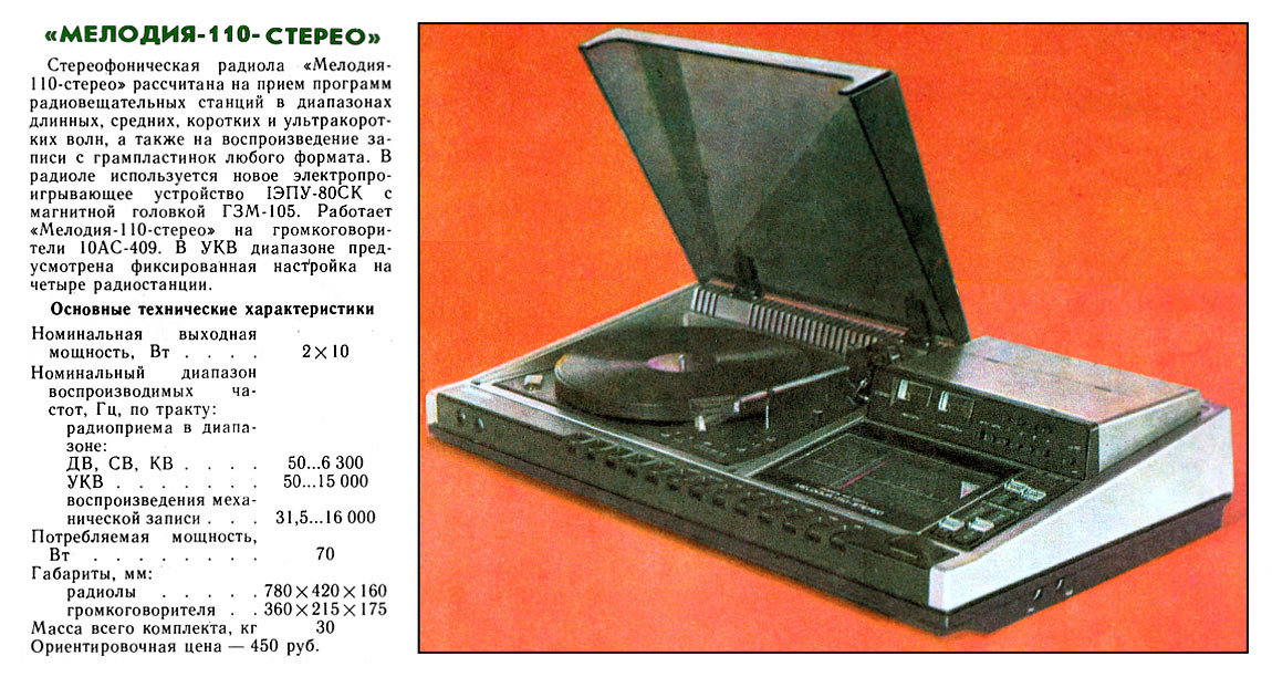 Стереофоническая радиола *Мелодия-110-стерео* разработана и подготовлена к выпуску в 1980 году Рижским заводом *Радиотехника*. Она рассчитана для приёма радиостанций в диапазонах: ДВ, СВ, КВ, УКВ и на воспроизведение грампластинок. В модели используется ЭПУ типа I-ЭПУ-80СК с магнитной головкой ГЗМ-105. Выходы усилителей работают на АС типа 10АС-409. В ЧМ диапазоне предусмотрена фиксированная настройка четырёх радиостанций. Основные характеристики: номинальная выходная мощность 2х10 Вт; номинальный диапазон частот по тракту: радиоприёма в диапазонах: ДВ, СВ, KB - 50...6300 Гц, УКВ - 50...15000 Гц, воспроизведения механической записи - 31.5...16000 Гц. Потребляемая мощность - 70 Вт. Габариты радиолы - 780х420х160 мм. АС - 360х215х175 мм. Масса комплекта - 30 кг.