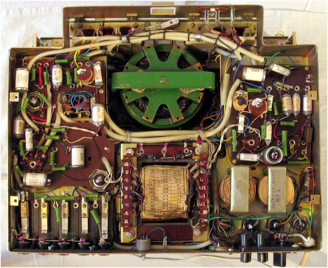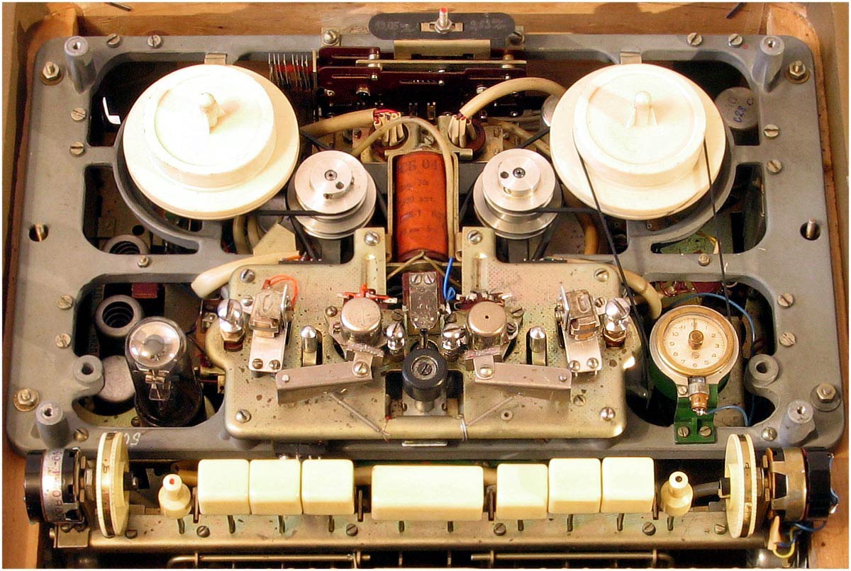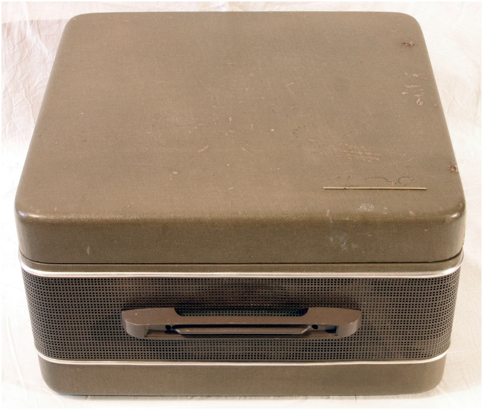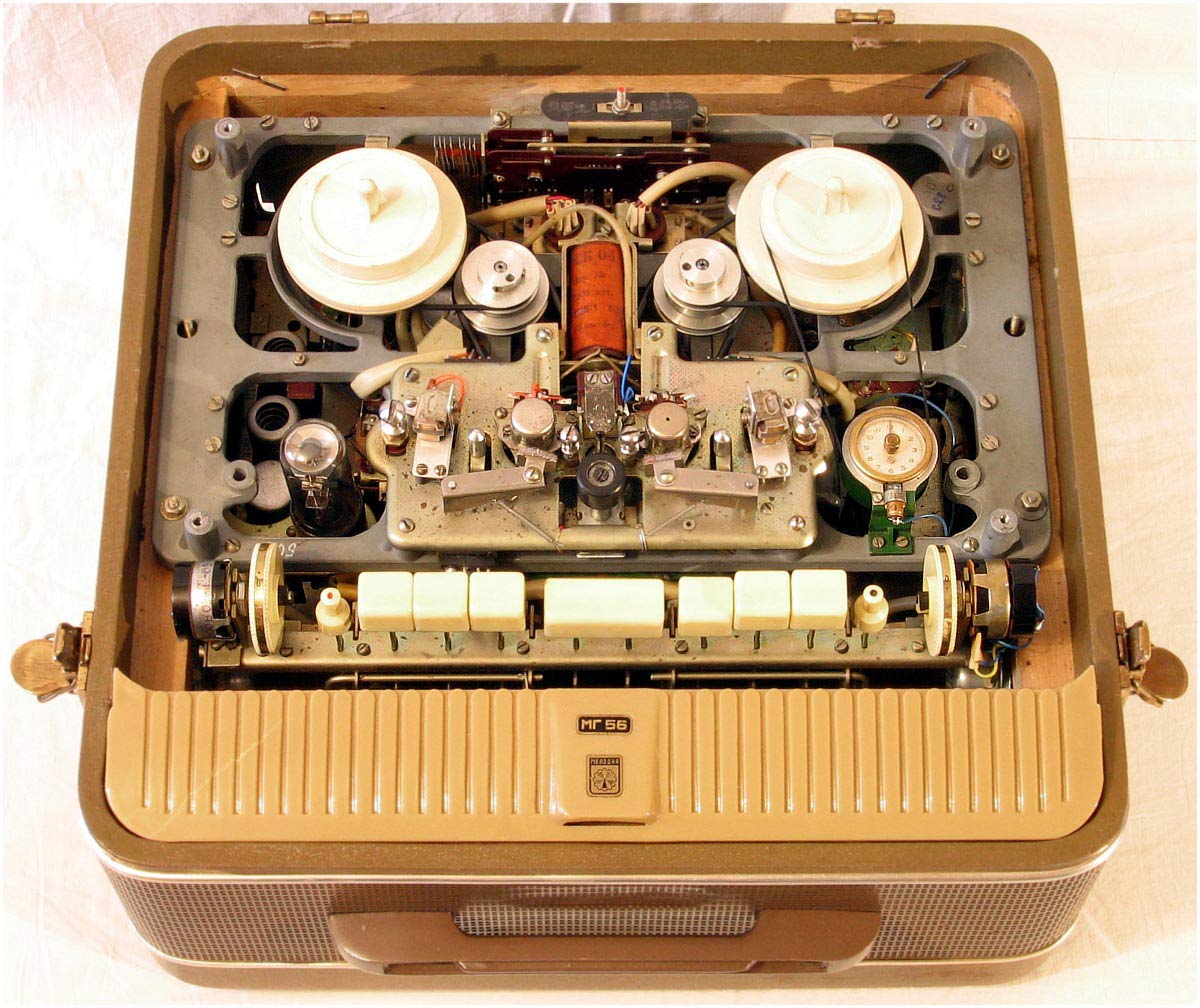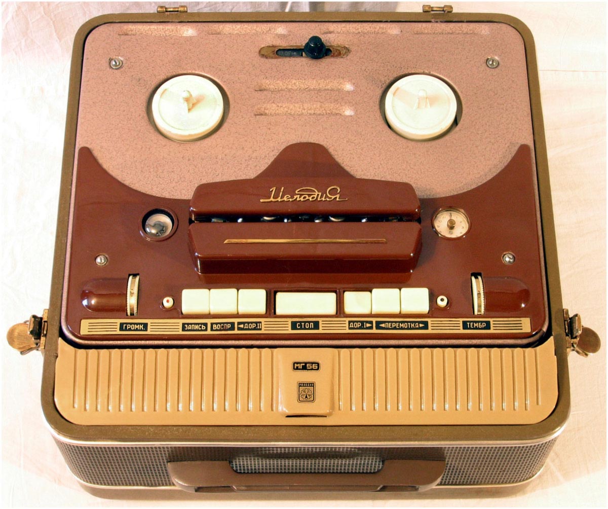 Магнитофон *Мелодия МГ-56* с 1956 года выпускал Новосибирский завод *Точмаш*. Он скопирован с немецкого магнитофона *Grundig TK-820*, 1955 года выпуска (первое фото). Магнитофон *Мелодия МГ-56* предназначен для записи и воспроизведения звуковых программ на магнитной ленте типа 2 с катушками № 18. Запись фонограмм двухдорожечная. Скорость протяжки магнитной ленты 9,53 см/сек и 19,05 см/сек. Диапазон частот канала записи или воспроизведения на большей скорости 50...10000 Гц, на меньшей 100...6000 Гц. Номинальная выходная мощность на двух громкоговорителях 2ГД-3 не менее 2 Вт. Потребляемая от сети мощность при записи около 100 Вт, при воспроизведении 80 Вт. Магнитофон имеет: индикатор уровня записи и схожий с ним по оформлению указатель метража магнитной ленты; кнопку пауза; регуляторы тембра НЧ и ВЧ; устройство выключения в конце рулона ленты. Всевозможные переключения в магнитофоне осуществляются с помощью обычных и тяговых реле, а так же с помощью электромагнитных муфт. Управление всеми режимами работ - кнопочное. Собран магнитофон в футляре из дерева и оклеен декоративным материалом. Габариты магнитофона - 420х420х210 мм. Масса 24 кг. На втором изображении реклама магнитофона *Мелодия МГ-56* в журнале *Техника Молодёжи* № 11 за 1957 год.