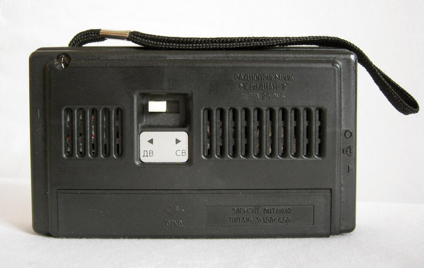 Портативный радиоприёмник *Меридиан-2* был выпущен в 1984 году Киевским заводом *Радиоприбор*. Приёмник выпущен к 40-летию победы в ВОВ. Он собран по супергетеродинной схеме на микросхеме К174ХА10 и работает в диапазонах ДВ и СВ. Чувствительность в ДВ диапазоне 2 мВ/м, СВ 1,5 мВ/м. Полоса воспроизводимых частот 315...3150 Гц. Максимальная выходная мощность 80 мВт. Габариты приёмника 38х80х140 мм. Масса без упаковки 260 гр.
