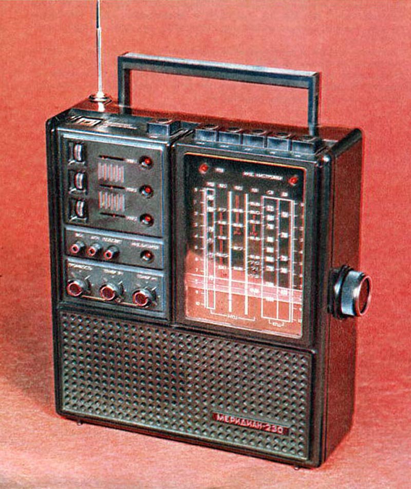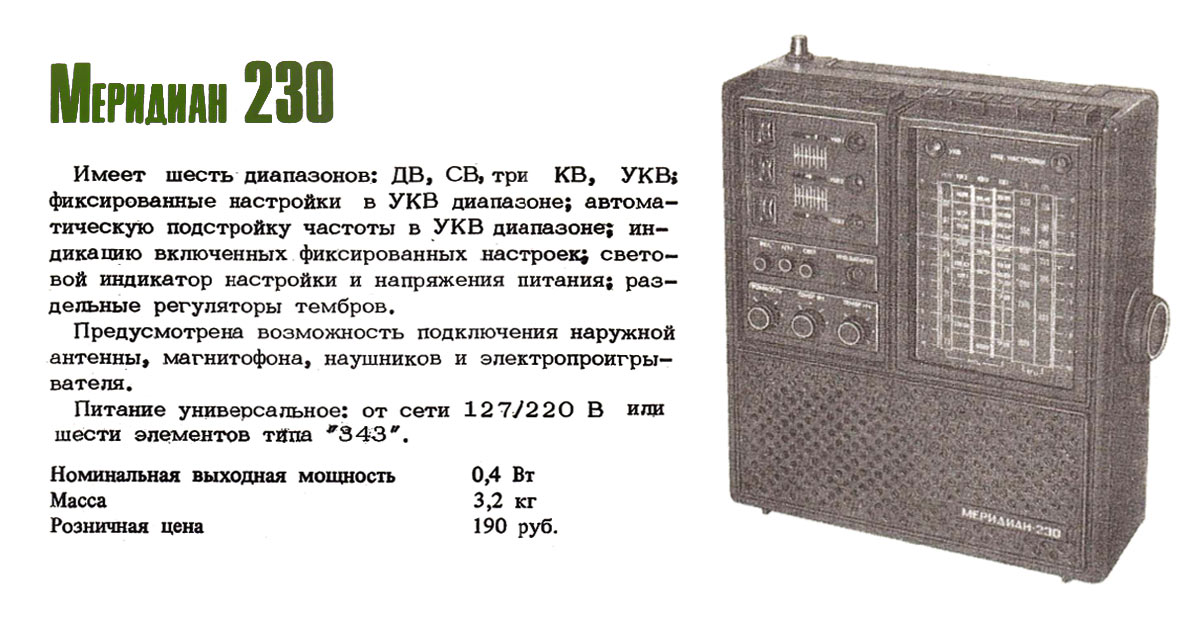 Радиоприёмник *Меридиан-230* с 1982 года производил Киевский завод *Радиоприбор*. Приёмник разработан на основе модели *Меридиан-210*. Основное отличие, это электронная настройка во всех диапазонах и электронная сенсорная коммутация фиксированных настроек в УКВ диапазоне. Использование унифицированных функциональных блоков позволило уменьшить габариты и снизить массу приёмника по сравнению с предшественником. Приём ДВ, СВ радиостанций производится на магнитную антенну, а КВ и УКВ на телескопическую. Точность настройки контролируется электронным световым индикатором настройки. Питание от электросети через встроенный БП, от 6 элементов 343 или от внешнего источника. О работоспособности батарей можно судить по имеющемуся индикатору. Реальная чувствительность в диапазоне ДВ - 1,4 мВ/м, СВ - 0,85 мВ/м, на телескопическую антенну в диапазонах КВ - 50 мкВ, УКВ - 10 мкВ. Максимальная выходная мощность при питании от сети 1,5 Вт, от автономного источника 0,6 Вт. Диапазон воспроизводимых частот звука тракта AM - 125...4000 Гц, ЧМ - 125...10000 Гц. Габариты приёмника 280 х 245 х 85 мм. Масса 3 кг. Цена 190 рублей.
