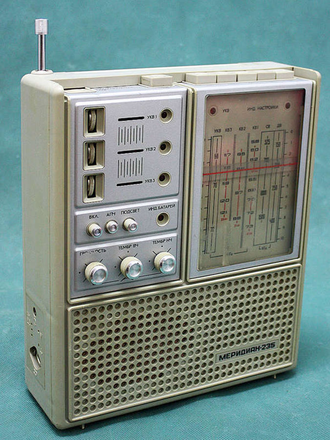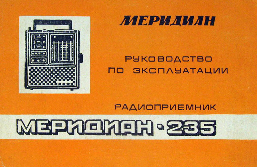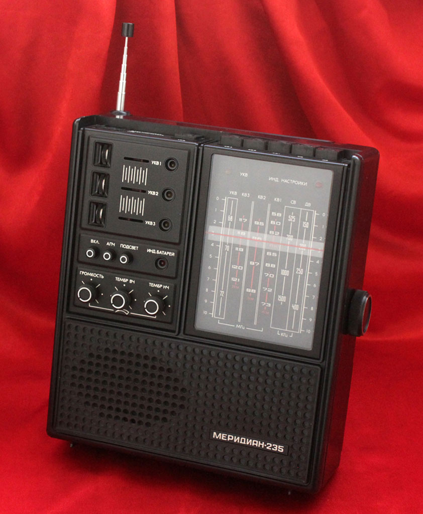 Портативный радиоприёмник *Меридиан-235* с середины 1983 года выпускал Киевский завод *Радиоприбор*. Радиоприёмник предназначен для приёма радиостанций в диапазонах ДВ, СВ, KB и УКВ. Он имеет магнитную антенну для ДВ, СВ диапазонов, в KB и УКВ диапазонах штыревую телескопическую, фиксированную настройку на одну из трёх станций и АПЧ в диапазоне УКВ, регулировку тембра по ВЧ и НЧ, гнёзда для внешней антенны, магнитофона и головных телефонов. Ручка для переноски убирающаяся. Основные данные: Диапазоны: ДВ, СВ, КВ-1 5,8...7,3 мГц, КВ-2 9,5...9,8 мГц, КВ-3 11,7...12,1 мГц, УКВ 65,8...73 мГц. Чувствительность на встроенных антеннах ДВ 0,4 мВ/м, СВ 0,25 мВ/м, KB 100 мкВ, УКВ 20 мкВ. Селективность в АМ тракте не менее 34 дБ. Полоса воспроизводимых звуковых частот АМ тракта - 125...4000 Гц, ЧМ 125...10000 Гц. Максимальная выходная мощность при питании от батарей 0,8 Вт, от сети 1,5 Вт. Источник питания 6 элементов 343 или сеть переменного тока 220 вольт. Габариты модели 280х250х90 мм. Масса 2,8 кг. Цена 135 (145) рублей. Радиоприёмник **Меридиан-236** выпускаемый с 1987 года не отличается от модели **Меридиан-235** и выпускался для ассортимента.