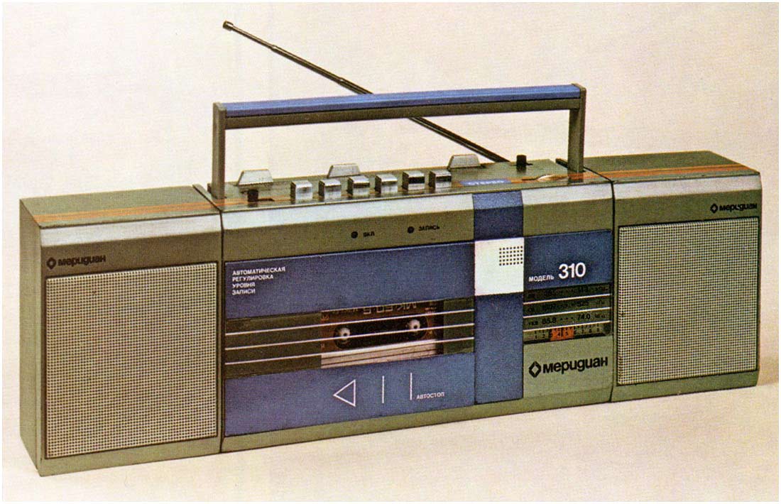 Портативная кассетная магнитола *Меридиан-310-стерео* подготовлена к выпуску в 1988 году Киевским ПО имени Королева. Она состоит из радиоприёмника, осуществляющего приём радиостанций в диапазонах ДВ, СВ, УКВ-ЧМ и кассетного магнитофона. В магнитоле имеются: Автоматическая регулировка уровня записи; автостоп; регуляторы громкости, баланса и тембра; индикация включения в сеть; встроенный микрофон, съёмные акустические системы, отдельный сетевой БП, возможность подключения стереотелефонов. Питание универсальное: от сети 220 В или 6 элементов типа А-343. Краткие технические характеристики: Номинальнвя выходная мощность 2х0,5 Вт. Чувствительность соответственно 1, 0,8 / 0,05 мВ/м. Диапазон воспроизводимых громкоговорителем частот в АМ и ЧМ диапазонах 315...3150 / 250...10000 Гц. Диапазон воспроизводимых частот от магнитофона на линейном выходе 63...12500 Гц. Габариты магнитолы 443х142х85 мм. масса 3 кг.