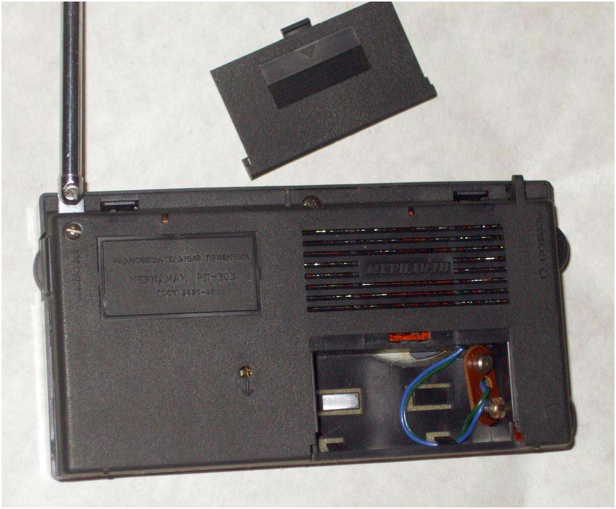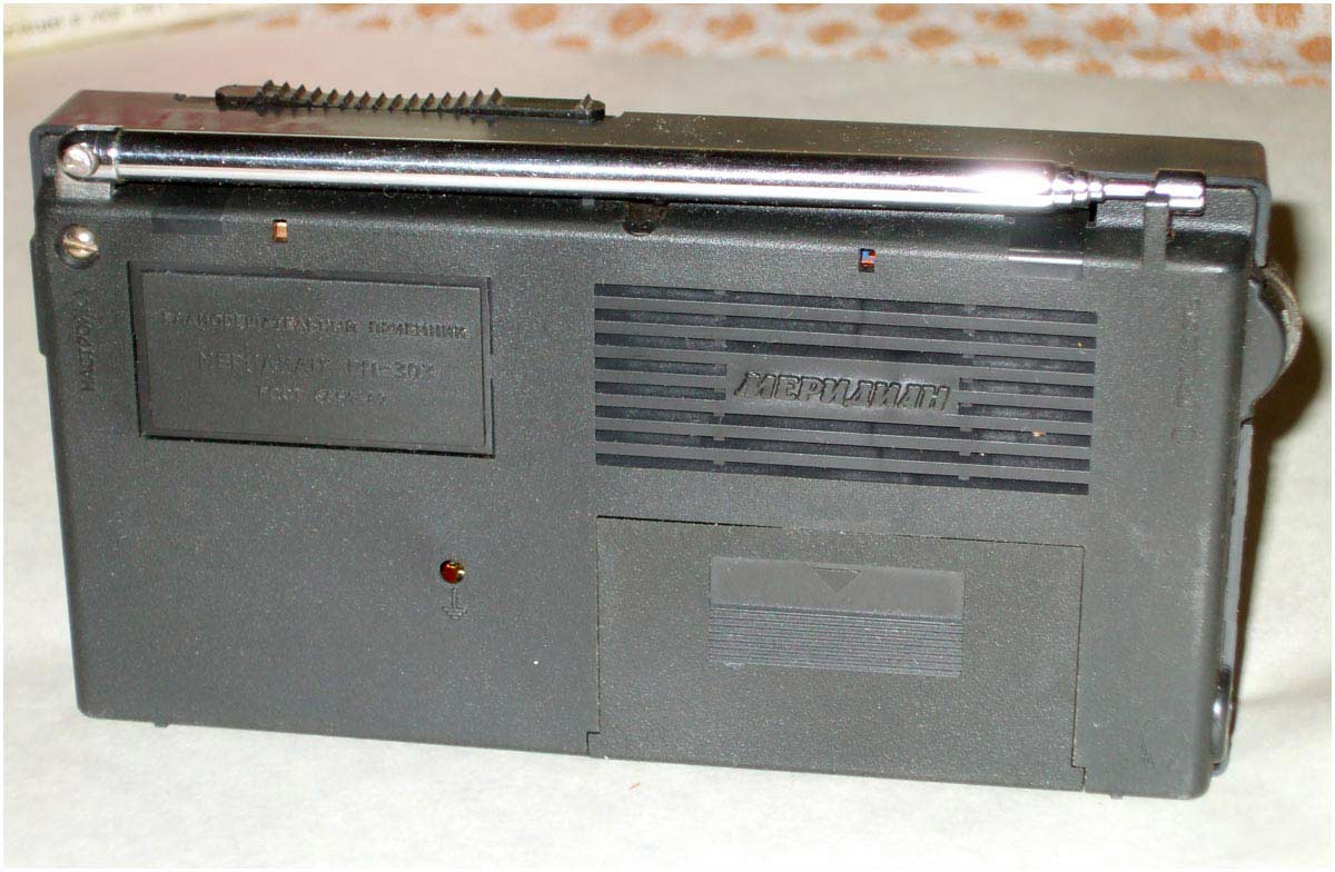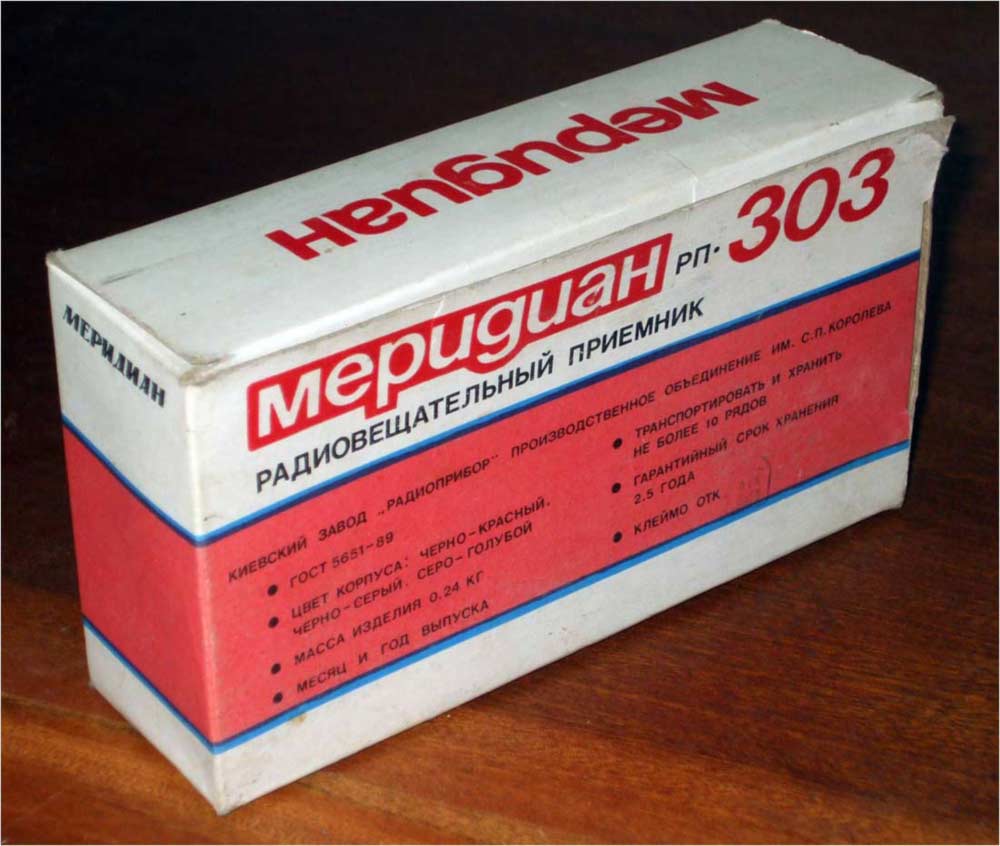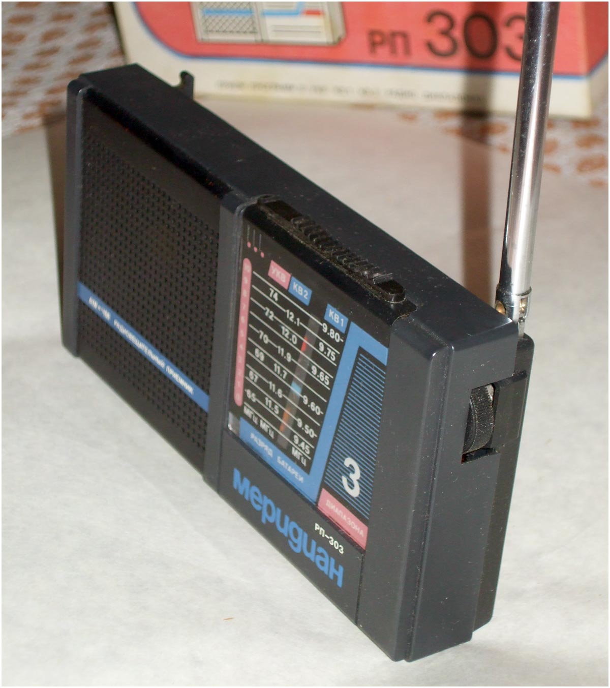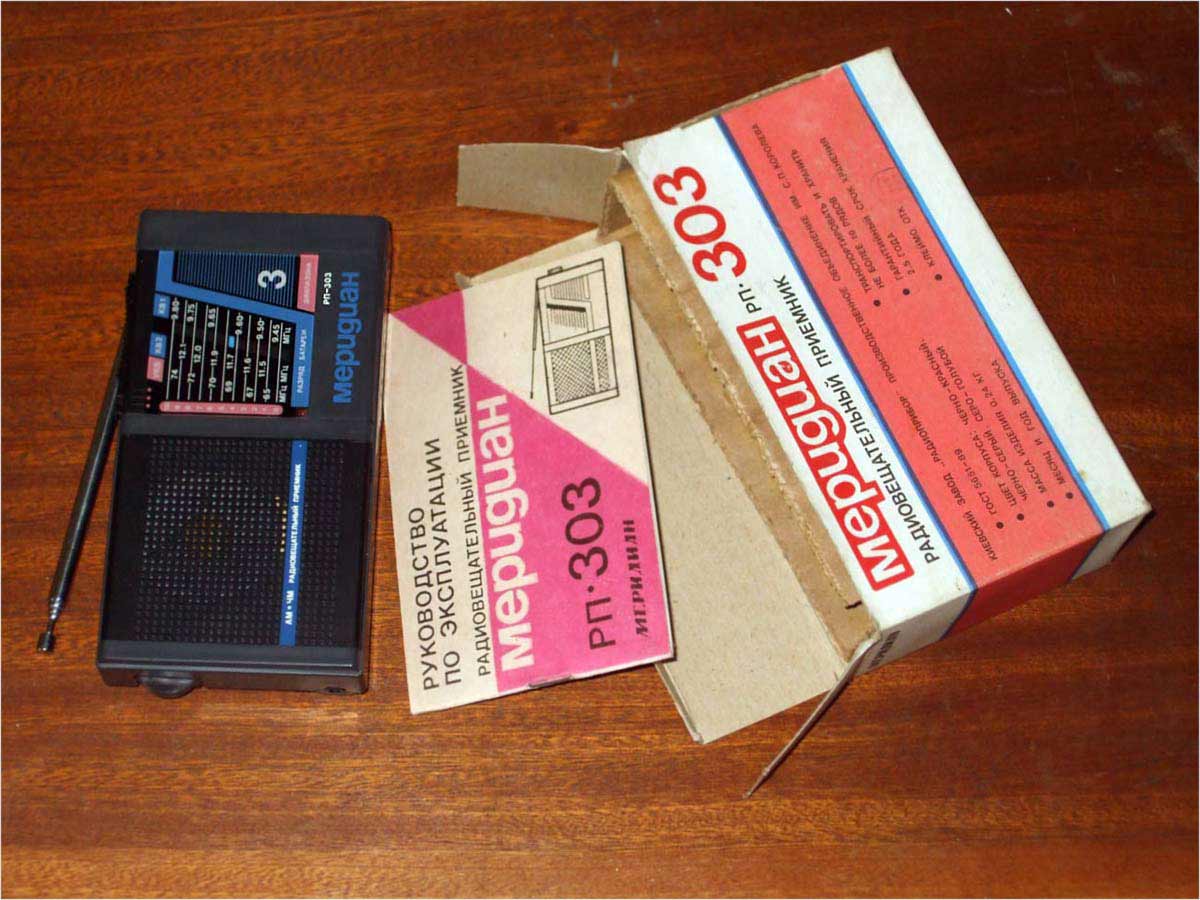 Радиоприёмник *Меридиан РП-303* с 1993 года выпускал Киевский завод *Радиоприбор*. Радиоприёмник **Меридиан РП-303** предназначен для приёма программ радиовещательных станций в диапазоне КВ (2 поддиапазона) и УКВ. Радиоприёмник выполнен на трёх микросхемах и имеет раздельный тракт УПЧ. Для приёма используется выдвижная телескопическая антенна. В диапазоне УКВ используется устройство БШН, обеспечивая отсутствие шумов в промежутках между станциями, а устройство АПЧ стабильность настройки. В диапазонах КВ-1, КВ-2 стабильность приёма обеспечивается АРУ. В модели имеется индикатор разряда батареи. Диапазоны: КВ-1 9,5...9,8, КВ-2 11,7...12,1 МГц. Чувствительность в диапазонах: KB - 0,6, УКВ - 0,2 мВ/м. Селективность в КВ диапазонах 20 дБ. Диапазон частот по звуковому давлению в диапазоне УКВ - 450...3150 Гц. Максимальная выходная мощность 100 мВт. Габариты радиоприёмника - 77,5х28,5х153 мм. Масса - 240 гр.