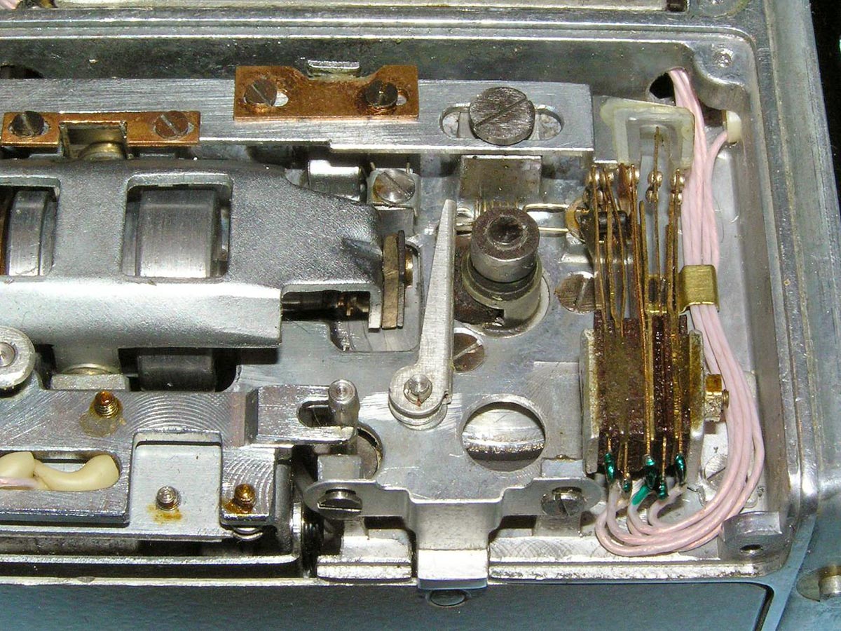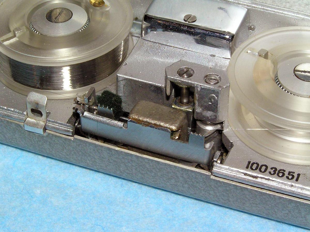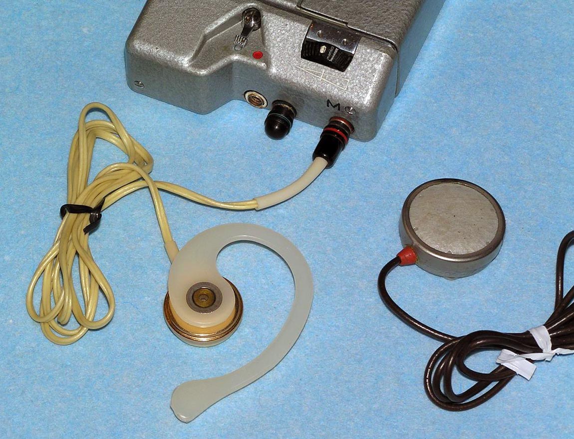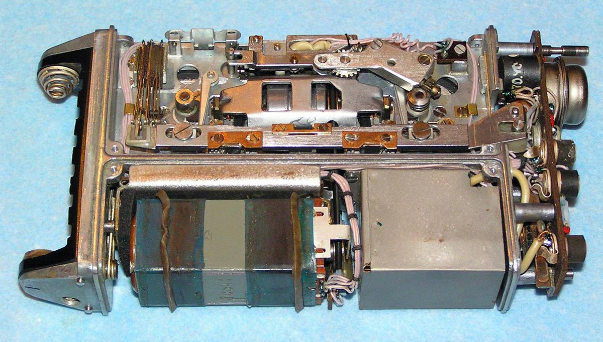 Портативный проволочный диктофон *Мезон* выпускался предположительно с 1960 по 1987 годы для спецслужб и МВД. Габариты аппарата 158х75х26 мм. Вес без питания 500 г. Проволоки на катушке хватает на 1,5 часа записи. Размеры катушки 35х12 мм. Время обратной перемотки 1 час. Питание 7 В от батареи *БОР*, элементов ОР-2К (РЦ-63), аккумуляторов *DEAC* или 5 элементов *Сатурн*, размещаемых во внешнем контейнере. Питание можно подать от внешнего источника через адаптер, вставляющийся в батарейный отсек. Запись осуществляется микрофоном *Нева* или *Т-65*, наушника ТМ-2, или от адаптера. Прослушивание записи осуществляется наушником ТМ-2 или внешним УНЧ. Для подключения микрофона, наушника и адаптера есть разъём с маркировкой *М*. Два других разъема предназначены для переключателя ДУ. Штекеры имеют резьбу, для предотвращения случайного выскакивания. Управляется диктофон переключателем, который в нерабочем состоянии находится в положении *Стоп*, отмеченном на крышке корпуса синим кружком. При переключении переключателя в положение, отмеченное красным кружком, и при закрытой верхней крышке, осуществляется запись, а при открытой - воспроизведение. Обратная перемотка проволоки осуществляется при открытой крышке и переключении переключателя по часовой стрелке до упора. Схема собрана на пяти транзисторах. Для уменьшения наводок блок усилителя помещен в пермаллоевый экран. Разъёмы, схема управления двигателем и генератор подмагничивания собраны на плате, размещенной в торце корпуса. Для регулирования уровня громкости и записи имеется аттенюатор на 3 положения. Стирающей головки нет, стирание осуществляется внешним размагничивающим дросселем. Пассик передает движение от двигателя к горизонтальному маховику, который в свою очередь вращает одну из двух обрезиненных планшайб, в зависимости от режима работы. Универсальная головка перемещается вверх - вниз с помощью червячного механизма. Имеется автостоп, срабатывающий, когда на подающей катушке заканчивается проволока. При этом на подающей катушке освобождается подпружиненный рычажок, удерживаемый витками проволоки, и нажимает на рычаг автостопа, расположенный под подающей катушкой. Последний размыкает контакты цепи двигателя. Комплект имеет необходимый набор аксессуаров, таких как дополнительные катушки, в том числе с проволкой, адаптер питания, адаптер записи от внешнего источника, адаптер для бесконтактной записи с телефонной линии, дроссель размагничивания, батарею *БОР*, чашки элементов ОР-2К (РЦ-63), наушник ТМ-2, тубу со смазкой, устройство заправки проволоки.