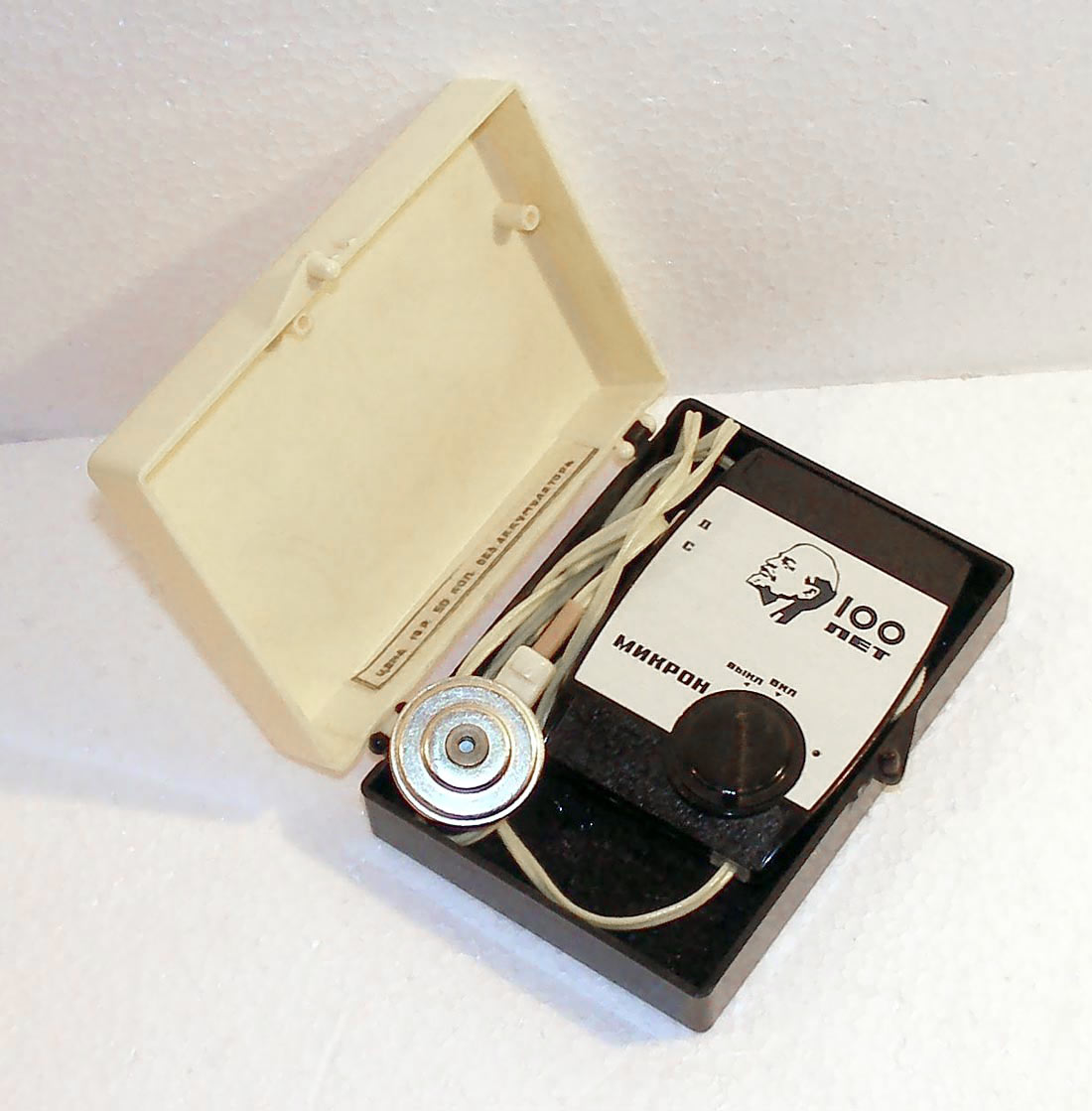Малогабаритный радиоприёмник *Микрон* с 1969 года выпускал Минский радиозавод. Выпуск приёмника приурочен к юбилейной дате, 100-летию со дня рождения В.И.Ленина (1870-1970 г.). Радиоприёмник **Микрон** предназначен для приёма на внутреннюю магнитную антенну радиовещательных станций, работающих в диапазонах ДВ и СВ. Конструктивной особенностью модели является отсутствие печатной платы. Резисторы и большинство конденсаторов выполнены в виде микропленок, напылённых в вакууме на тонкую изоляционную пластину. Приёмник имеет чувствительность 25 мВ/м. Селективность 12 дБ. Номинальная выходная мощность 50 мкВт. Питание от аккумулятора типа Д-0,01. Потребляемый ток 4,5 мА. Габариты модели 55х39х12 мм,. Масса 38 гр. Радиоприёмник *Микрон* по схеме, конструкции и параметрам аналогичен модели **Микро**, разница лишь в оформлении.