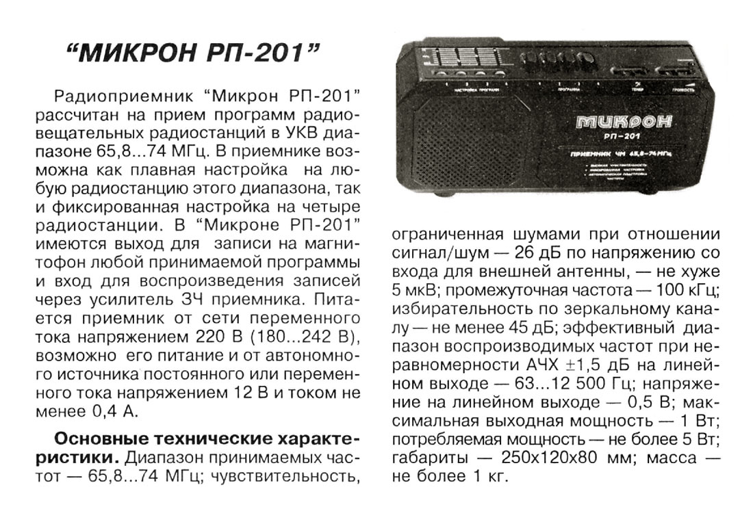 Стационарный транзисторный радиоприёмник *Микрон РП-201* с начала 1993 года выпускал завод имени Фрунзе, город Нижний-Новгород. Радиоприёмник **Микрон РП-201** выпускался для местностей не имеющих проводного трансляционного обычного или трёхпрограммного радиовещания или которое прекратило работу по экономическим причинам. Приёмник имеет высокую чувствительность и обеспечивает уверенный приём вещательных УКВ радиостанций в городской черте или сельской местности за счет пассивного или активного включения прилагаемой антенны. Электропитание осуществляется от сети переменного тока или от внешнего источника 12 В. Фиксация любых 4-х программ с последующим выходом на них простым нажатием кнопки, делает приёмник удобным в эксплуатации. Приёмник характеризует очень низкая потребляемая мощность, весьма низкий уровень шума и фона. Технические характеристики: Диапазон частот 65.8...74,0 Мгц. Чувствительность с пассивной антенны 20 мкВ, с активной 5 мкВ. Диапазон воспроизводимых частот по звуковому давлению 315...6300 Гц. ПЧ 76 кГц. Максимальная выходная мощность 0,5 Вт. Потребляемая мощность 5 Вт. Габариты радиоприёмника 250х120х80 мм. Масса 1 кг.
