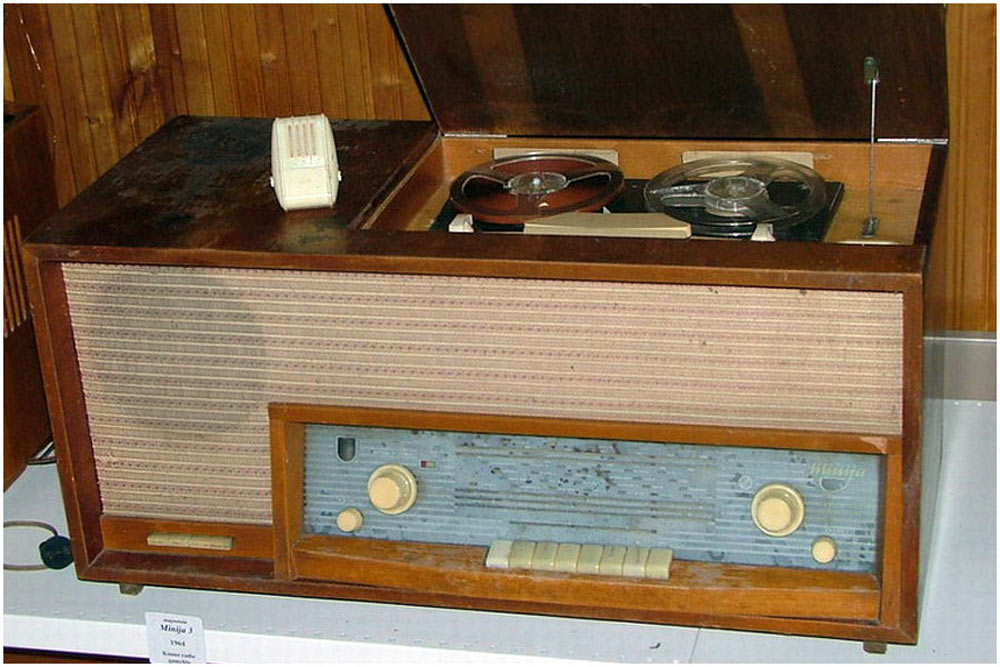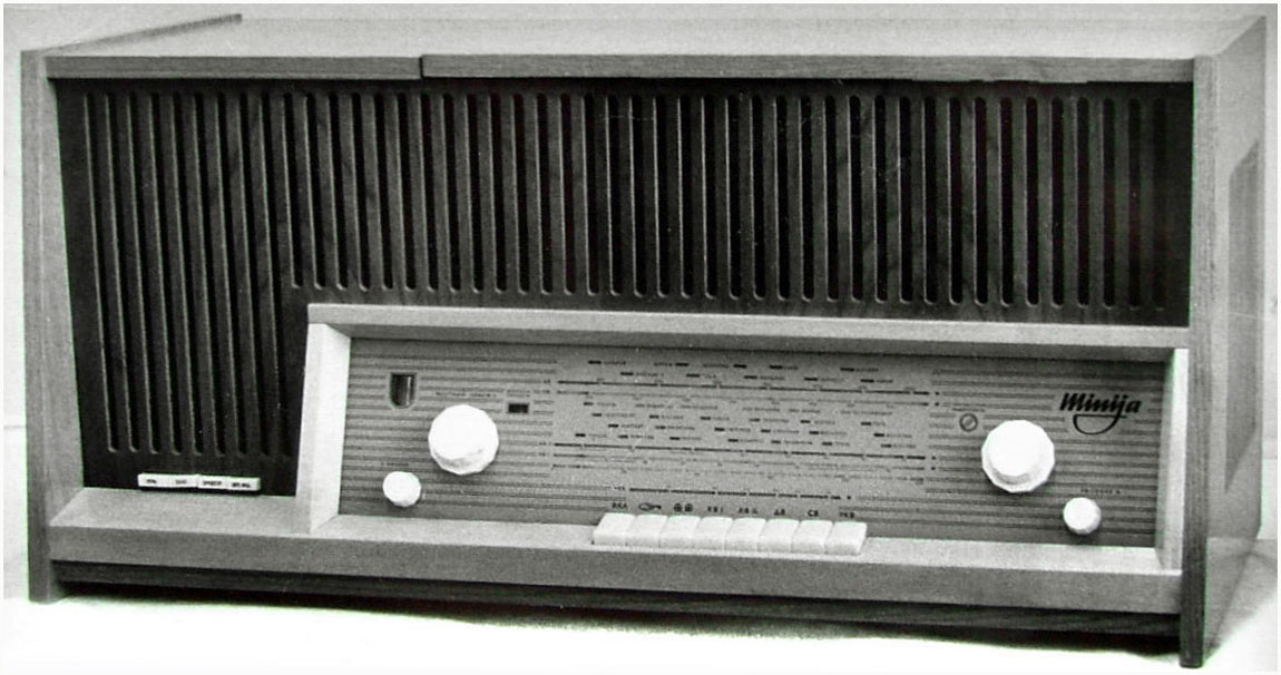 Сетевая ламповая магнитола *Миния-3* с I-кв 1964 года выпускал Каунасский радиозавод. *Миния-3* это модернизированный вариант магнитолы **Миния-2**. Магнитола представляет собой восьмиламповый приёмник 1-го класса, объединённый с магнитофонной панелью типа **Вильняле**. Магнитола служит для приёма радиостанций в диапазонах ДВ, СВ, КВ и УКВ-ЧМ, а также для записи или воспроизведения речевых и музыкальных программ. Скорости протяжки магнитной ленты 19,05 см/сек и 9,53 см/сек. Время непрерывной записи при ёмкости катушек в 350 метров и скорости 19,05 см/сек - 30 минут, при скорости 9,53 см/сек около одного часа на каждой дорожке. Номинальная выходная мощность усилителя около 1,5 Вт. Чувствительность 3 мв от микрофона и 200 мв от звукоснимателя. Рабочий диапазон частот на скорости 19,05 см/сек - 40...12000 гц, 9,53 - 63...10000 гц. Полоса пропускания тракта НЧ и АС 40...12000 гц. Коэффициент нелинейных искажений 5%. Относительный уровень помех -40 дб. Коэффициент детонации 0,3% на скорости 9,53 см/сек. Частота генератора тока стирания и подмагничивания 55 кгц. Потребляемая мощность при работе приёмника 85 вт, магнитофона 125 вт. Размеры магнитолы 826х404х377 мм. Масса 29 кг. Магнитола размещена в деревянном декоративном ящике. Под верхней крышкой расположена МП, где находятся подкатушники, блок головок, ручки переключения скорости, рода работы, уровня записи, кнопка временный стоп, индикатор уровня записи, гнездо микрофона. На передней стенке, под шкалой приёмника находится клавишный переключатель диапазонов, регулятор громкости и тембров. АС состоит из двух громкоговорителей типа 4ГД-28 расположенных на передней панели слева, и одного бокового 1ГД-28. На задней стенке находятся гнёзда антенн, заземления, внешнего громкоговорителя, звукоснимателя и выхода сигнала. Там же находится переключатель сети и предохранители. Магнитола выпускалась в настольном и напольном вариантах.