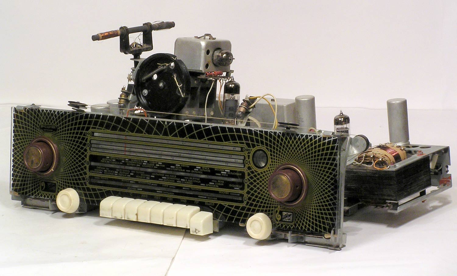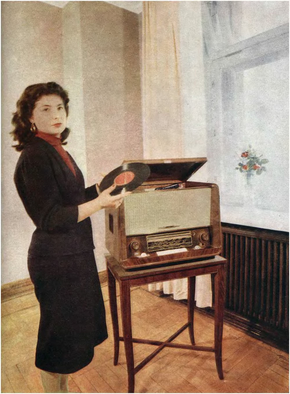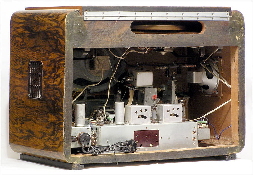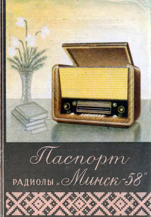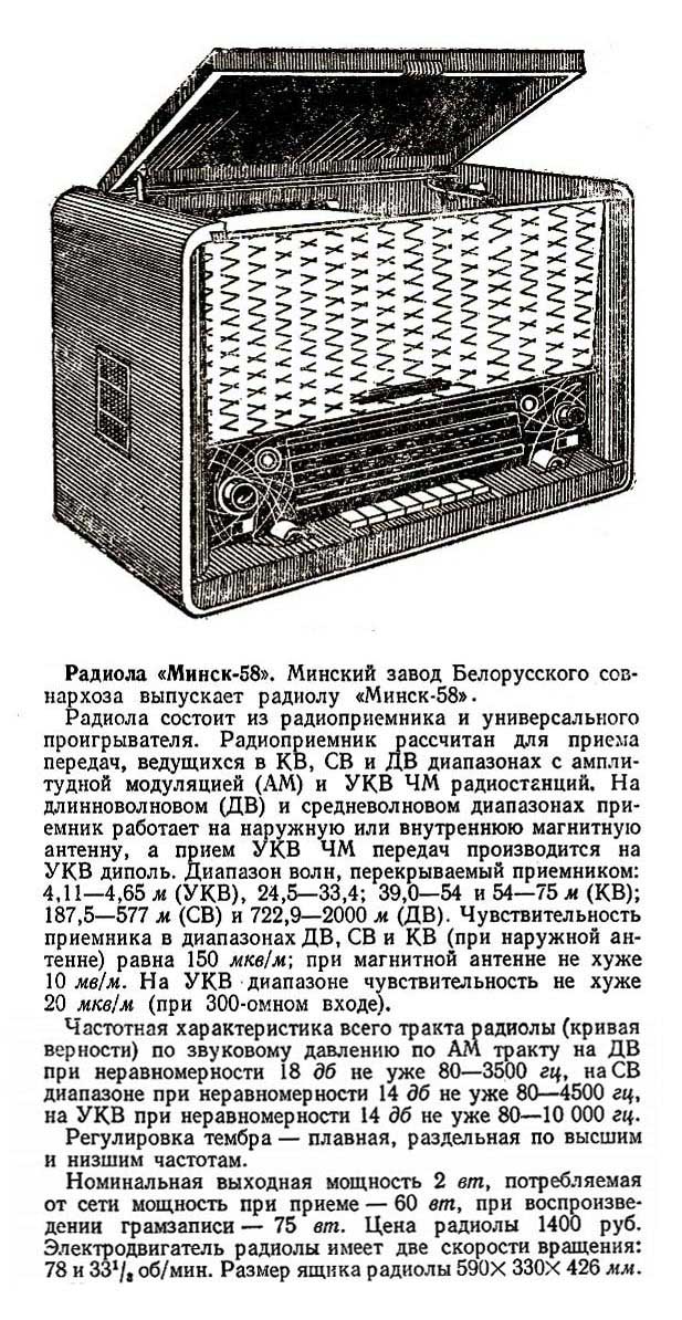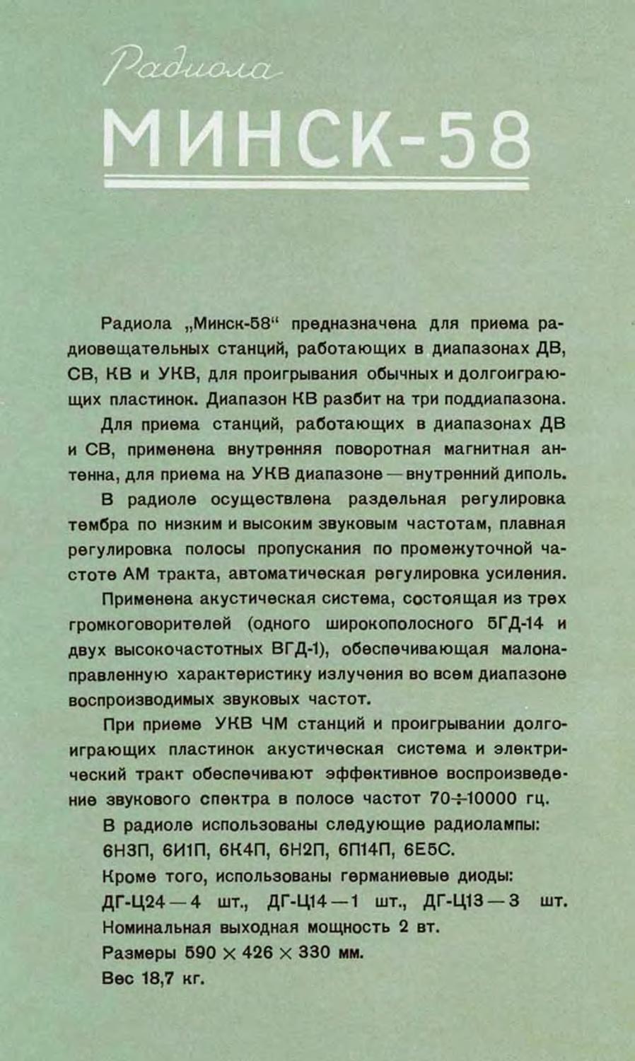 Радиола сетевая ламповая *Минск-58* с 1958 года выпускалась на Минском радиозаводе. Радиола **Минск-58** предназначена для приёма радиовещательных станций, работающих в диапазонах: ДВ, СВ, KB, УКВ, а также для проигрывания обычных и долгоиграющих пластинок. Диапазон KB разбит на 3 поддиапазона. Для приёма в диапазоне ДВ, СВ применена внутренняя поворотная магнитная антенна, для приёма в УКВ-ЧМ диапазоне внутренний диполь. В радиоле осуществлена раздельная и плавная регулировка тембра по низким и высоким звуковым частотам, плавная регулировка полосы пропускания по промежуточной частоте в AM тракте (от 3,5 до 18 кГц), автоматическая регулировка усиления. Акустическая система радиолы состоит из 3-х громкоговорителей, одного широкополосного 5ГД-14 и двух высокочастотных ВГД-1, обеспечивающая малонаправленную характеристику излучения во всем диапазоне воспроизводимых звуковых частот. При приёме УКВ-ЧМ станций и проигрывании долгоиграющих пластинок акустическая система радиолы и её электрический тракт обеспечивают эффективное воспроизведение звукового спектра в полосе звуковых частот - 70...10000 Гц. В радиоле применены следующие радиолампы: 6Н3П, 6И1П, 6К4П, 6Н2П, 6П14П, 6Е5С. Номинальная выходная мощность усилителя низкой частоты 2 Вт. Размеры радиолы - 590х426х330 мм. Вес 18 кг.