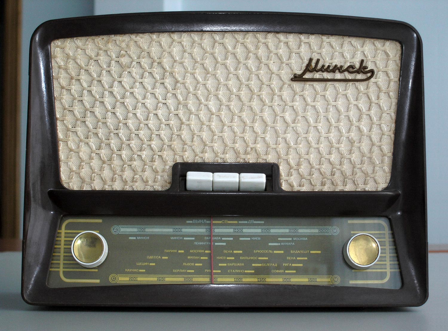 Стационарный транзисторный радиоприёмник *Минск-Т* с 1959 года выпускал Минский радиозавод. *Минск-Т* - экспериментальные модели в двух вариантах внешнего оформления. Приёмников первого варианта было выпущено около 10 тысяч, второго несколько экземпляров. Считается что **Минск-Т** - первый в СССР стационарный транзисторный приёмник. У приёмника были и наименования **Минск-1**, **Минск Т-60**. **Минск Т-60** получил Высшую награду Всемирной выставки в Нью-Йорке в марте 1960 года. В серийное производство пошёл приёмник первого варианта, в большей степени в дереве с отличиями в схеме и под наименованием **Минск**. Позже приёмник **Минск-Т** выпускался тоже в дереве, это был тот-же **Минск**, но с приставкой для питания от сети. По оформлению опытные модели опередили своё время и что бы поставить их на конвейер для массового производства требовались значительные изменения технологического процесса и денежные ресурсы, к чему радиопромышленность СССР была не готова. Радиоприёмник **Минск-Т** (М-1, Т-60) представляет собой супергетеродин, выполненный на 7 плоскостных полупроводниковых триодах. Диапазоны: ДВ - 150...415 кгц и СВ - 520...1600 кгц. Чувствительность с наружной антенной в диапазоне ДВ 100 мкВ, СВ 70 мкВ, при работе с внутренней магнитной антенной на ДВ 1,5 мВ/м; СВ 0,8 мВ/м. Ослабление помехи по соседнему и по зеркальному каналам 26 дБ в диапазоне ДВ и 20 дБ в диапазоне СВ. Максимальная выходная мощность 0,4 Вт. Диапазон воспроизводимых звуковых частот 200...3500 гц. Питание осуществляется от 6 элементов *Сатурн* или от сети переменного тока, через выносной или встроенный БП.