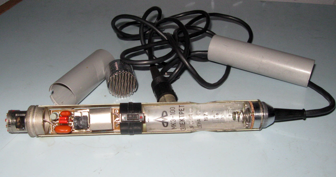 Микрофон конденсаторный электретный *МКЭ-100* (Электрет) выпускался предположительно с 1977 года несколькими предприятиями страны.