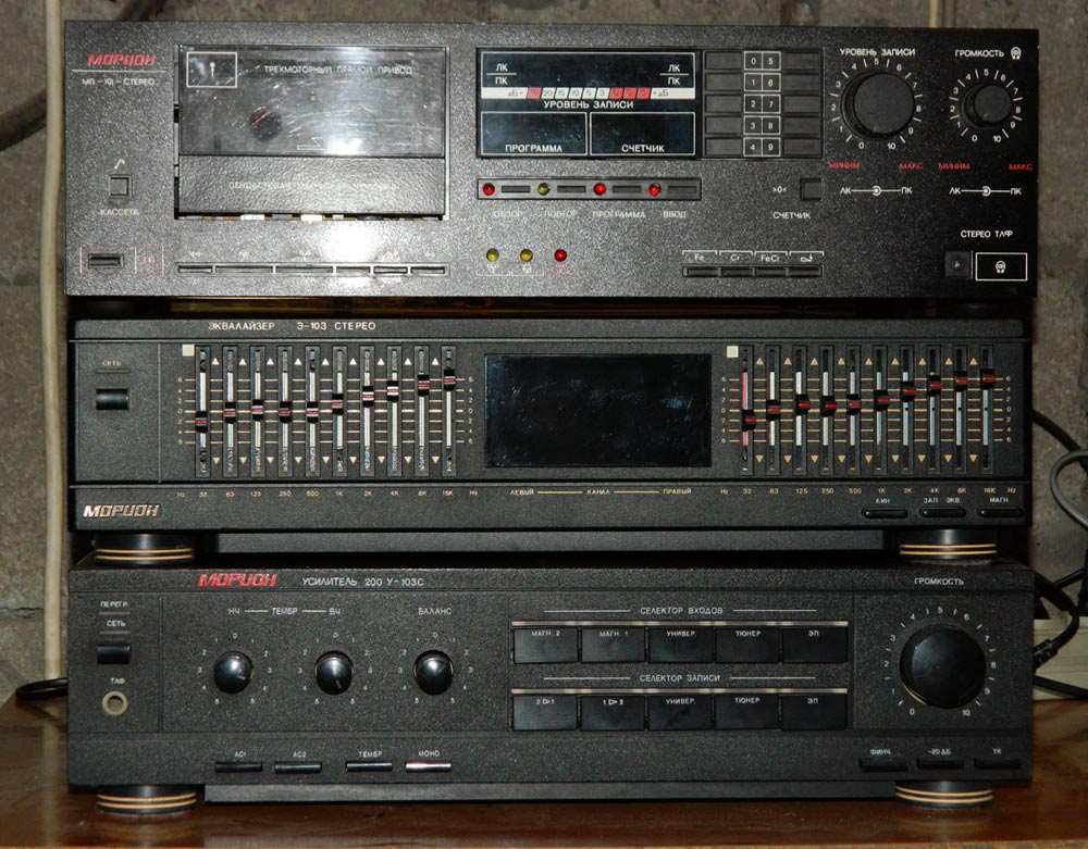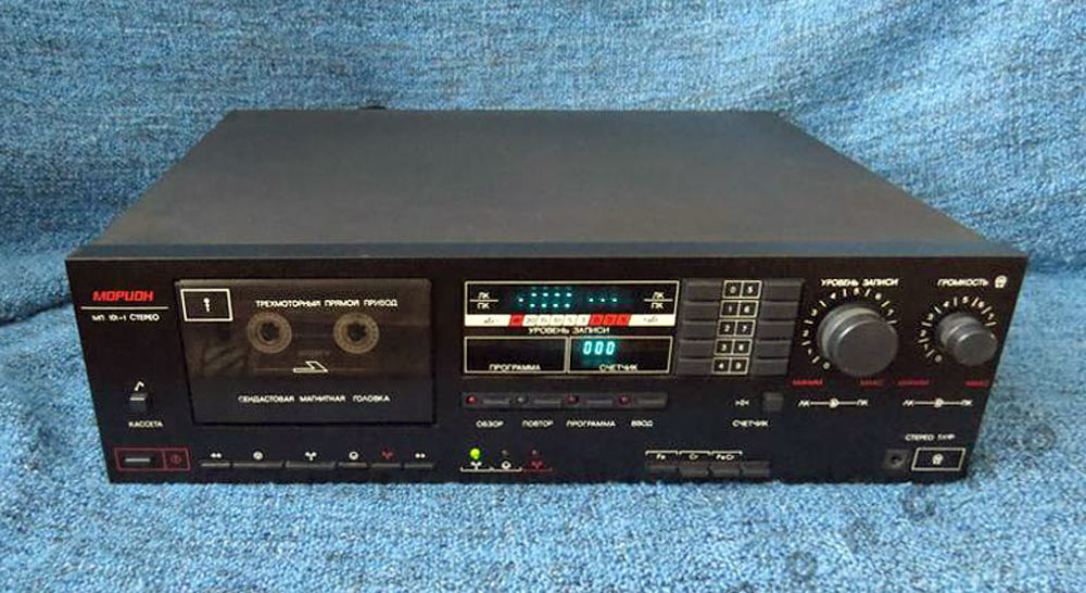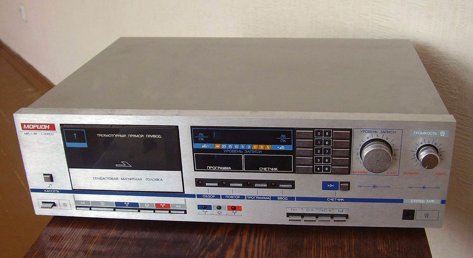 Кассетный магнитофон-приставка *Морион МП-101-стерео* с 1987 года выпускал Пермский завод аппаратуры дальней связи. МП 1-й группы сложности **Морион-101-стерео** построен на базе МП **Вега МП-120-стерео** и предназначен для высококачественной записи на магнитную ленту фонограмм и их воспроизведения через стереофонические телефоны и внешнее УКУ с АС. В модели применено псевдосенсорное управление режимами работ, имеется автостоп, электронный счётчик расхода ленты, компандерный шумоподавитель, программатор для воспроизведения заранее выбранных фрагментов фонограммы с индикацией их номера, предусмотрена возможность работы в режиме обзор. В МП применена сендастовая магнитная головка. Скорость протяжки ленты 4,76 см/сек. Коэффициент детонации 0,15%. Диапазон частот звука при использовании ленты **Fe** - 40...14000 гц, **Cr** - 31,5...16000 Гц. Уровень шумов и помех в канале З/В -56 дБ. Габариты МП - 430х320х120 мм, масса 7,5 кг. Цена 500 рублей. МП работала и в комплексе, состоящим из эквалайзера *Морион Э-103-стерео* и усилителя *Морион 200У-103-стерео*. С начала 1993 года магнитофон-приставка выпускалась с упрощениями под наименованиями *Морион МП-101-1-стерео* без шумоподавителя и *Морион МП-101-2-стерео* без шумоподавителя и блока для програмирования.