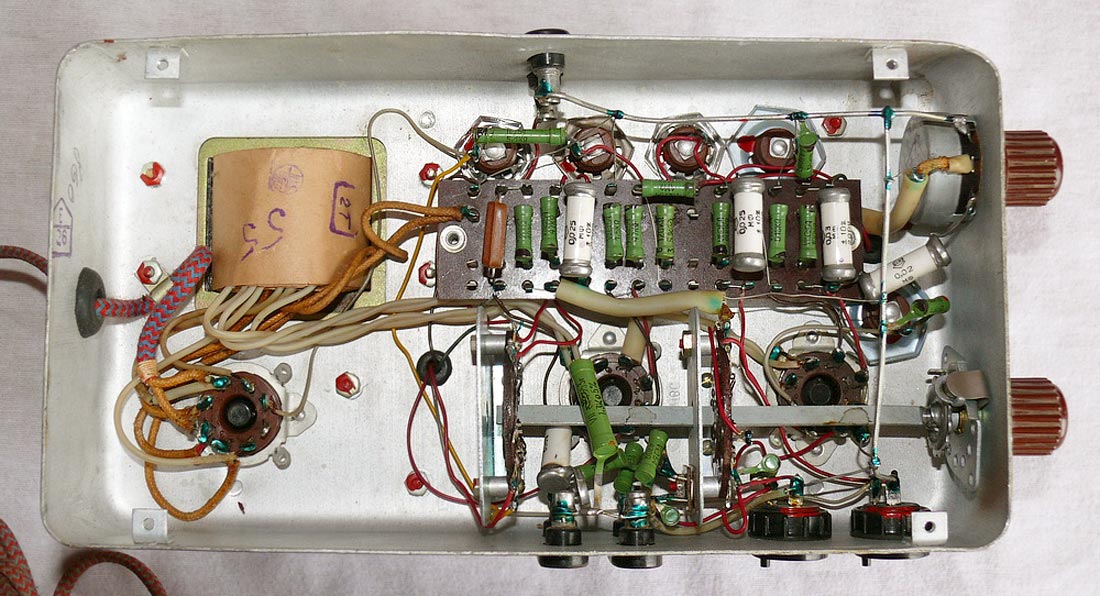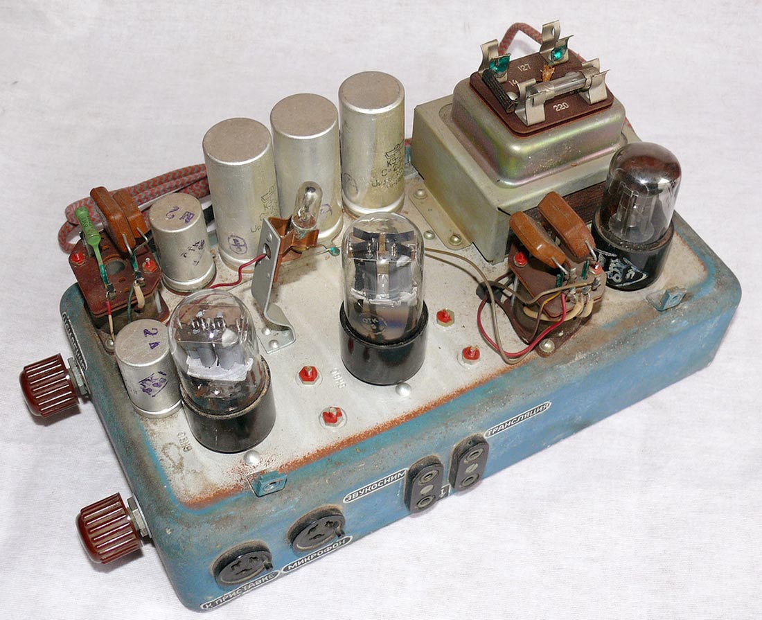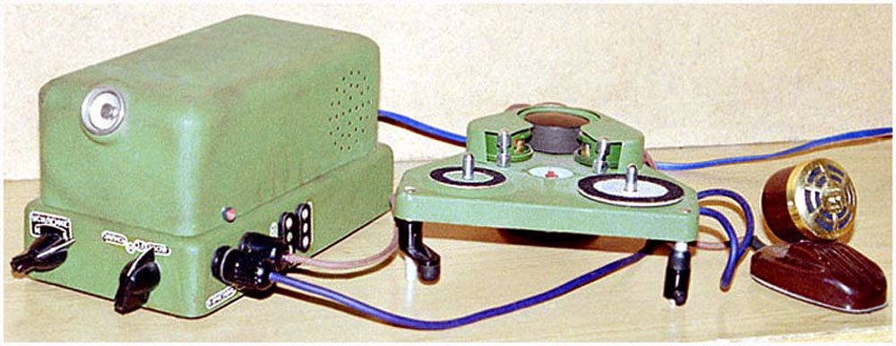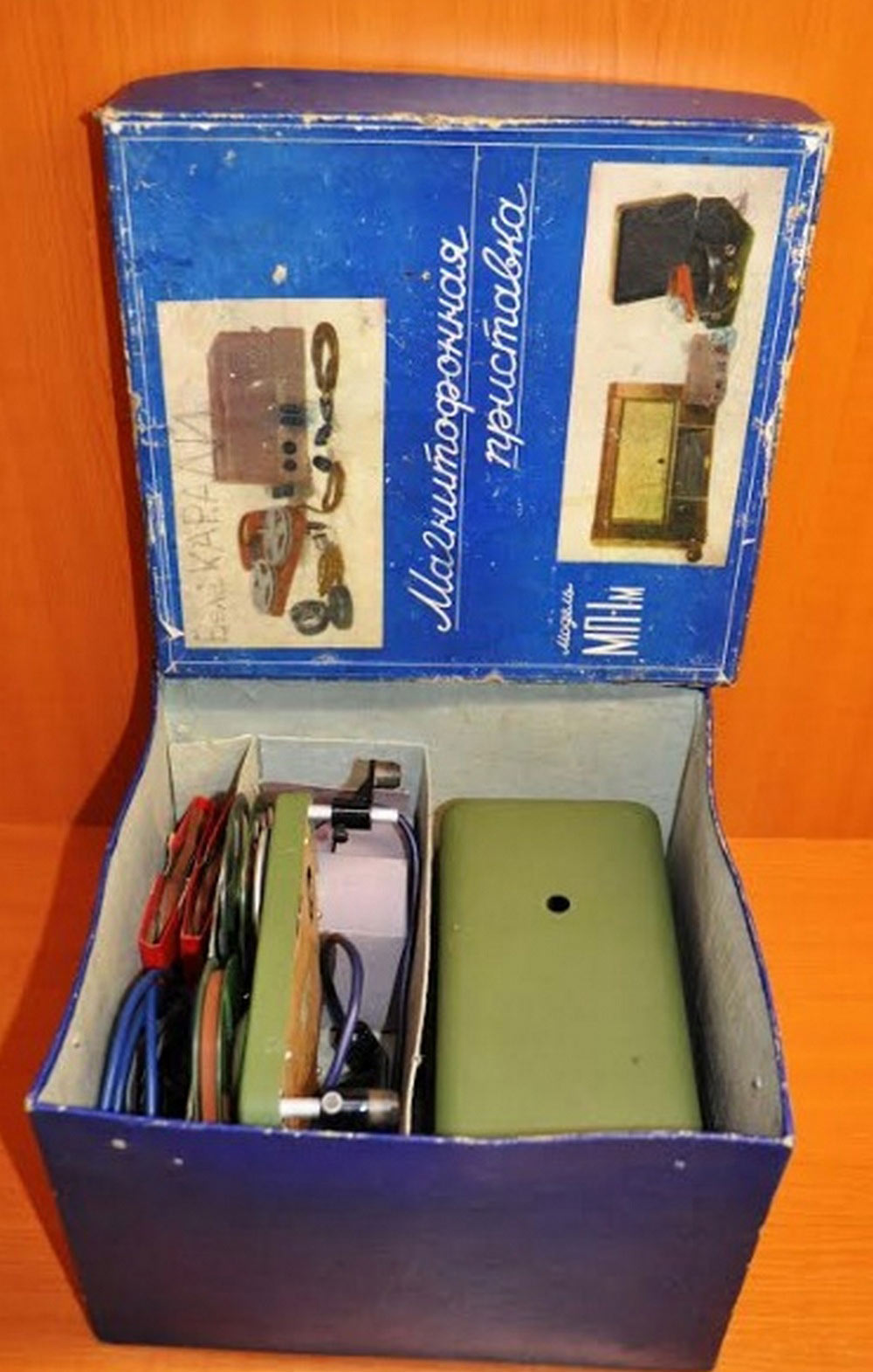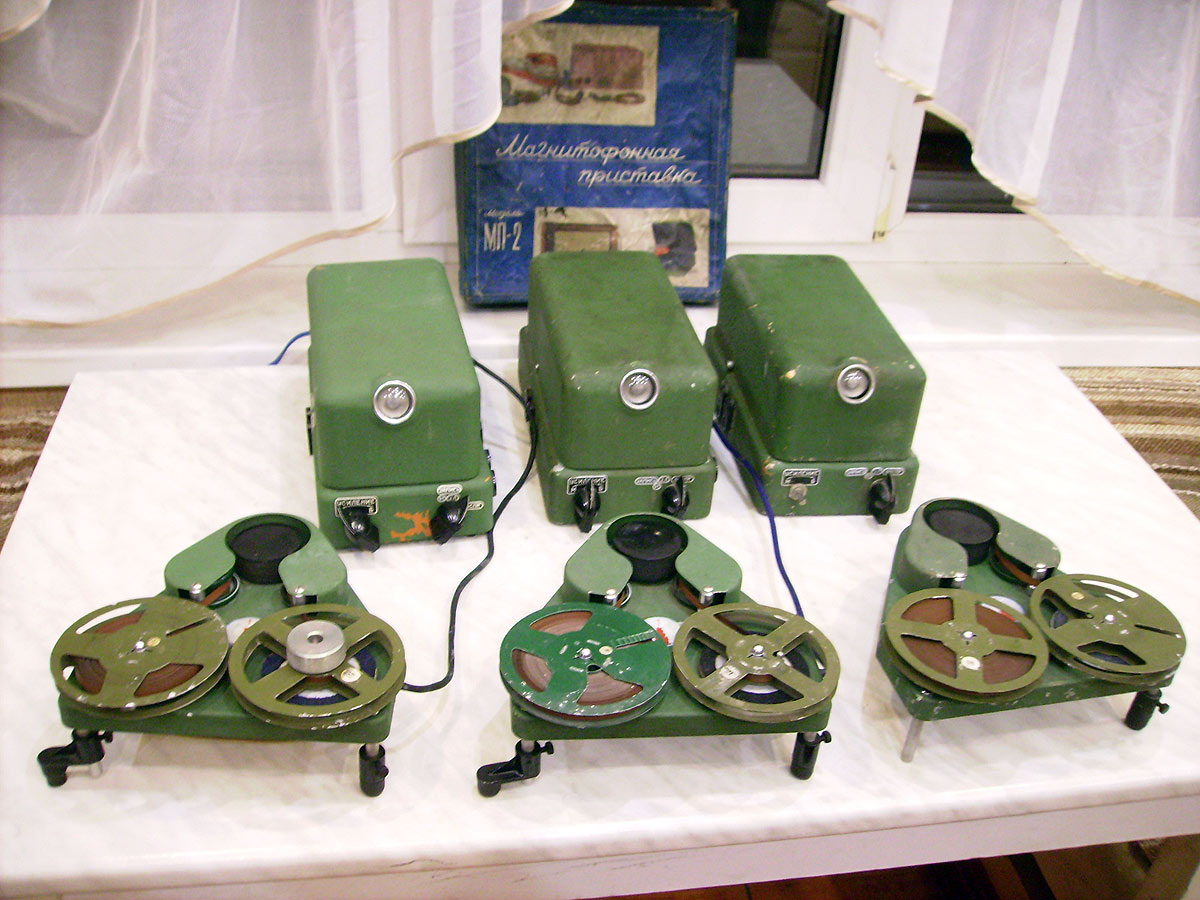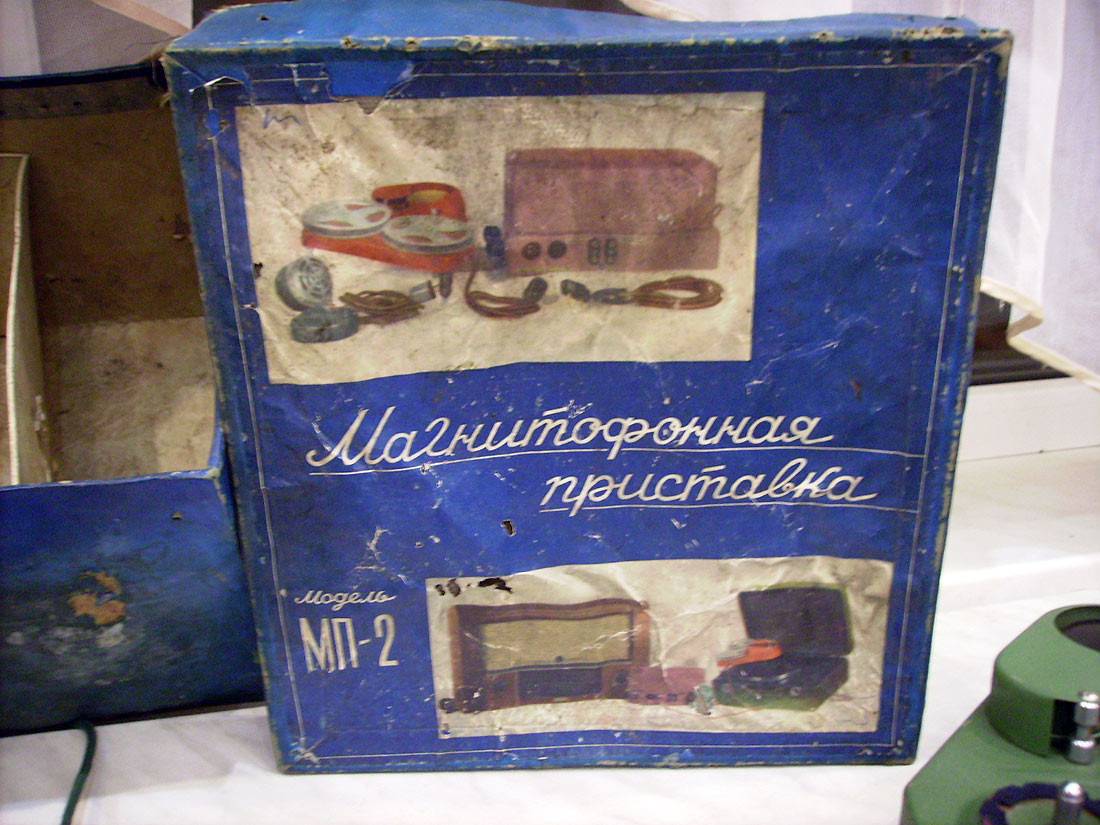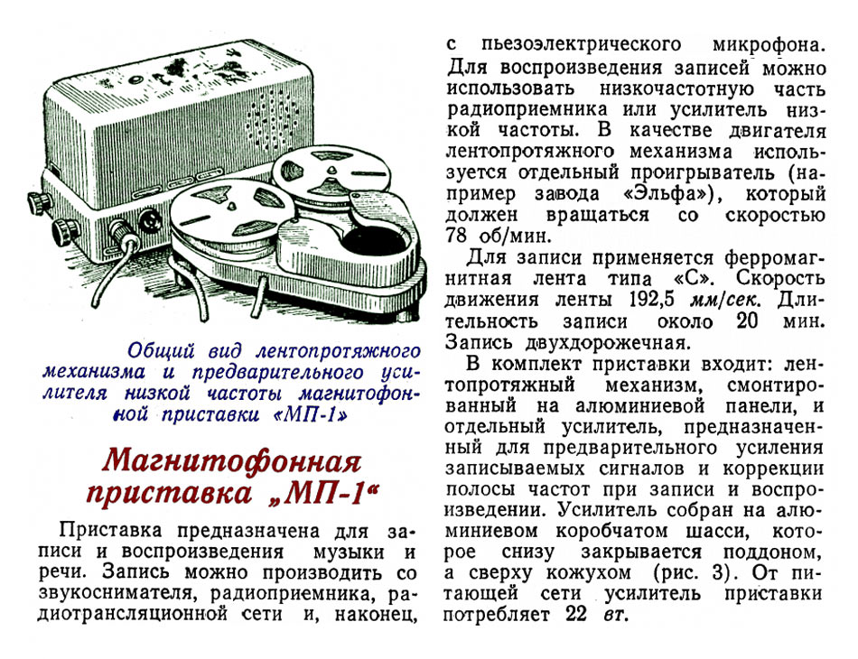 Магнитофонные приставки *МП-1* и *МП-2* соответственно с 1954 и 1957 года выпускал Московский прожекторный завод. Магнитофонная приставка **МП-1** является устройством для двухдорожечной записи и воспроизведения звука, работающее совместно с проигрывателем и приёмником имеющим вход для подключения звукоснимателя. Приставка **МП-1** обеспечивает запись со звукоснимателя, радиоприёмника, трансляционной сети, пьезоэлектрического микрофона, воспроизведение сделанных записей через приёмник или усилитель. В качество носителя используется ферромагнитная лента типа *С*. Номинальная скорость звуконосителя 19,25 см/сек при условии, что диск проигрывателя имеет скорость 78 оборотов в минуту. Номинальный уровень выходного сигнала 1,0 В. Полоса записываемых и воспроизводимых частот 100...5000 Гц. Длительность записи на oдной кассете около 20 минут. Собственные шумы приставки в 50...70 paз меньше номинального выходного уровня. Приставка питается от сети переменного тока 127 или 220 В. Приставка не имеет индикатора уровня записи, из-за чего надо было сделать несколько пробных фрагментов, прежде чем приступить к записи. Заводом выпущено около 60 тысяч приставок.