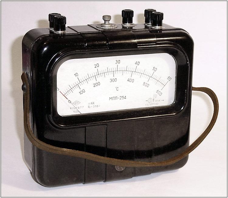 Измеритель температуры *МПП-254* выпускали с I-кв 1956 года. Прибор в комплекте с выносным до одного метра датчика температуры и блока питания позволяет измерять температуру от нуля до 600 градусов цельсия с точностью 1 градус на пределе от 0 до 100 градусов и 10 градусов на пределе от 100 до 600 градусов.