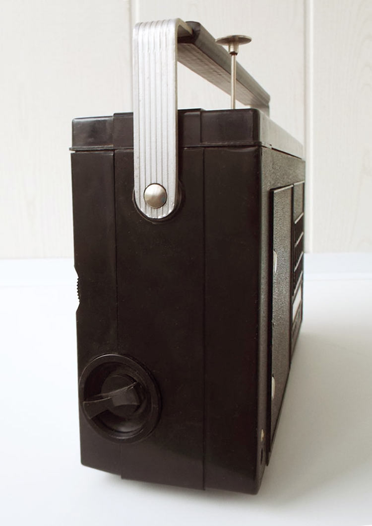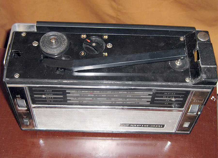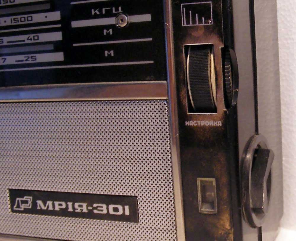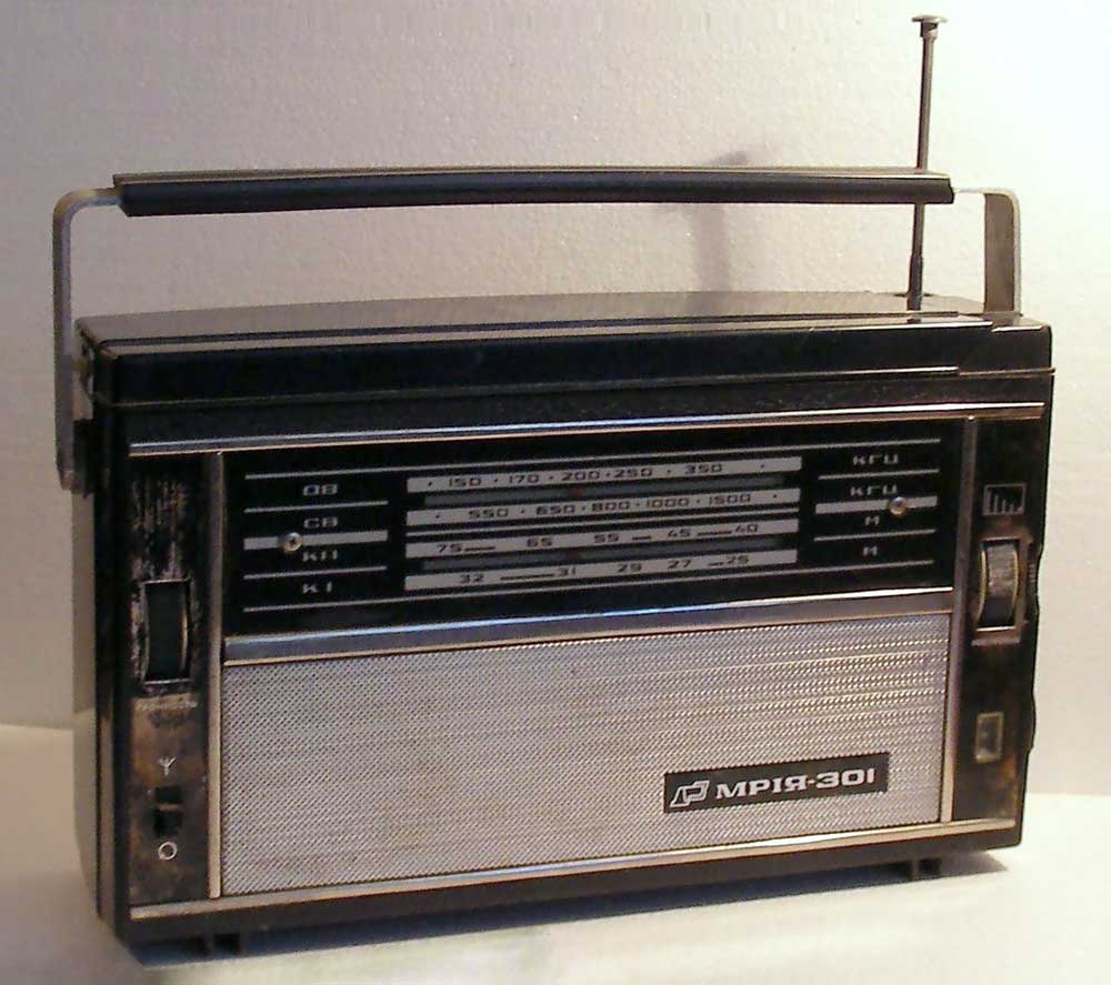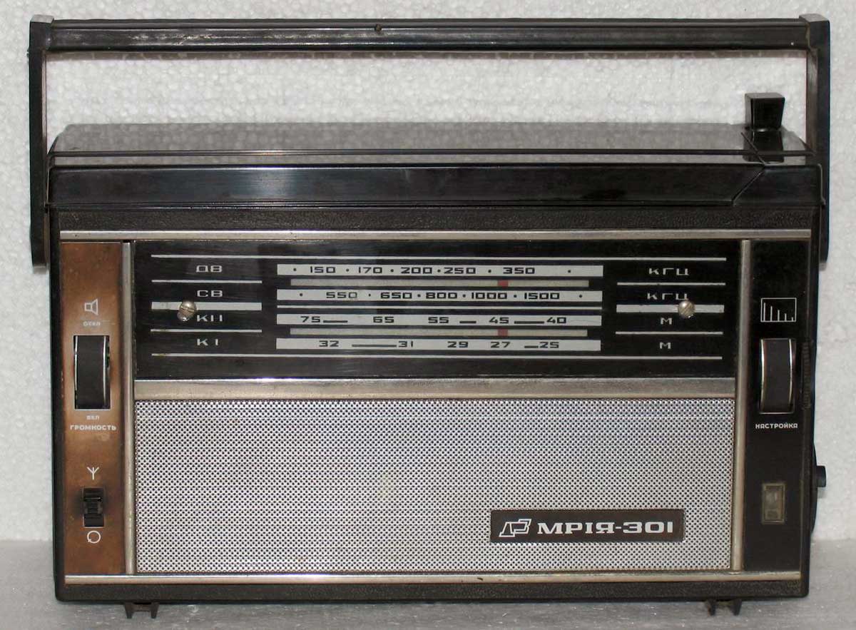 Портативная транзисторная радиола 3-го класса *Мрия-301* с 1971 выпускалась Днепропетровским радиозаводом. **Мрия-301** - радиола на 9 транзисторах и 2 диодах с электропроигрывающим устройством типа ЭПУ-6-9В. Диапазоны принимаемых волн: ДВ, СВ, КВ-1 - 31...25 м и КВ-2 - 75...41 м. В диапазоне КВ приём ведется на штыревую (телескопическую) антенну. Максимальная чувствительность при выходной мощности 50 мВт: на ДВ 500 мкВ/м, СВ 200 мкВ/м, КВ 30 мкВ. Реальная чувствительность на ДВ 1,5 мВ/м, СВ 0,8 мВ/м и КВ 100 мкВ. Избирательность по соседнему каналу: на ДВ, СВ не менее 40 дБ. Ослабление зеркального канала на ДВ - 30, СВ - 26, КВ - 12 дБ. Действие АРУ: при изменении входного сигнала на 26 дБ, выходное напряжение изменяется на 6 дБ. Полоса воспроизводимых звуковых частот 300...3500 Гц. Номинальная выходная мощность, при КНИ всего тракта приёмника не более 5% - 250 мВт. Среднее звуковое давление в полосе воспроизводимых звуковых частот 0,3 Па. Источник питания: шесть элементов типа 373. Напряжение питания 9 В. Ток, потребляемый приёмником, при отсутствии сигнала 15 мА. Работоспособность радиоприёмника сохраняется при снижении напряжения питания до 4 вольт. Длительность работы приемника при средней громкости от одного комплекта элементов типа 373: не менее 100 ч. Электропроигрывающее устройство имеет 3 частоты вращения диска: 33; 45 и 78 об/мин. Ток, потребляемый электродвигателем не более 85 мА. Габариты радиолы 288 х 117 х 90 мм. Масса с батареями 3 кг.