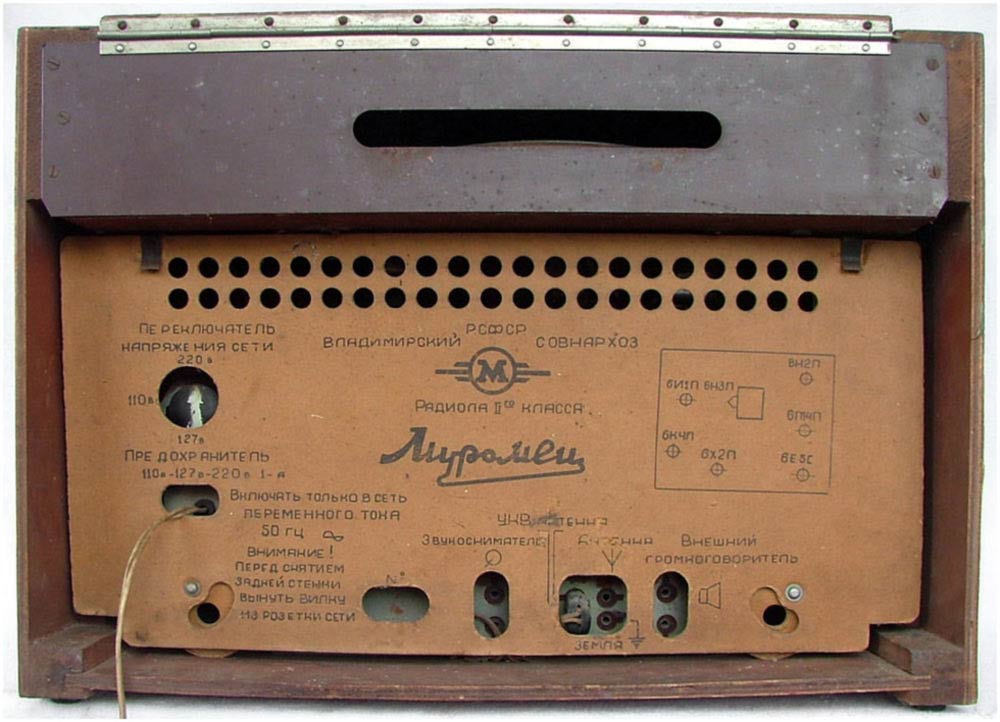 Радиола сетевая ламповая *Муромец* с 1957 года выпускалась на Муромском заводе РИП. Радиола **Муромец** создана на базе радиолы **Байкал** Бердского радиозавода и по конструкции и электрической схеме совпадает с ней. Радиола производилась для увеличения числа наименований бытовой радиоаппаратуры в стране. Радиола имеет шестиламповый приёмник 2-го класса, совмещённый с универсальным двухскоростным электропроигрывателем в общем футляре. Внешнее оформление радиолы **Муромец** незначительно от личается от базовой радиолы **Байкал**. В радиоле **Муромец** вместо громкоговорителей 1ГД-5 с 1959 года устанавливали громкоговорители типа 2ГД-3 или 2ГД-3Р, при этом диапазон частот при проигрывании пластинок и при приёме в ЧМ расширился до 80...8000 Гц. Потребляемая мощность при работе ЭПУ - 70 Вт. Габариты радиолы 340хх520х368 мм. Её масса 19 кг. Цена модели 87 рублей 95 копеек после денежной реформы 1961 года.