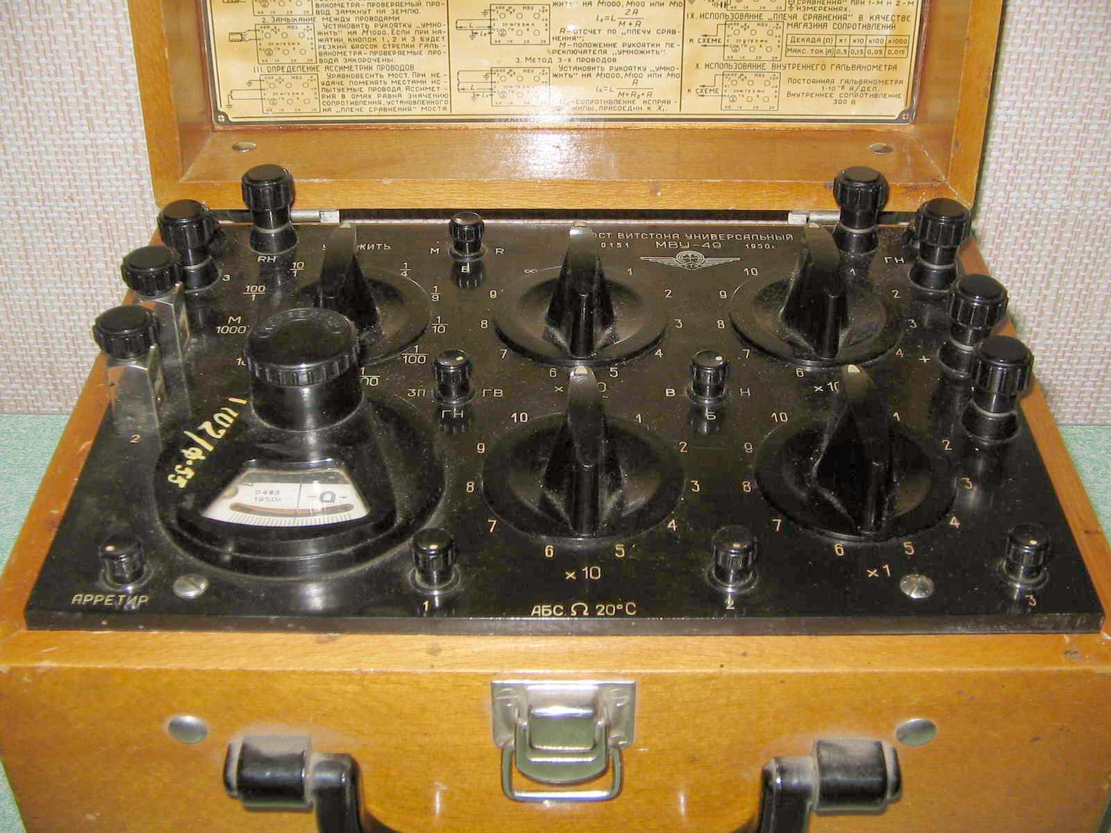 Мост постоянного тока *МВУ-49* выпускался с 1950 года. Мост предназначен для определения характера и места повреждения в воздушных и кабельных линиях и для измерения сопротивлений на постоянном токе от 10 до 100000 ом с погрешностью ±0,2%. Прибор дает возможность производить следующие виды измерений и испытаний: Измерение сопротивлений на постоянном токе. Определение характера повреждений воздушной или кабельной линии: замыкания на землю; замыкания между проводами. Определение асимметрии проводов. Определение места замыкания одного провода на землю: по способу трех измерений; по способу петли; по способу трех проводов. Определение места короткого замыкания между проводами на землю. Определение короткого замыкания между проводами. Определение места обрыва четырёхпроводного кабеля. Определение места обрыва провода воздушной линии. Кроме того, возможно: использование плеча сравнения моста в качестве магазина сопротивлений; использование внутреннего гальванометра моста отдельно в качестве нулевого прибора.