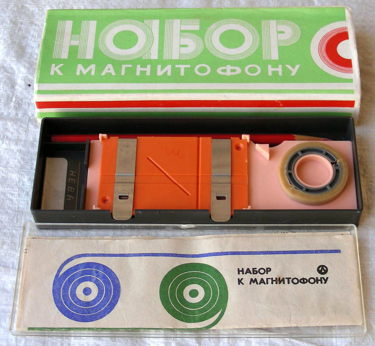 Набор ракордов к магнитофоным лентам под наименованием *Набор к магнитофону* предположительно с 1976 года выпускал Ленинградский электромеханический завод *Равенство*. Набор к магнитофону предназначен для подклейки цветных ракордов (немагнитных, обычно лавсановых цветных отрезков) для более полного использования магнитной ленты и предовращения её от потёртости на концах рулонов. Склеивающую ленту из набора можно использовать и для механического монтажа фонограмм. Все ракорды и склеивающая лента имеют как и магнитная лента ширину 6,25 мм. Что примечательно, наборы 1976 года имели по 25 метров ракордов каждого цвета, тогда как наборы 1980 года уже имели только по 20 метров. Последние два фото - набор 1980 года.