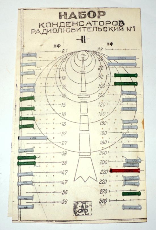 Набор конденсаторов радиолюбительский № 1 выпускался предположительно с 1971 года. В наборе 34 трубчатых конденсаторов, ёмкостью от 9,1 до 300 пф.