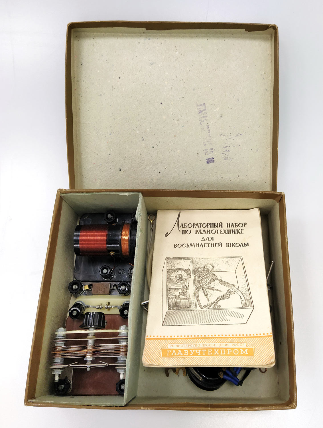 *Набор по радиотехнике* для восьмилетней школы выпускал предположительно с 1967 года завод №4 *Физэлектроприбор*, Москва. В наборе есть все детали, компоненты и узлы для сборки детекторного радиоприёмника на диапазон ДВ и СВ и проведения экспериментов с ним на уроках по физике.