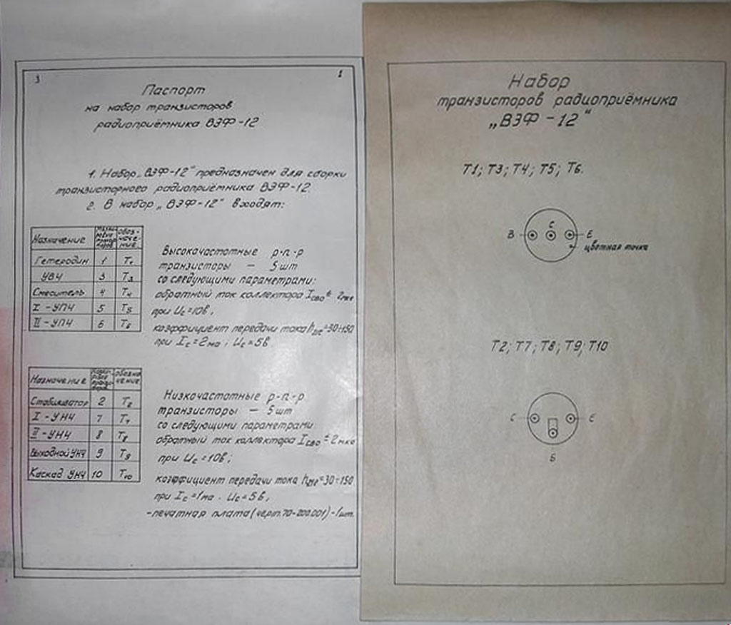 Набор транзисторов радиоприёмника *ВЭФ-12* выпускался с 1968 года. Набор содержит печатную плату для радиоприёмника (полуфабрикат) и 10 транзисторов (5 высокочастотных и 5 низкочастотных) и предназначен для самостоятельной сборки приёмника *ВЭФ-12* с последующей докупкой недостающих компонентов.