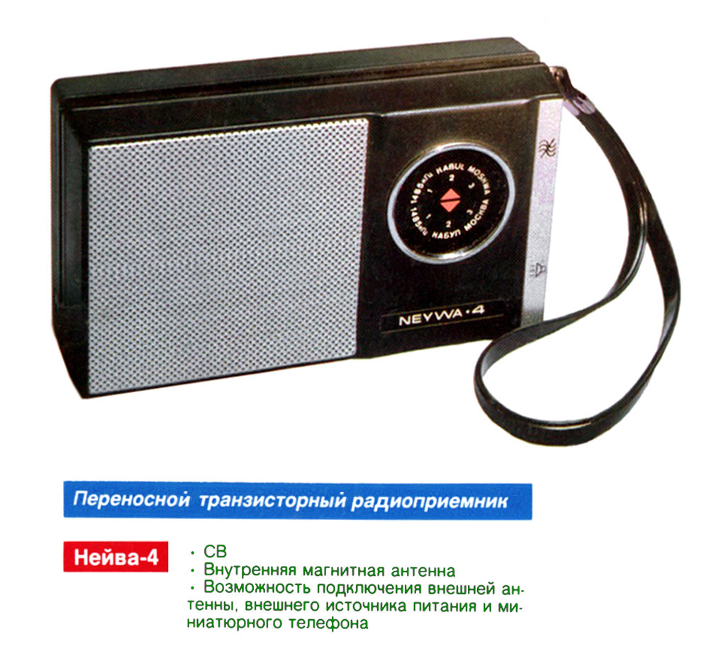 Портативный транзисторный радиоприёмник *Нейва-4* выпускался с 1976 года Каменск-Уральским приборостроительным заводом. Радиоприёмник экспортный, именуется и как *Neywa-4* поставлялся в своё время в Кабул, столицу Афганистана. Приёмник работает в диапазоне средних волн, имеет отмеченную частоту в 1485 килогерц, на которой вещало радио, проповедующее Ислам, а так же передававшее 5 ежедневных обязательных мусульманских молитв. По конструкции, электрической схеме (кроме только одного диапазона), характеристикам радиоприёмник аналогичен модели *Нейва-402* 1975 года выпуска, этого же завода.
