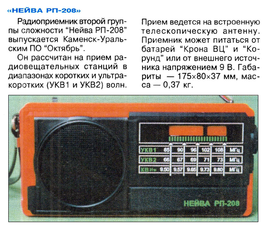 Портативный радиоприёмник *Нейва РП-208* предположительно с 1996 года выпускал Каменск-Уральский ПСЗ (ПО *Октябрь*). Радиоприёмник *Нейва РП-208* предназначен для приёма радиовещательных станций в диапазонах КВ (1) и УКВ (2) волн на телескопическую антенну. Питание осуществляется от батареи *Крона* или внешнего источника питания через специальное гнездо. Корпус приёмника выполнен из ударопрочного полистирола. Диапазоны: УКВ-1 65,8...74 МГц, УКВ-2 87,5...108 МГц, КВ 9,5...9,8 МГц. Чувствительность в УКВ1/2 - 450 мкВ, КВ 100 мкВ. Номинальная выходная мощность 100 мВт, максимальная 200 мВт. Диапазон воспроизводимых звуковых частот в УКВ диапазонах 250...5000 Гц. Габариты радиоприёмника - 165х80х37 мм, его масса 370 гр. Радиоприёмник выпускался заводом около 10 лет, затем выпускался модернизированный вариант *Нейва РП-208-1*, но это уже другая история.