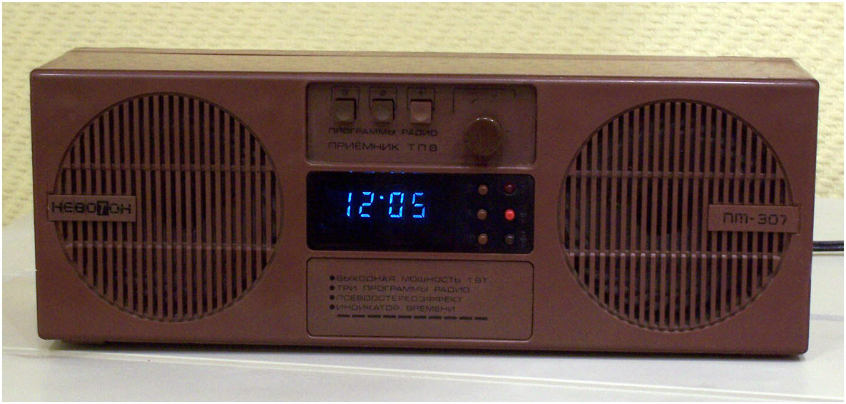 Приёмник трёхпрограммный *Невотон ПТ-307* (305/306) с начала 1988 года выпускало ОАО Владимирский завод *Электроприбор*. Трехпрограммный приёмник (радиотаймер) **Невотон ПТ-307** предназначен для приёма радиопрограмм передаваемых по сетям трехпрограммного вещания, индикации времени или работы в качестве будильника. Он обеспечивает псевдостереофоническое звучание. Имеется возможность включения или выключения ПТ в заданное время. Предусмотрено подключение головных телефонов. ПТ **Невотон ПТ-305 и 306** отличаются таймерами. Основные технические характеристики: номинальный диапазон частот при приёме 1-й программы 160...10000 Гц, 2-й, 3-й программ 160...6300 Гц. Номинальная выходная мощность 1 Вт, потребляемая мощность 8 Вт. ПТ сохраняет работу при изменениии напряжения сети от 198 до 242 В. Средний суточный уход часов 20 сек. Время работы батарей резервного питания при отсутствии сети двое суток. Размеры любого ПТ 310х113х87 мм.Масса без упаковки 1,75 кг.