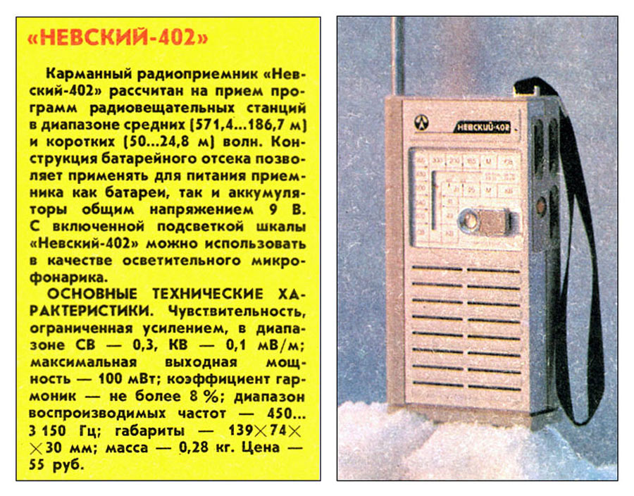 Портативный малогабаритный радиоприёмник *Невский-402* с 1987 года выпускал Ленинградский приборостроительный завод *Равенство*. РП **Невский-402** создан на основе серийного радиоприёмника **Невский-401** и по техническим параметрам с ним совпадает. Из особенностей РП - подсветка шкалы и фонарик.