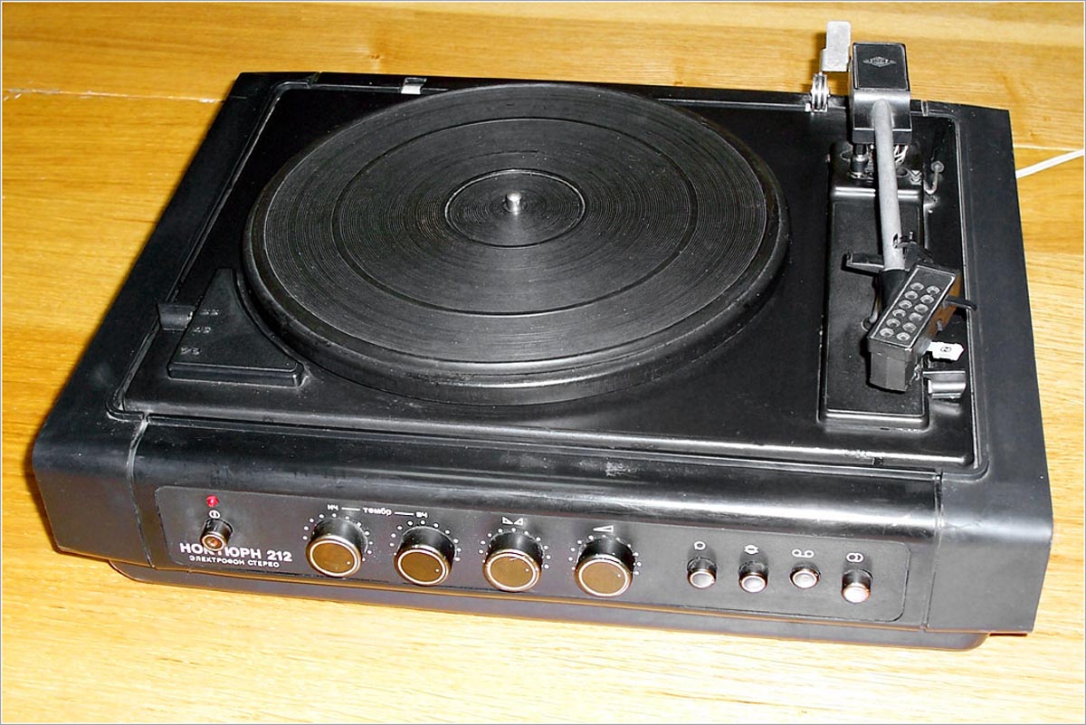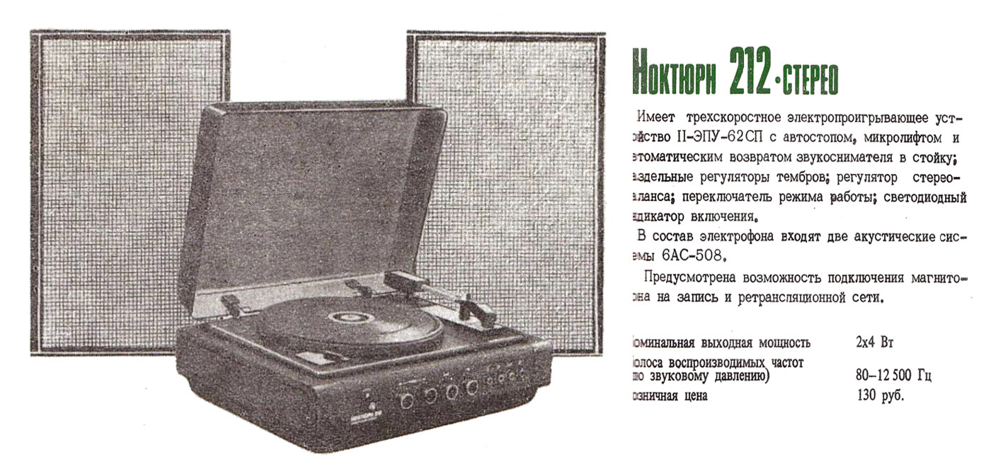 Электрофон сетевой транзисторный *Ноктюрн-212-стерео* с I-кв 1981 года выпускал Грозненский радиотехнический завод. Стереофонический электрофон 2-й группы сложности **Ноктюрн-212 стерео** состоит из 3-х скоростного 78, 45, 33 об/мин ЭПУ с автостопом и микролифтом и УЗЧ с раздельными тембрами по НЧ и ВЧ, регулятором стереобаланса и кнопочным переключателем работ. Усилитель ЗЧ нагружен на две АС типа 6АС-518. Наряду с функцией воспроизведения записи с грампластинок всех форматов электрофон можно было использовать как усилитель внешних сигналов. Максимальная выходная мощность модели 2х7 Вт. Номинальный диапазон частот звука - 40...16000 Гц. Чувствительность усилителя с ЭПУ и магнитофона 0,2...0,25 В, радиотрансляционной линии 10...30 В. Коэффициент гармоник около 1,5 %. Уровень фона -46 дБ. Потребляемая от электрической сети мощность 40 Вт. Сопротивление АС - 8 Ом. Габариты основного блока 405х345х160 мм. Масса сАС - 9 кг.