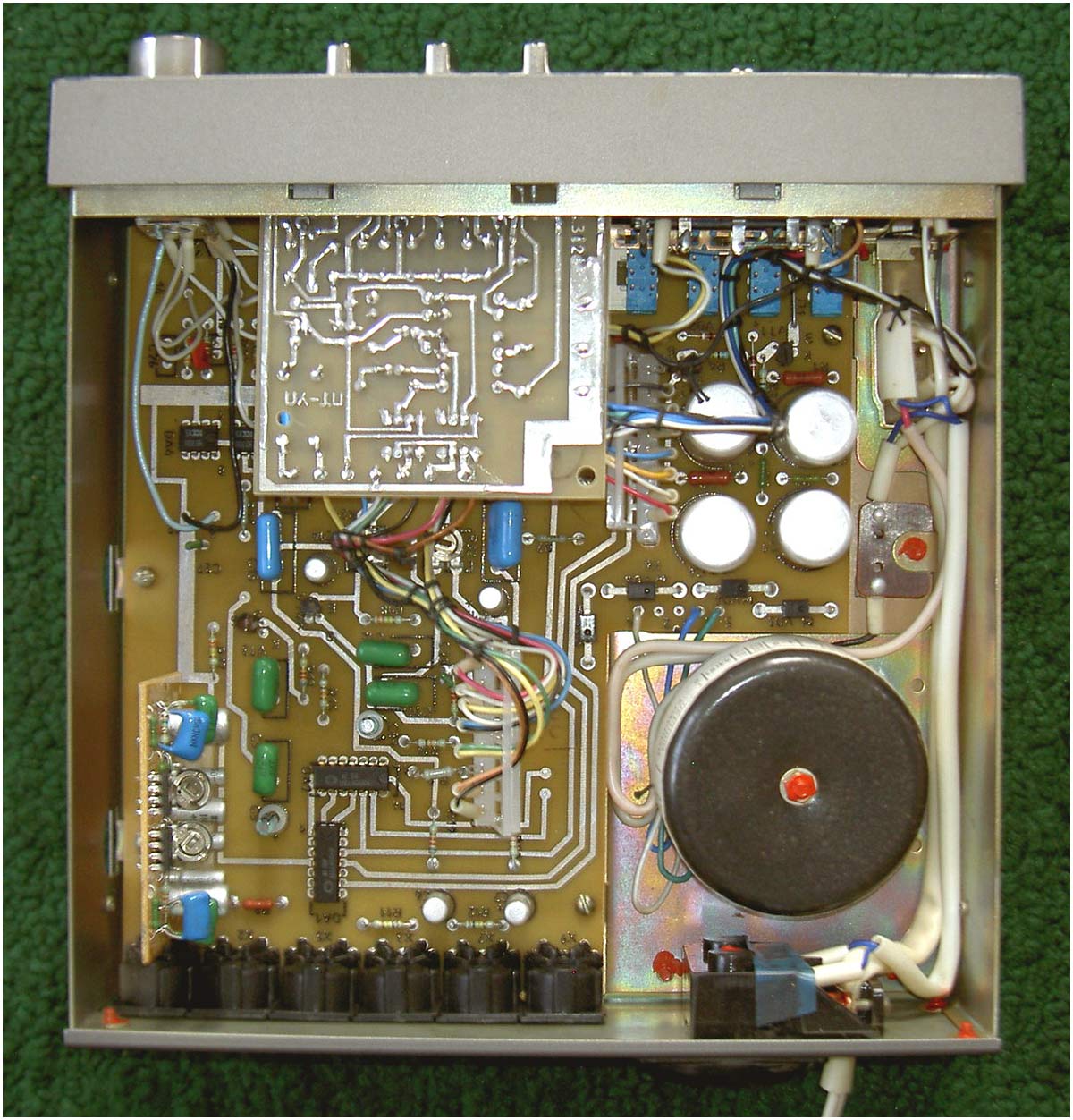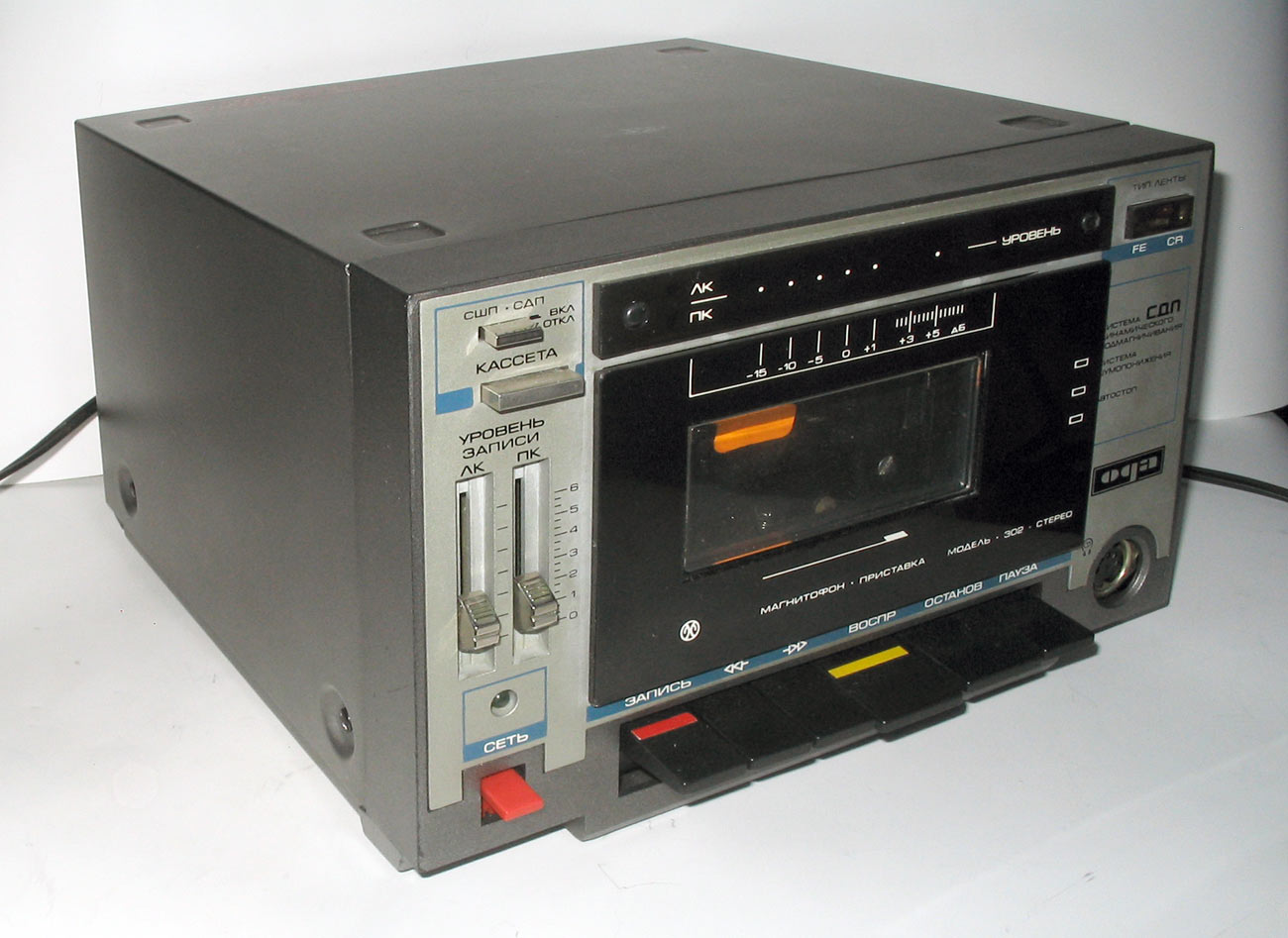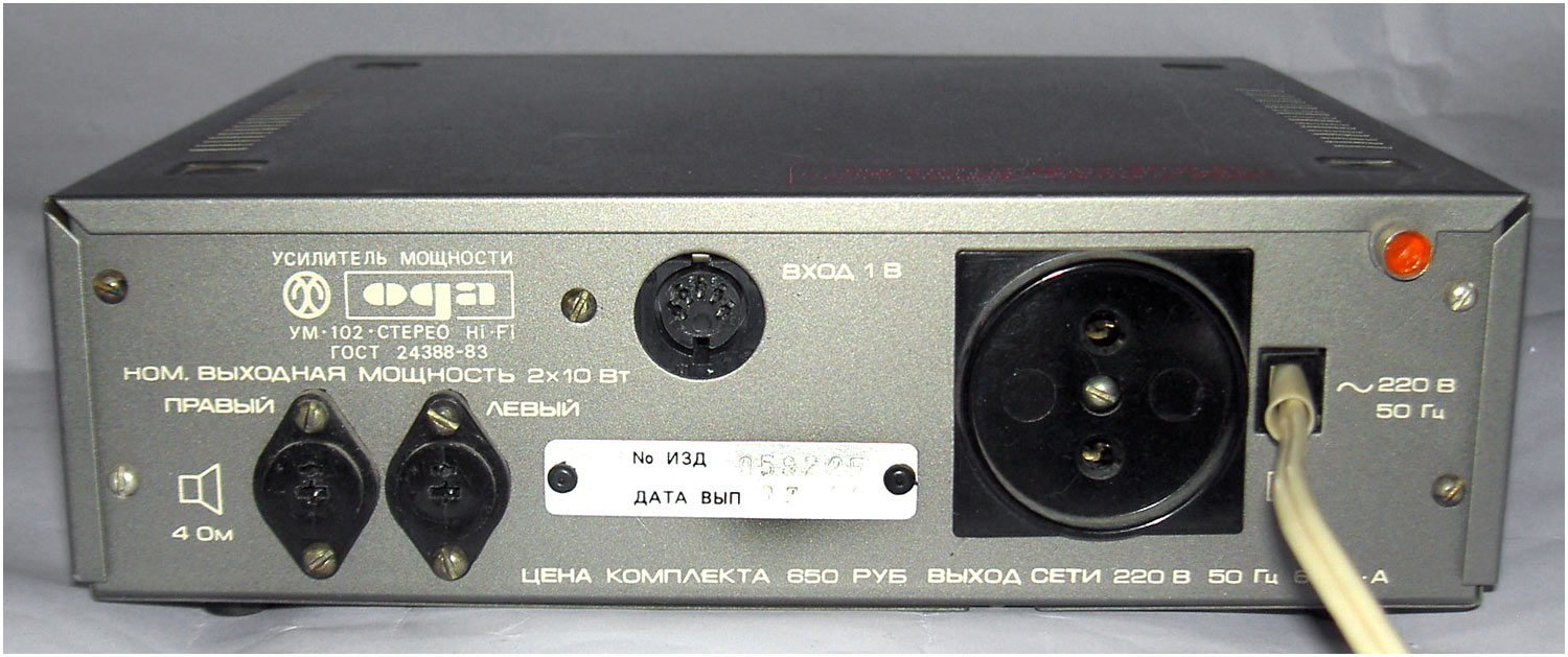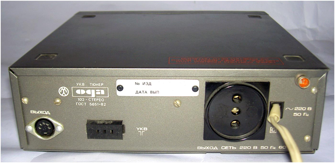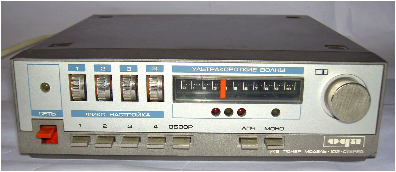 Стереофонический радиокомплекс *Ода-102-стерео* с 1986 года выпускал Муромский завод РИП. Комплекс обеспечивает приём моно и стереопередач в диапазоне УКВ, запись моно и стереофонических программ, с последующим воспроизведением. Комплекс состоит из 5-ти функционально законченных блоков; УКВ тюнера **Ода-102С**, кассетного магнитофона-приставки **Ода-302С**, усилителя мощности **Ода УМ-102С**, предварительного усилителя **Ода УП-102С** и 2-х акустических систем **15АС-213**. Комплекс имеет четыре фиксированные настройки; автоматическую подстройку частоты и бесшумную настройку; светодиодные индикаторы точной настройки и приёма стереопрограмм; автоматическое переключение режимов **моно-стерео**; систему ШП; переключатель типов ленты со световой индикацией; счётчик расхода ленты; автостоп при окончании ленты в кассете или неисправности кассеты; 3-х полосный регулятор тембра, отключаемую тонкомпенсацию; ступенчатое ослабление громкости; светодиодную индикацию перегрузок; электронную защиту от КЗ. Предусмотрена возможность подключения внешних сигналов. Выходная мощность (4 Ома): номинальная 2х10 Вт, максимальная 2х25 Вт. Входное сопротивление акустической системы 4 Ом. Напряжение питания 220 В. Потребляемая мощность тюнера 4,5 Вт, магнитофона-приставки 7 Вт, усилителя мощности 34...100 Вт, усилителя предварительного 10 Вт. Габариты одного блока: тюнера, УМ и УП - 223х245х75 мм, магнитофона-приставки 220х144х247 мм, одной акустической системы 160х178х265 мм. Масса тюнера 2,2 кг, магнитофона-приставки 3,5 кг, УМ 3,6 кг, УП 2 кг, одной АС 5,5 кг. Типы магнитной ленты А4206-3; А4212-3Б. Скорость магнитной ленты 4,76 см/с. Чувствительность тюнера в диапазоне УКВ-ЧМ 4 мкВ. Диапазон рабочих частот тракта ЧМ 31,5...15000 Гц, магнитной записи с применением ленты типа А4206-3 40...12500 Гц, А4212-3Б 40...14000 Гц, усилительно-акустического устройства 20...20000 Гц. Коэффициент детонации ±0,2%. Коэффициент НЛИ тракта приёма 2%, тракта ЗЧ в диапазоне 20...20000 Гц 0,3%, на ЛВ МП 4%.