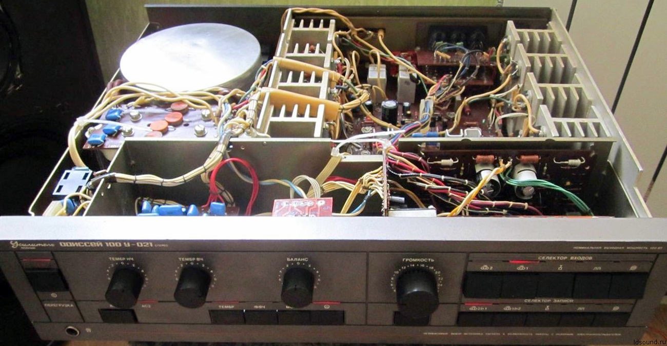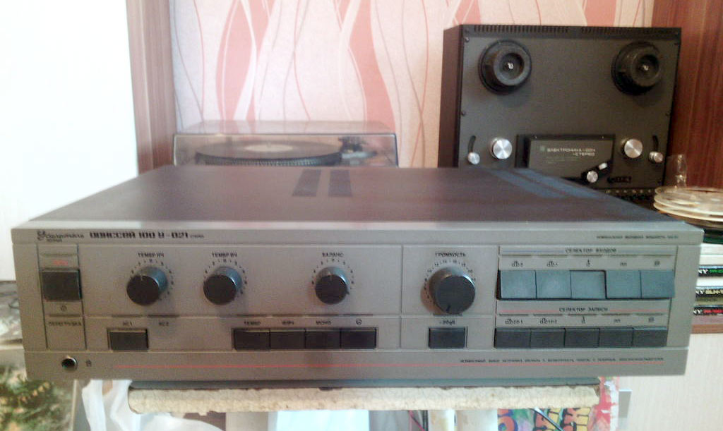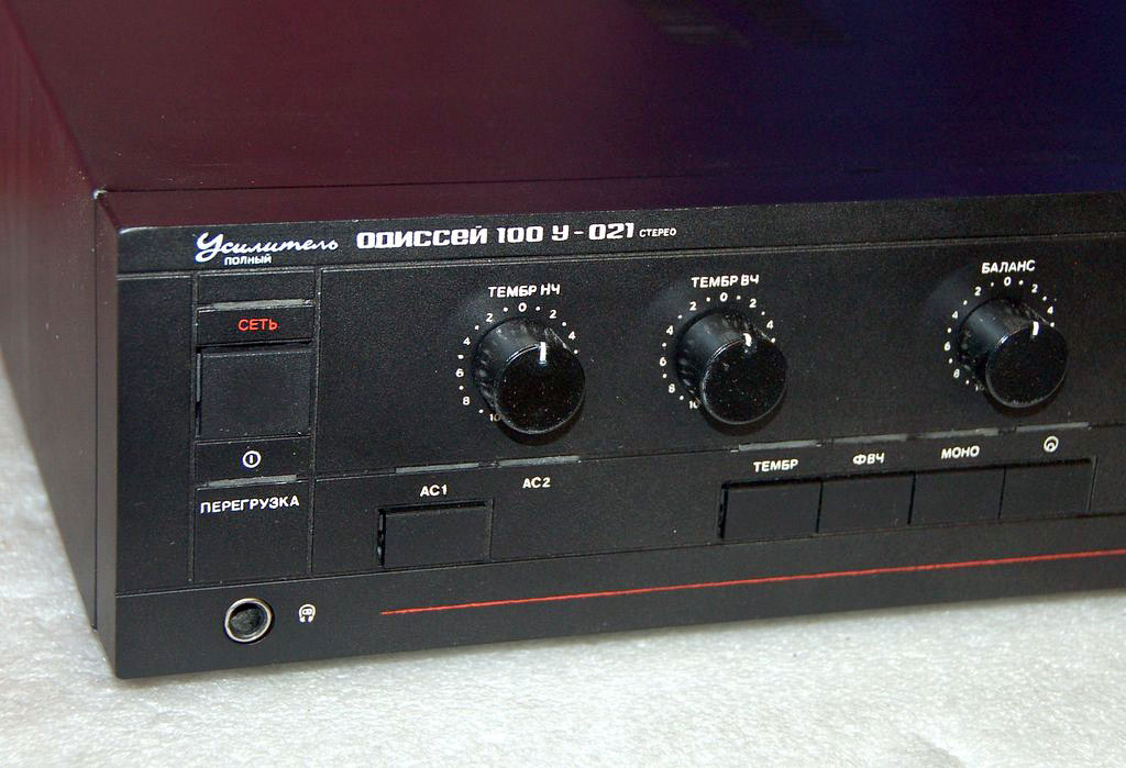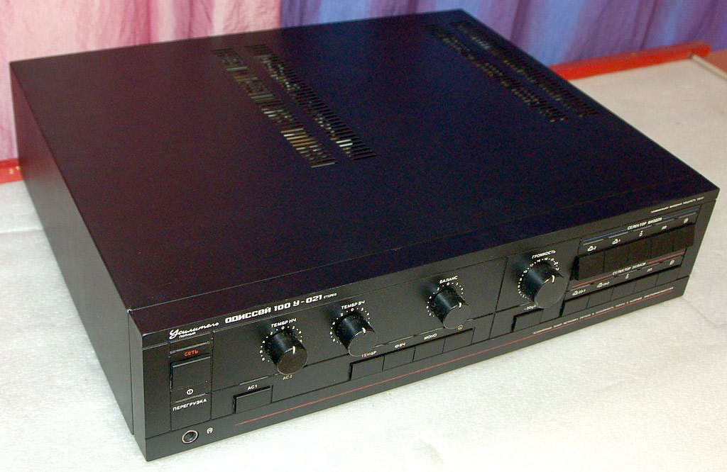 Усилитель звуковой частоты полный *Одиссей 100У-021-стерео* выпускался с 1992 года Киевским заводом *Радиоприбор* ПО имени С.П.Королёва. Предназначен для двухканального усиления сигналов звуковой частоты от электропроигрывателя, тюнера, магнитофона, лазерного проигрывателя и другой бытовой радиоэлектронной аппаратуры. Состоит из четырех функциональных блоков: Предварительный усилитель; Усилитель мощности; Блок питания; Коммутационное устройства. Усилитель обеспечивает регулирование громкости, тембра, баланса, тонкомпенсации, микширования, переключения моно-стерео, перезапись с магнитофона на магнитофон, запись с лазерного проигрывателя. Имеется возможность подключить к усилителю одновременно все виды радиоэлектронной аппаратуры. В усилителе предусмотрена защита выходов от короткого замыкания в нагрузке, защита АС от постоянного напряжения на выходе, их отключение при неисправности и перегреве. Технические характеристики: Диапазон частот - 10...40000 Гц. Номинальная выходная номинальная мощность - 2х100 Вт, при сопротивлении АС - 8 Ом. Общие гармонические искажения - 0,007 %. Отношение сигнал/шум - 95 дБ. Потребляемая мощность - 450 Вт. Габаритные размеры усилителя - 430х375х110мм. Масса - 14 кг.