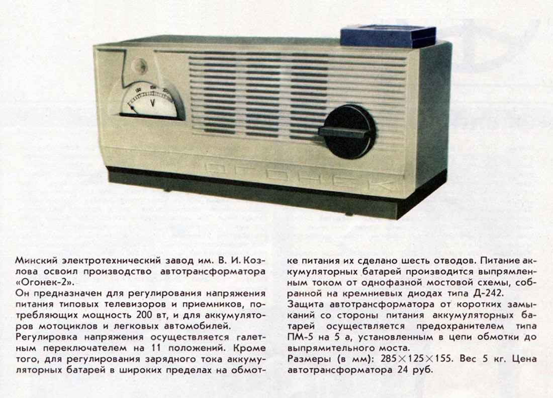 Автотрансформатор *Огонек-2* с 1970 года выпускал Минский электротехнический завод им. В.И.Козлова. Автотрансформатор служит для поддержания напряжения телевизоров, радиоприёмников и другой бытовой радиотехники, потребляемая мощность которой не более 200 Вт. Автотрансформатор так же служит для зарядки аккумуляторов легковых автомобилей и мотоциклов емкостью до 50 А/ч и подходит для питания различных приборов бытового назначения напряжением от 6 до 12 В мощностью не более 50 Вт. На верхней панели корпуса АТР вмонтирован амперметр М-4202, а на боковой вольтметр Ц-24М. На передней панели расположена ручка для регулирования напряжения.