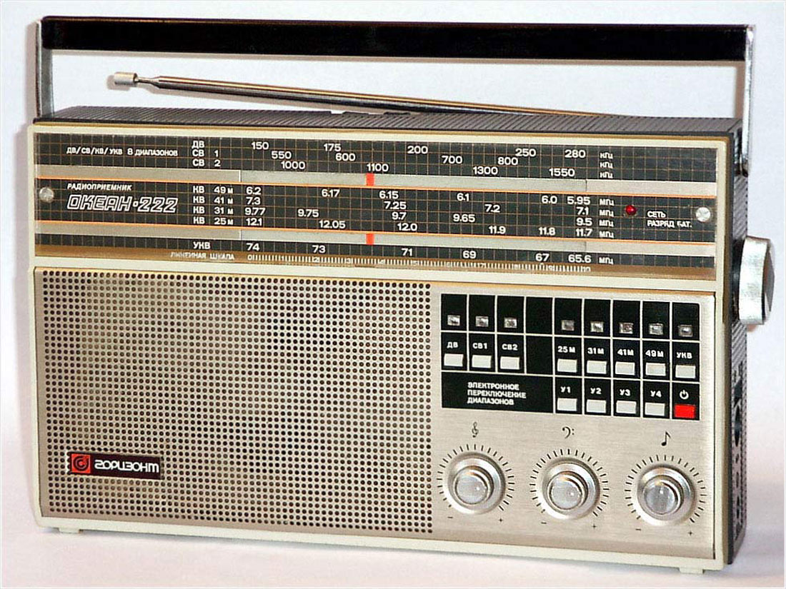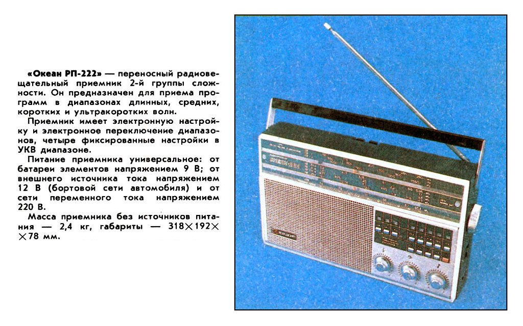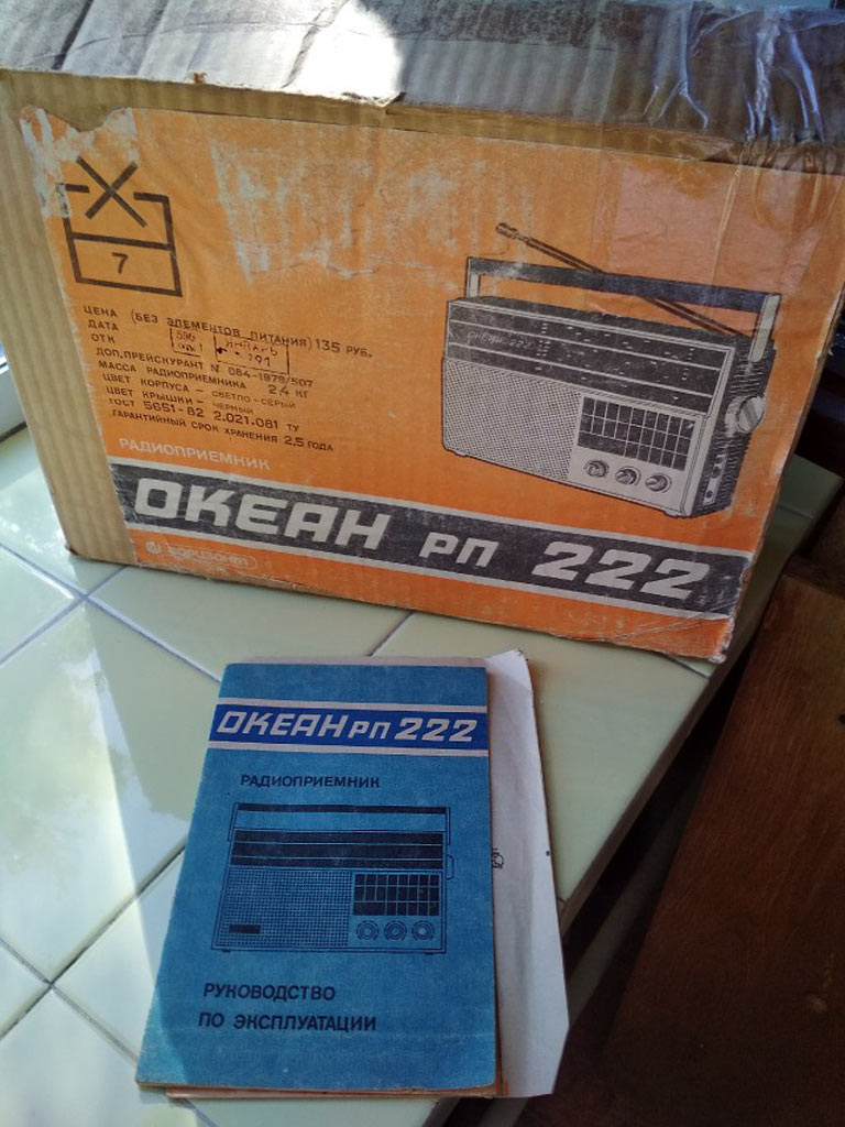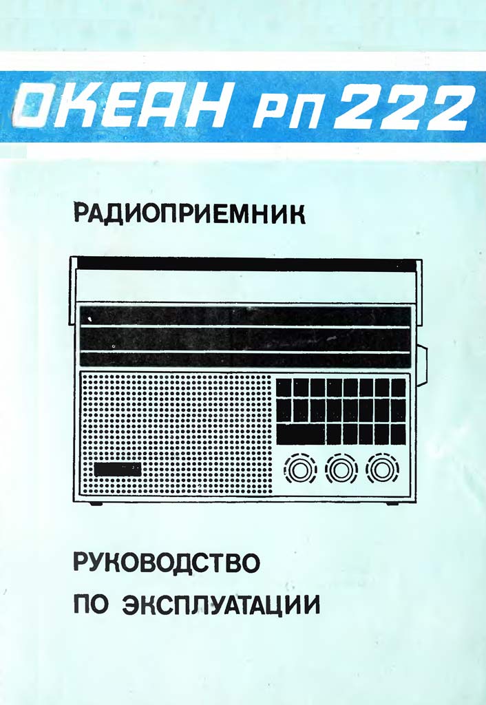 Портативный радиоприёмник *Океан РП-222* с 1987 года выпускал Гродненский завод *Радиоприбор*. **Океан РП-222** - радиоприёмник 2 группы сложности, предназначенный для приёма программ радиовещательных станций в диапазонах: ДВ, СВ (2 поддиапазона), КВ (4 поддиапазона) и в диапазоне УКВ-ЧМ. Радиоприёмник имеет электронные настройку и переключение диапазонов, четыре фиксированные настройки в УКВ-ЧМ диапазоне. Питание универсальное: от 6 элементов 343, общим напряжением 9 В, бортовой сети автомобиля или от сети переменного тока 220 В. Габариты радиоприёмника 318 х 192 х 78 мм. Масса без источников питания 2,4 кг, Цена 135 рублей. Радиоприёмник разработан ещё в 1985 году по прежним требованиям ГОСТа, поэтому наименование модели на передней панели указано без буквенного сочетания РП и обозначено как *Океан-222*. На задней крышке радиоприёмника сочетание РП было добавлено мелким шрифтом уже перед самым выпуском радиоприёмника.