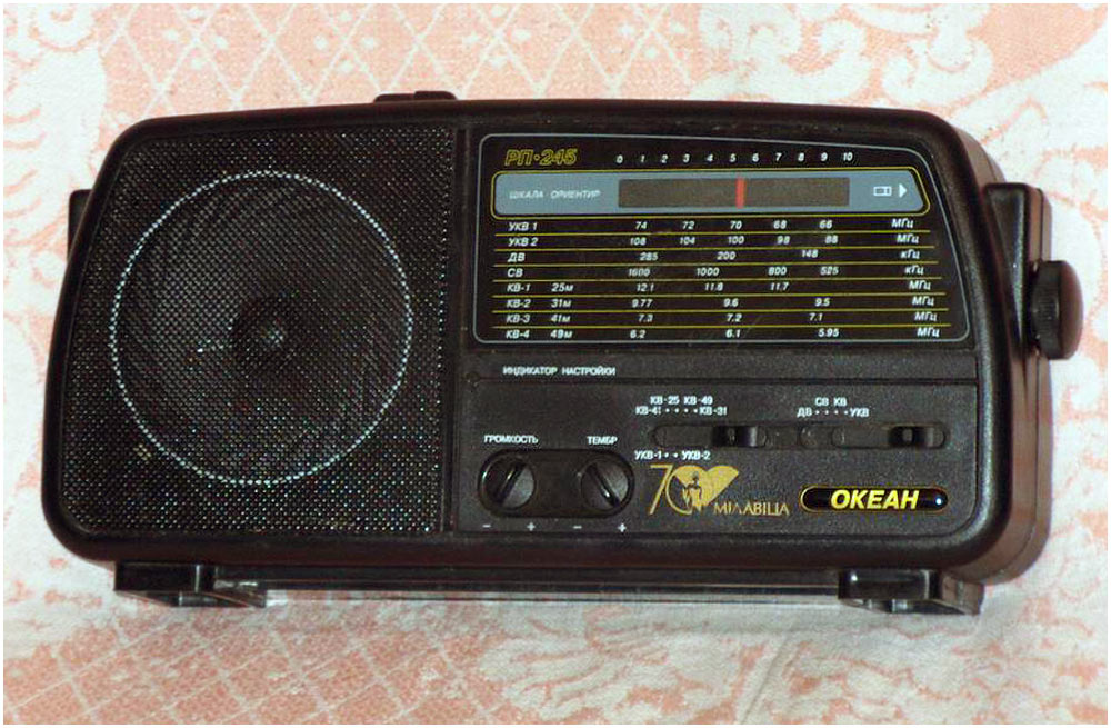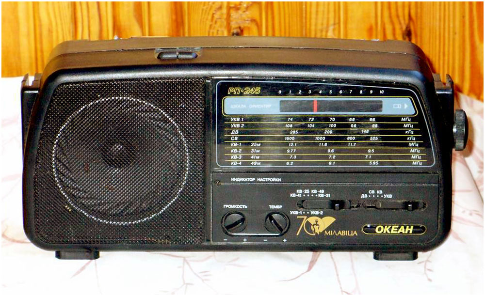 Портативный радиоприёмник *Океан РП-245* с 1999 года выпускало ОАО *Горизонт*. Приёмник осуществляет приём в диапазонах: ДВ, СВ, КВ (4 поддиапазона) и УКВ-ЧМ и FM диапазонах. Питание осуществляется от сети переменного тока или от 4-х элементов А-343. Диапазоны ДВ, СВ, КВ-1 5,95...6,2, КВ-2 7,1...7,3, КВ-3 9,5...9,77, КВ-4 11,7...12,1, УКВ-1 65,8...74, УКВ-2 87,5...108 МГц. Чувствительность в ДВ 2, СВ 1 мВ/м, КВ 200 мкВ, УКВ-1,2 70 мкВ. Селективность в АМ диапазонах 30 дБ. Максимальная выходная мощность при питании от батарей 0,25 Вт, от сети 0,35 Вт. Диапазон воспроизводимых частот тракта АМ 250...3500, ЧМ 250...8000 Гц. В приёмнике имеется тембр ВЧ, индикатор настройки, подсветка шкалы, гнездо для телефона. Габариты приёмника 290х143х75 мм, масса 1,2 кг.